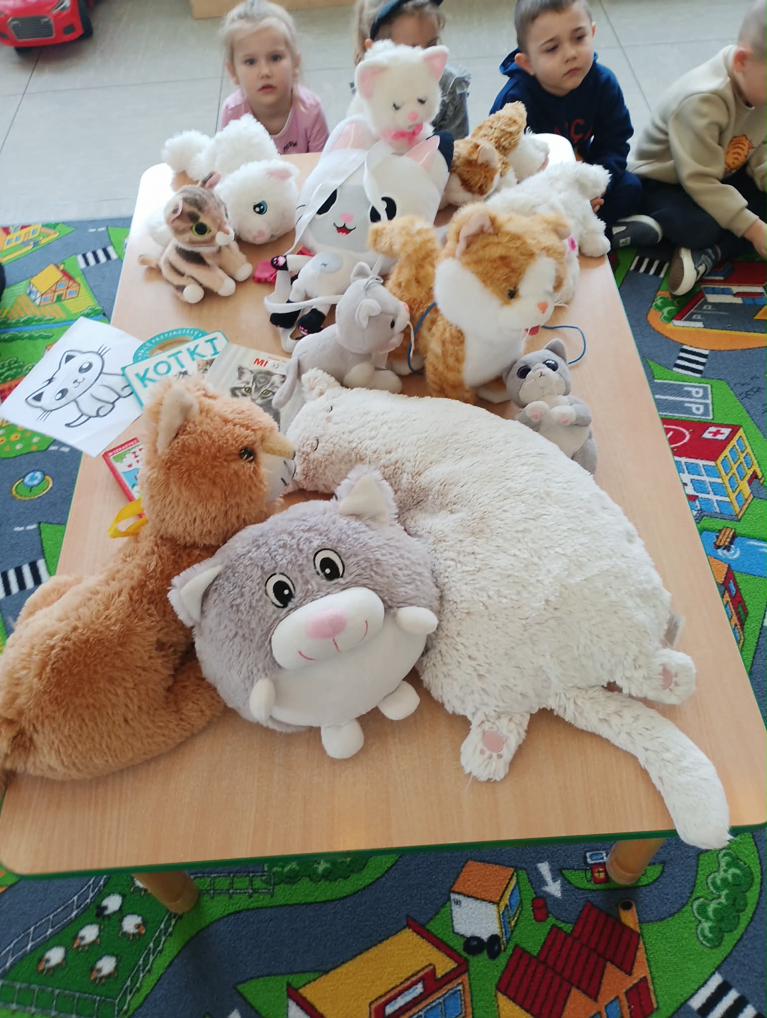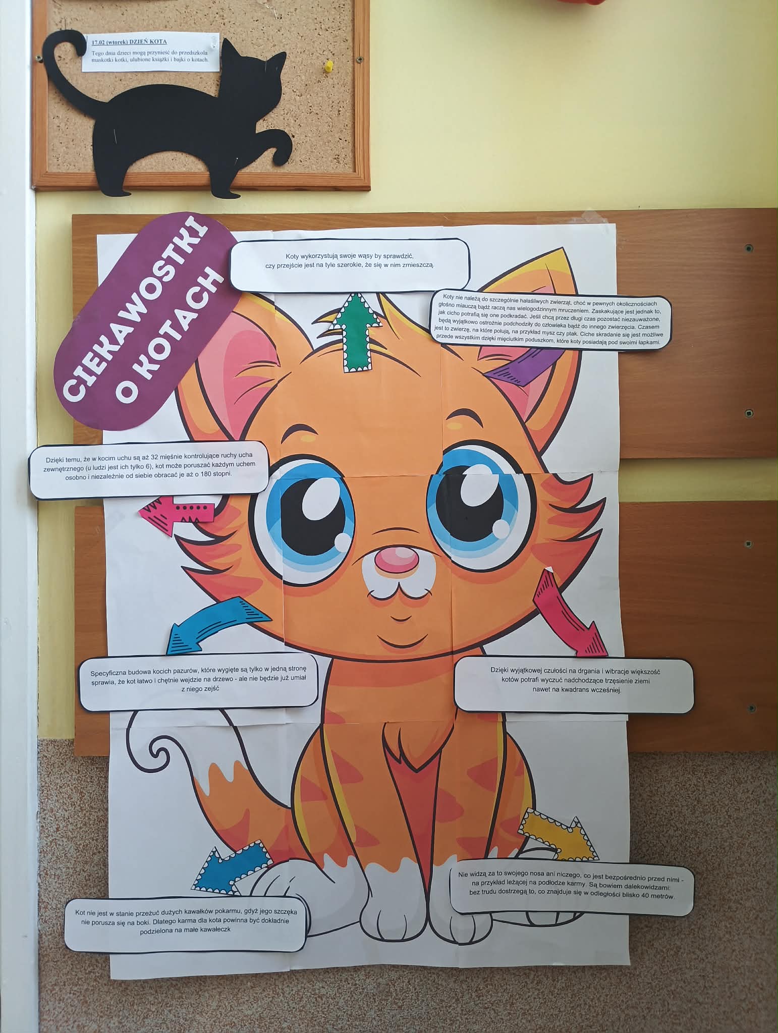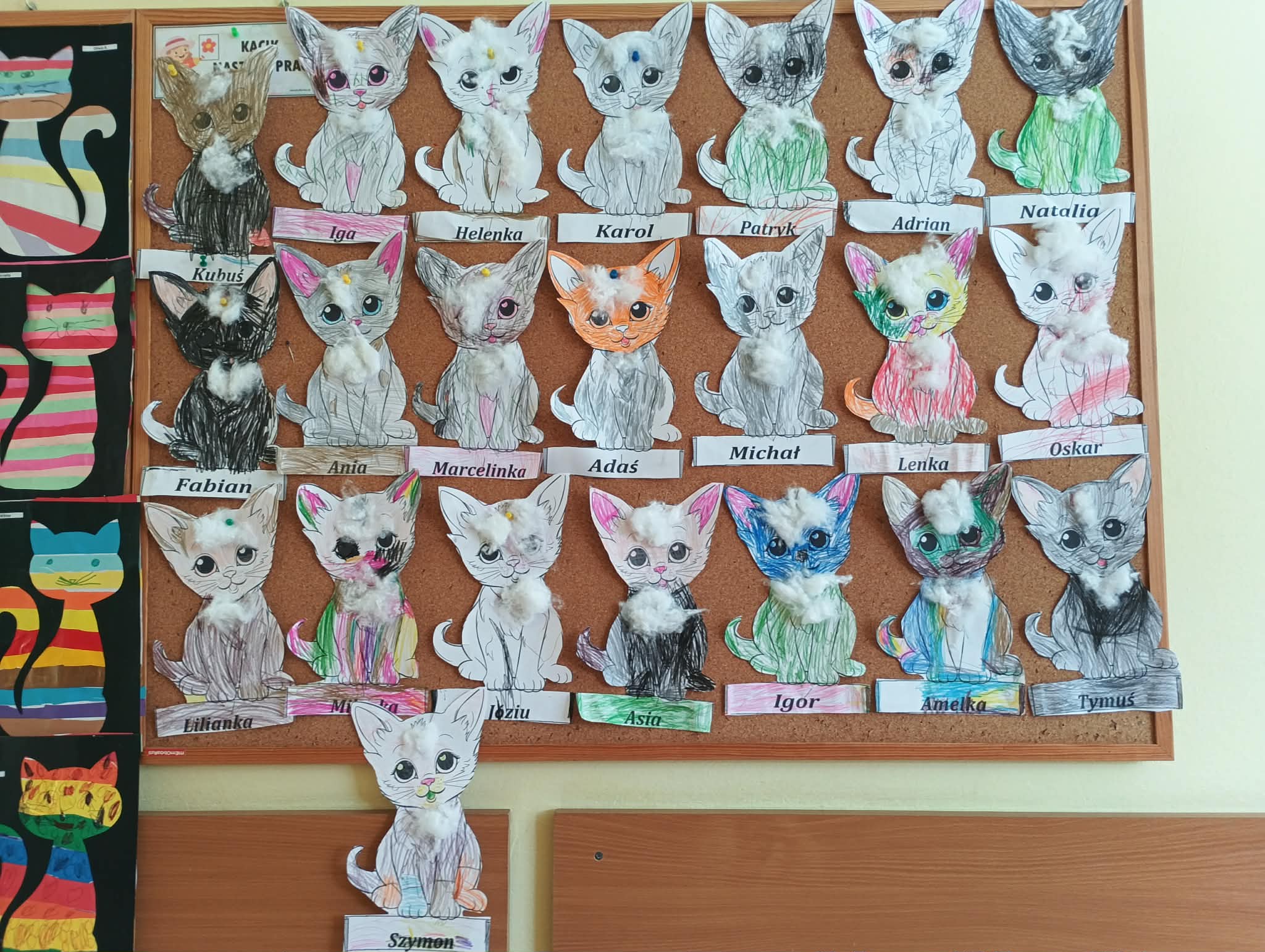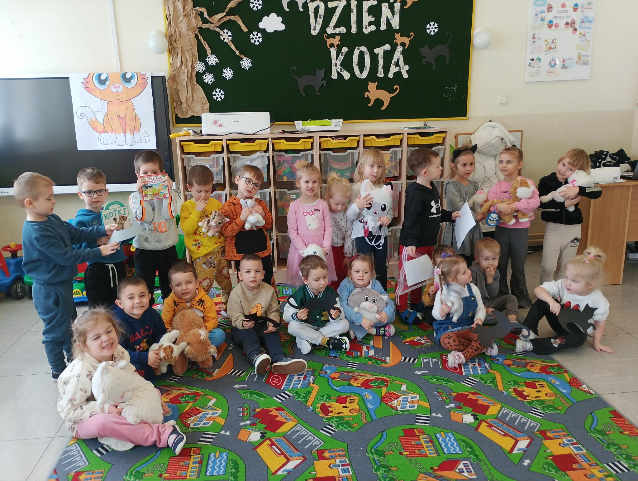 W tym dniu niektóre dzieci przyniosły swoje kotki maskotki. Oprócz zabaw muzyczno-ruchowych do piosenek o kotach, kociej gimnastyki, przedszkolaki obejrzały także film edukacyjny o kotach, podczas którego poznały kocie zwyczaje, ciekawostki oraz najbardziej znane rasy kotów. Dzieci swoją wiedzę uporządkowały podczas wykonania plakatu związanego z kocimi zwyczajami. Każda grupa tworzyła piękne prace plastyczne, gdzie głównym bohaterem był oczywiście kot – ulubieniec wszystkich dzieci.