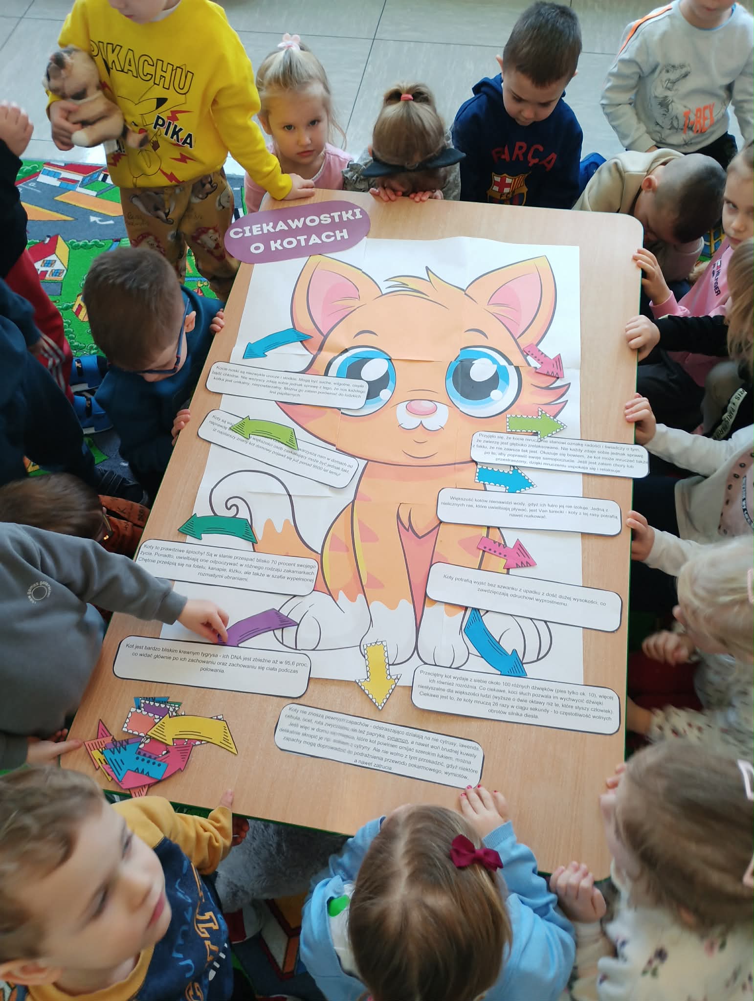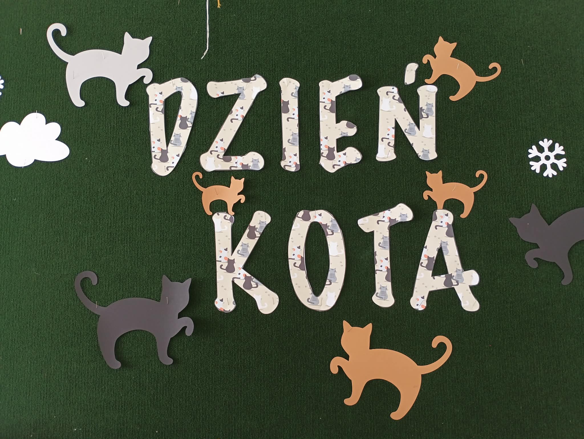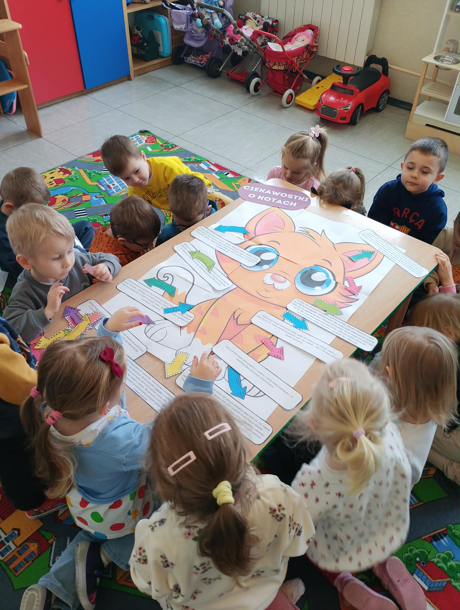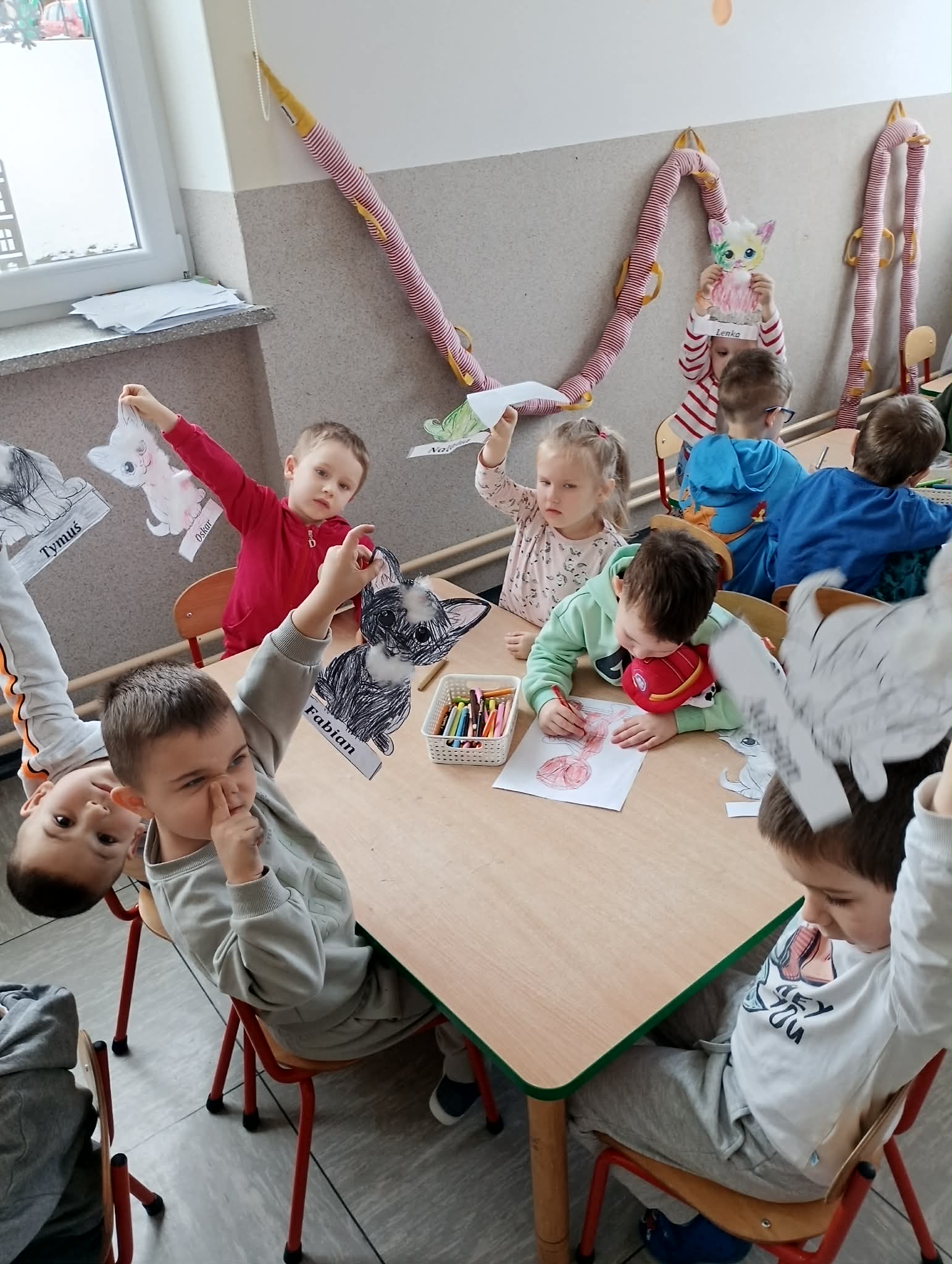 W tym dniu niektóre dzieci przyniosły swoje kotki maskotki. Oprócz zabaw muzyczno-ruchowych do piosenek o kotach, kociej gimnastyki, przedszkolaki obejrzały także film edukacyjny o kotach, podczas którego poznały kocie zwyczaje, ciekawostki oraz najbardziej znane rasy kotów. Dzieci swoją wiedzę uporządkowały podczas wykonania plakatu związanego z kocimi zwyczajami. Każda grupa tworzyła piękne prace plastyczne, gdzie głównym bohaterem był oczywiście kot – ulubieniec wszystkich dzieci.