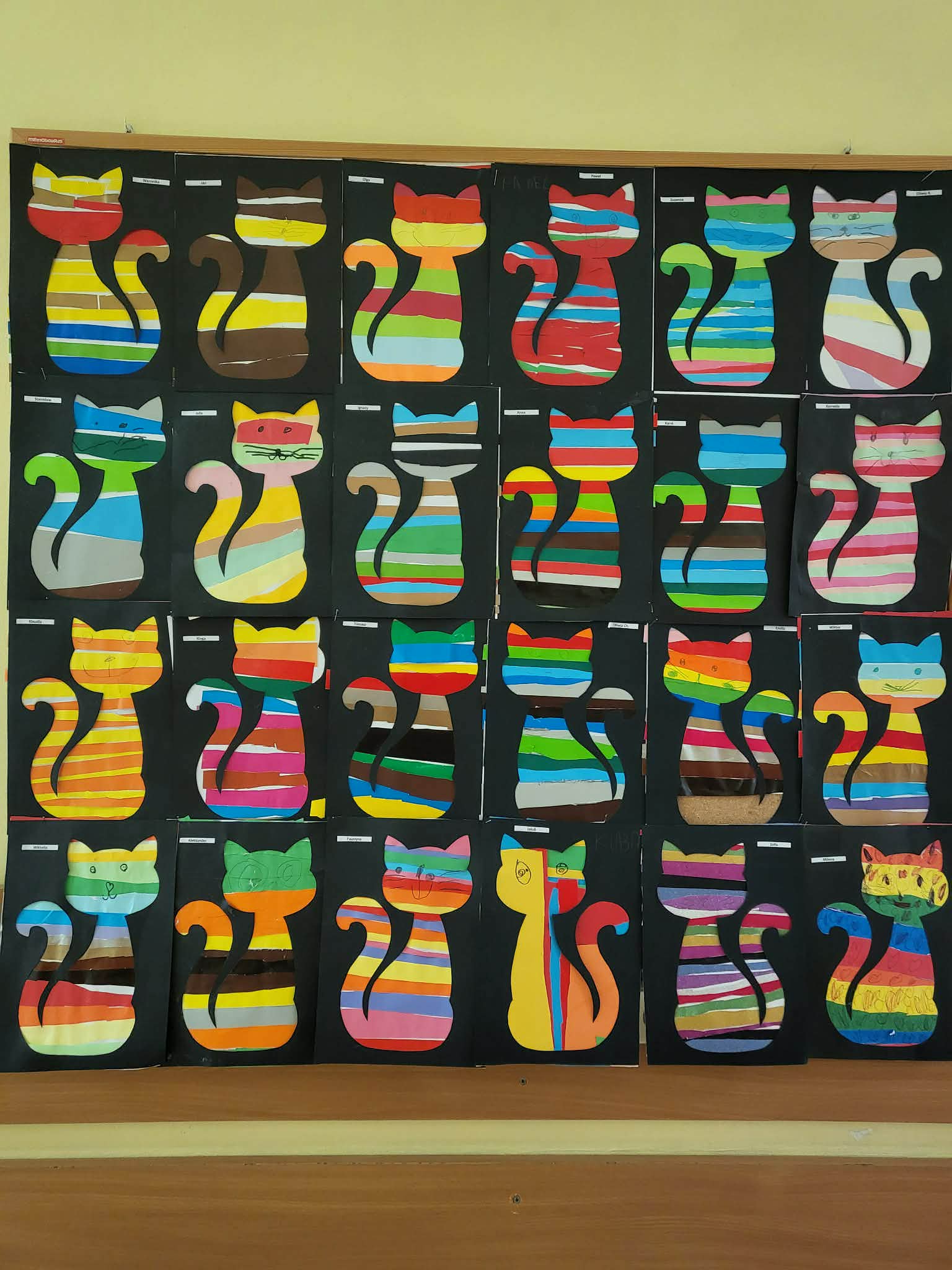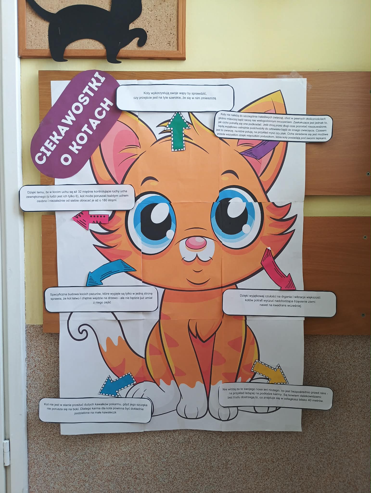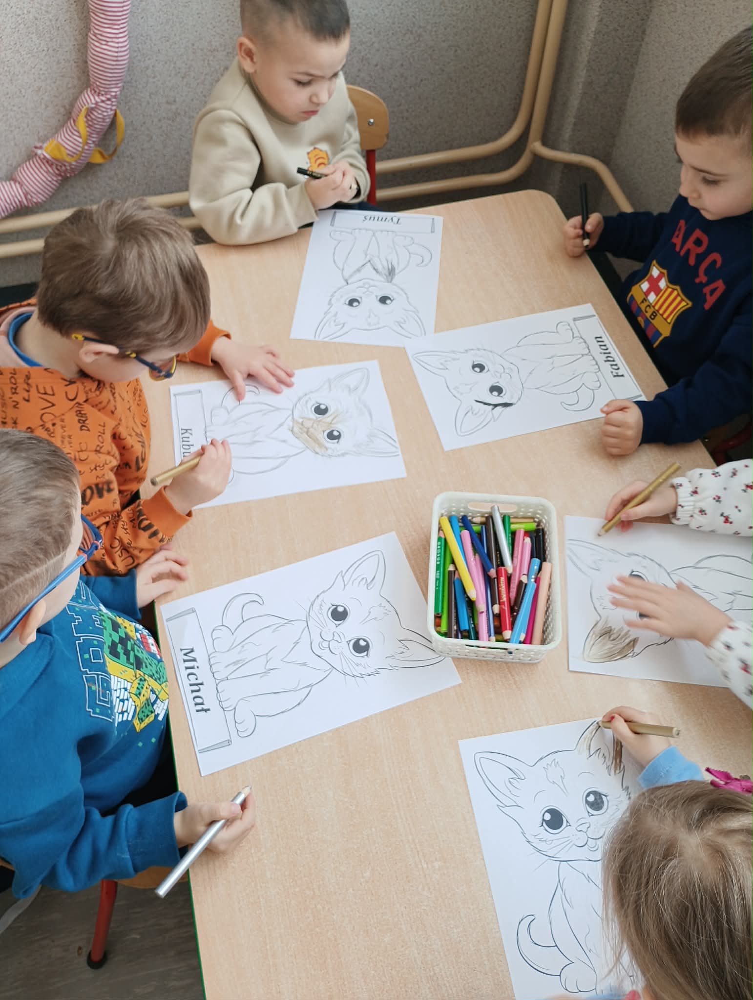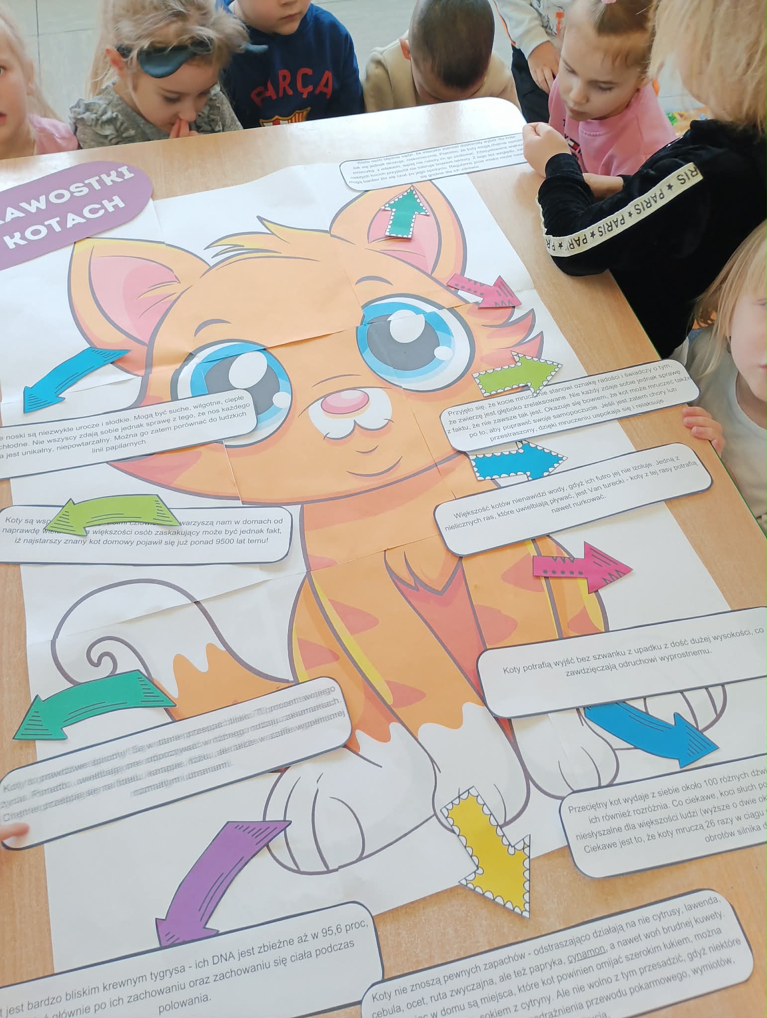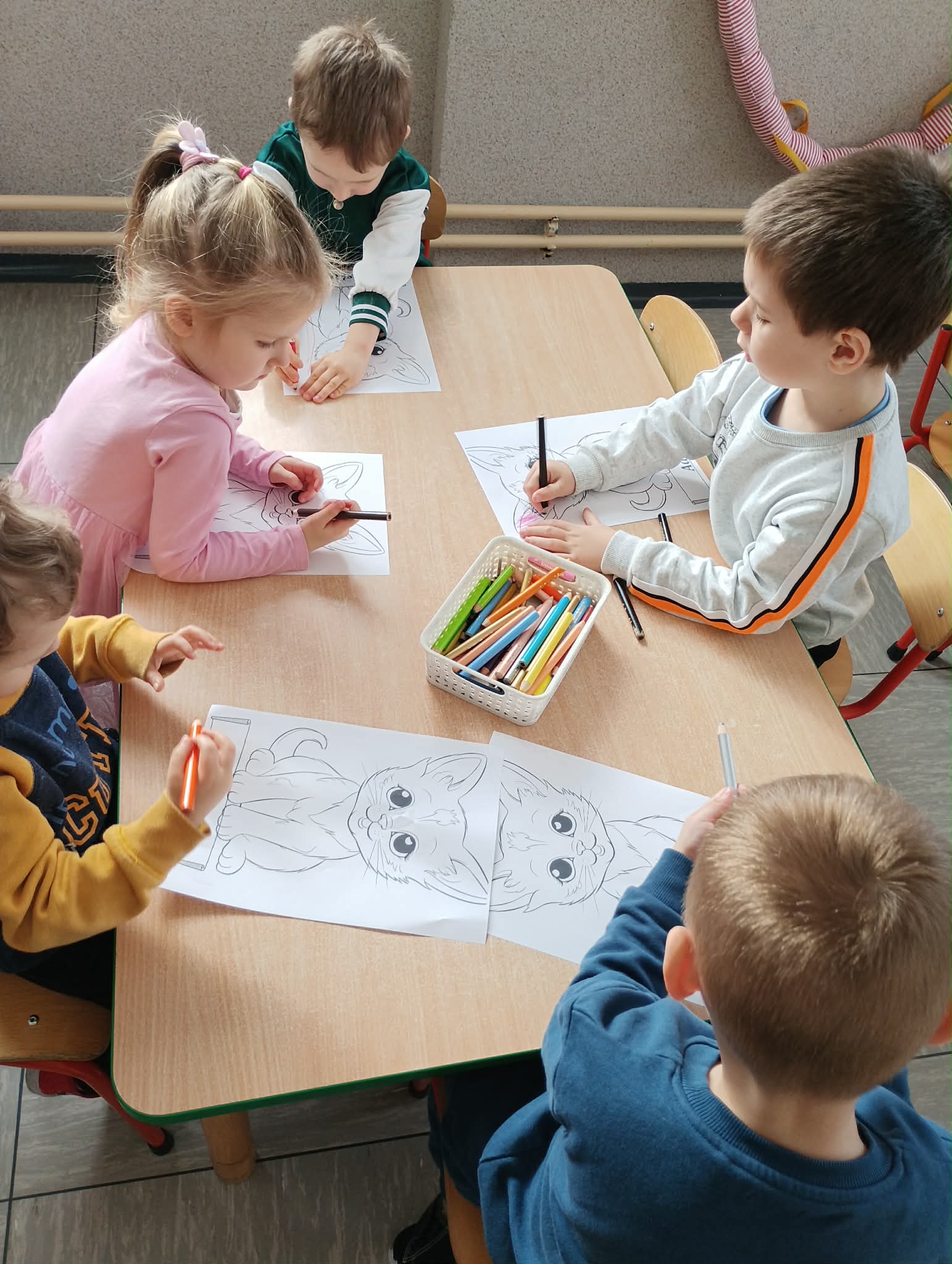 W tym dniu niektóre dzieci przyniosły swoje kotki maskotki. Oprócz zabaw muzyczno-ruchowych do piosenek o kotach, kociej gimnastyki, przedszkolaki obejrzały także film edukacyjny o kotach, podczas którego poznały kocie zwyczaje, ciekawostki oraz najbardziej znane rasy kotów. Dzieci swoją wiedzę uporządkowały podczas wykonania plakatu związanego z kocimi zwyczajami. Każda grupa tworzyła piękne prace plastyczne, gdzie głównym bohaterem był oczywiście kot – ulubieniec wszystkich dzieci.