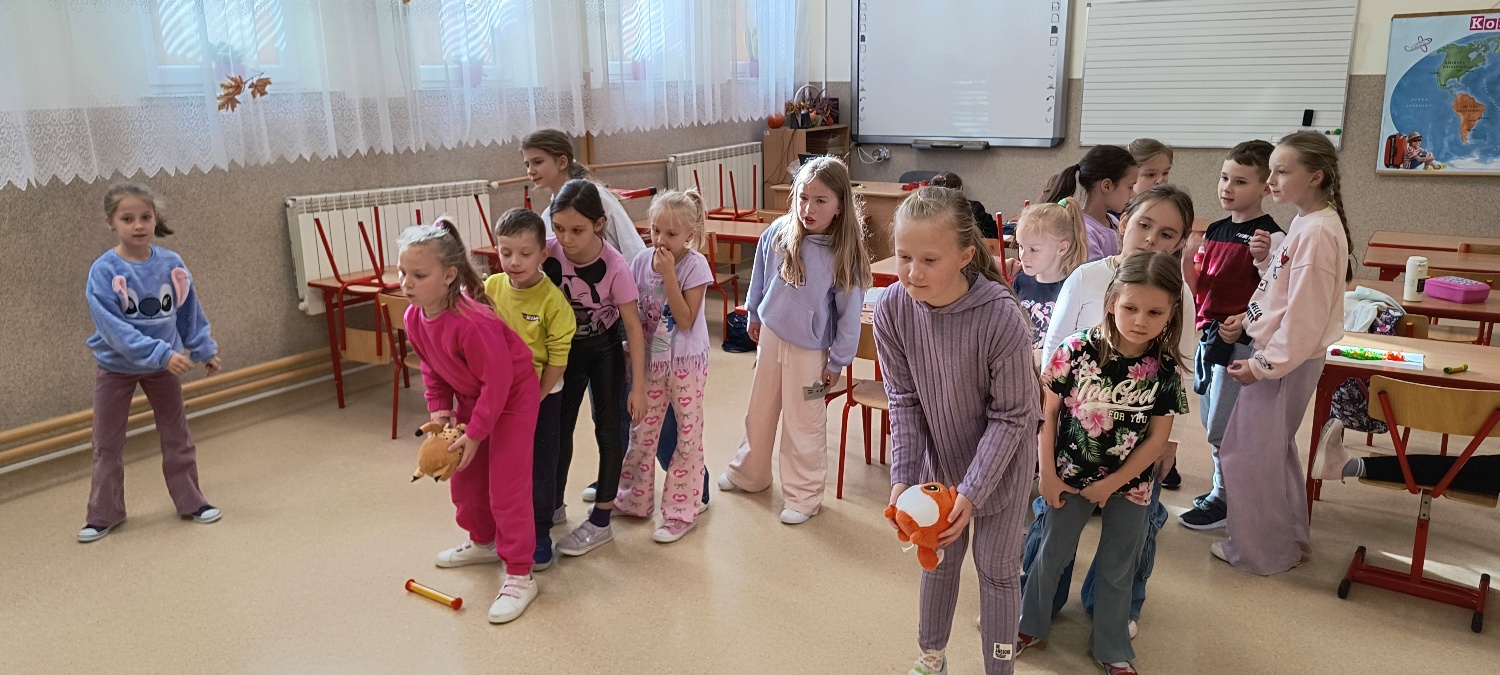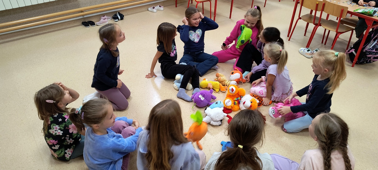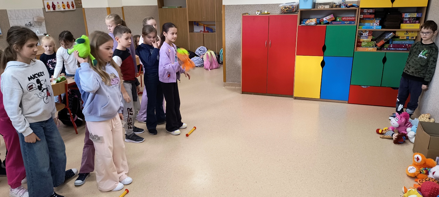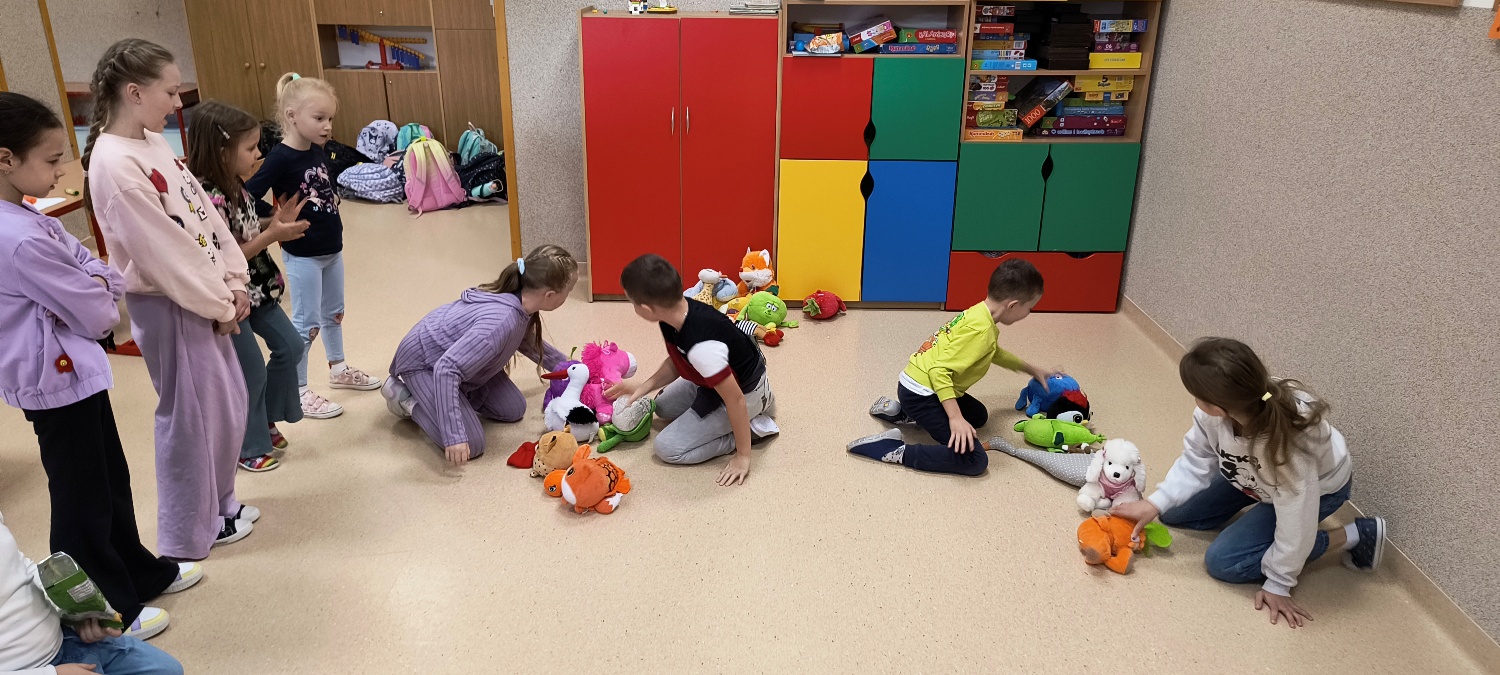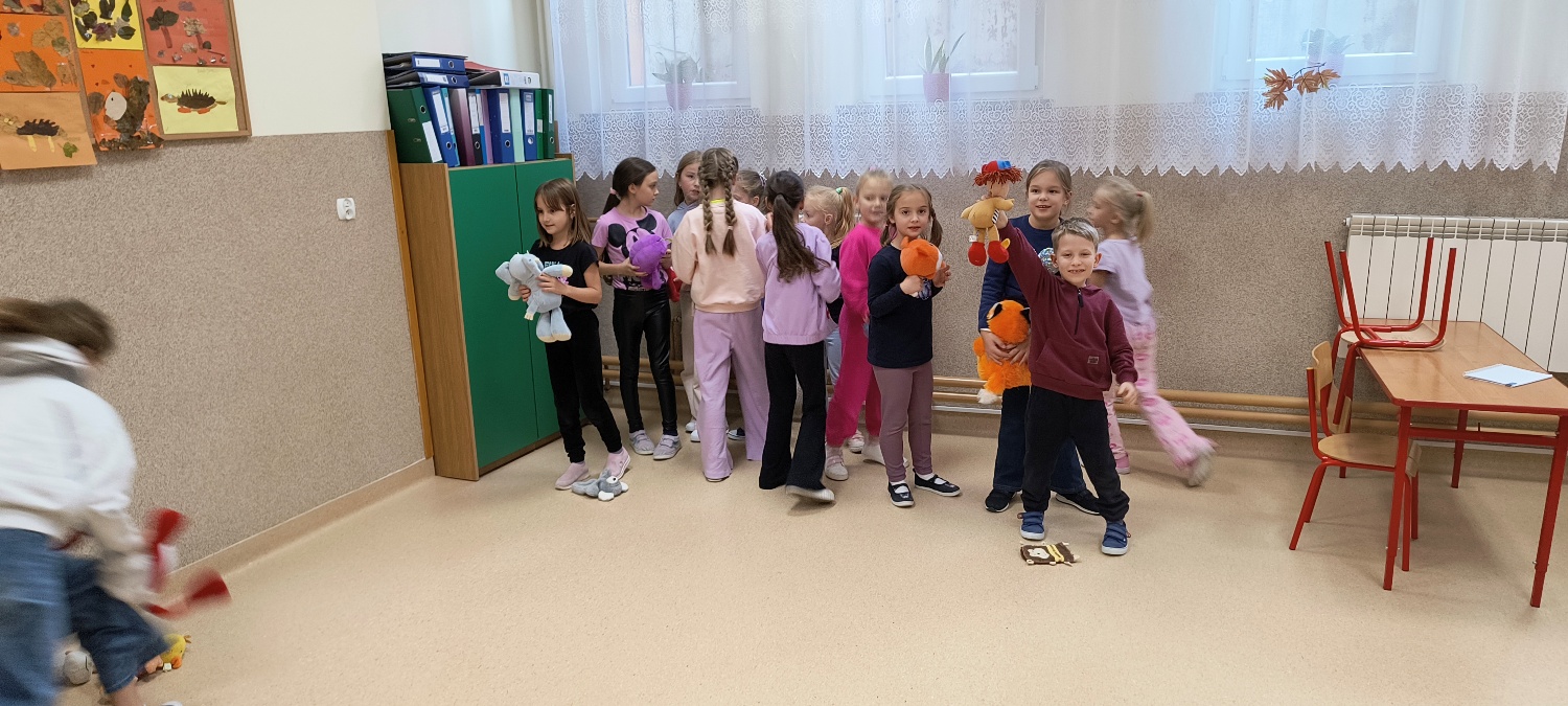 We wtorek 28 października na świetlicy szkolnej obchodziliśmy Dzień Miłośników Pluszaków - było aktywnie, kolorowo i zabawnie, a to za sprawą dużej ilości maskotek. Na początku zadaniem uczniów było odszukanie ukrytych pluszaków w sali. Po ich przeliczeniu, każdy opowiedział o swojej ulubionej maskotce. Następnie przystąpilliśmy do działania - były wyścigi maskotek, rzuty do celu, zabawa zręcznościowa z kasztanami, wyścigi na jednej nodze oraz zabawy ruchowe przy muzyce. Dużym wyzwaniem okazało się podawanie pluszaków za pomocą różnych części ciała oraz zgadywanie, których pluszaków brakuje w zestawie. Każdy jednak wspaniale sobie poradził z tymi zadaniami. Po skończonych zajęciach, uczniowie mogli zabrać ze sobą pluszaka i dołączyć go do grona „domowych przytulanek”.