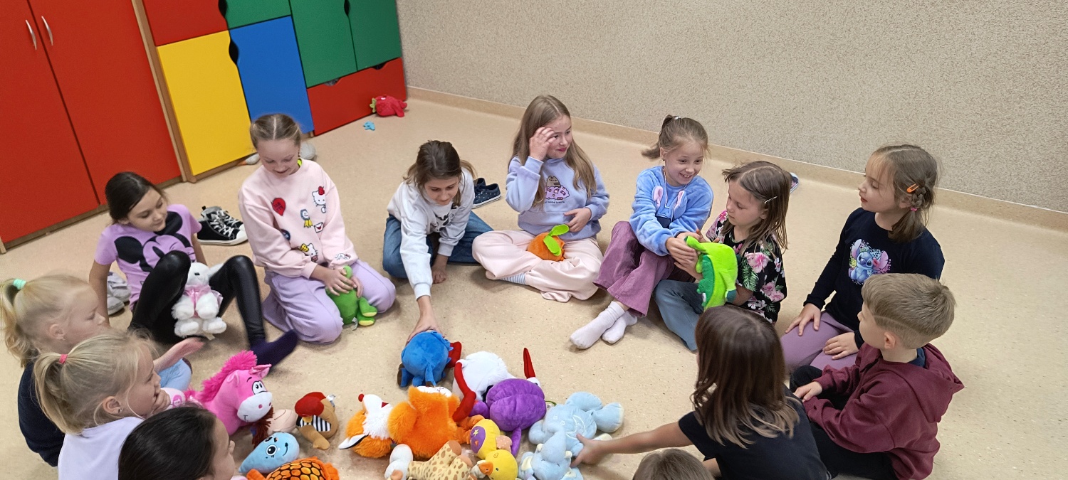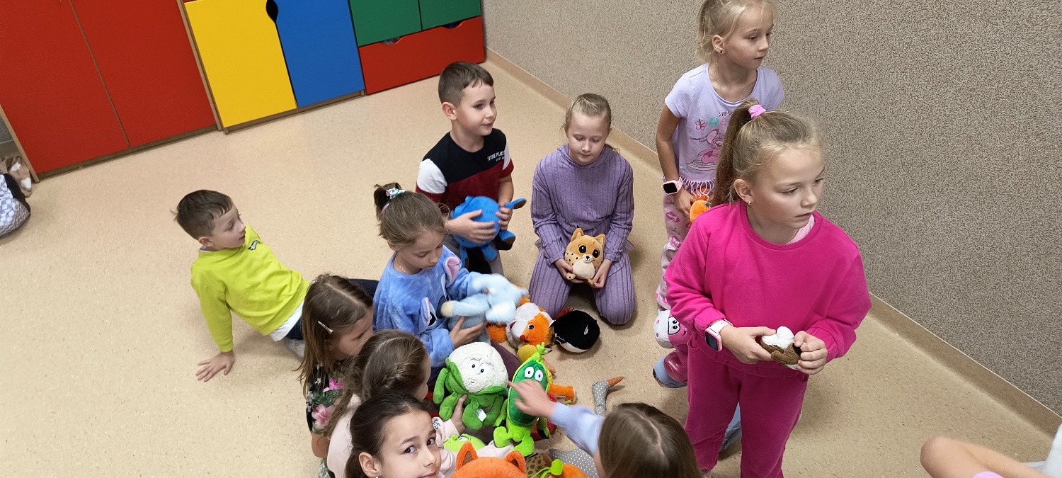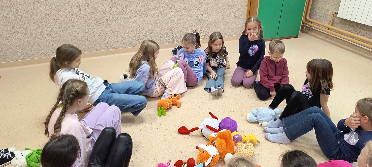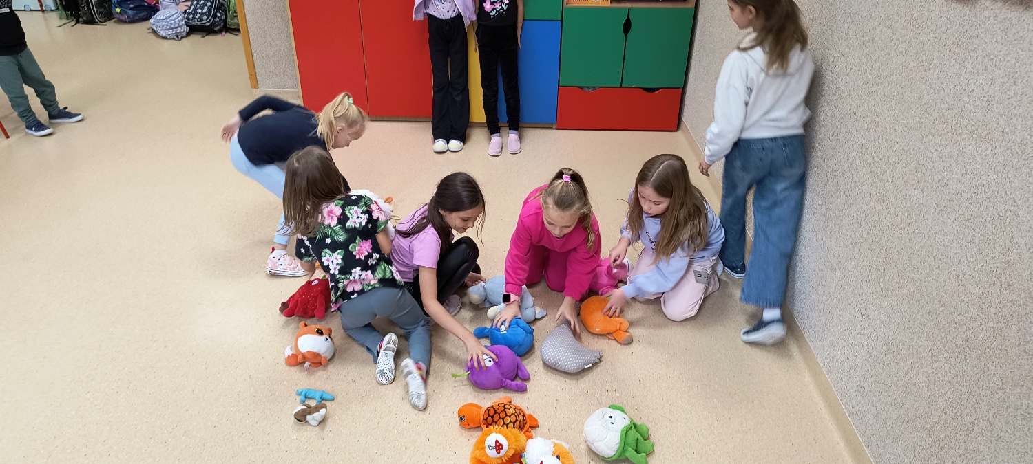 We wtorek 28 października na świetlicy szkolnej obchodziliśmy Dzień Miłośników Pluszaków - było aktywnie, kolorowo i zabawnie, a to za sprawą dużej ilości maskotek. Na początku zadaniem uczniów było odszukanie ukrytych pluszaków w sali. Po ich przeliczeniu, każdy opowiedział o swojej ulubionej maskotce. Następnie przystąpilliśmy do działania - były wyścigi maskotek, rzuty do celu, zabawa zręcznościowa z kasztanami, wyścigi na jednej nodze oraz zabawy ruchowe przy muzyce. Dużym wyzwaniem okazało się podawanie pluszaków za pomocą różnych części ciała oraz zgadywanie, których pluszaków brakuje w zestawie. Każdy jednak wspaniale sobie poradził z tymi zadaniami. Po skończonych zajęciach, uczniowie mogli zabrać ze sobą pluszaka i dołączyć go do grona „domowych przytulanek”.