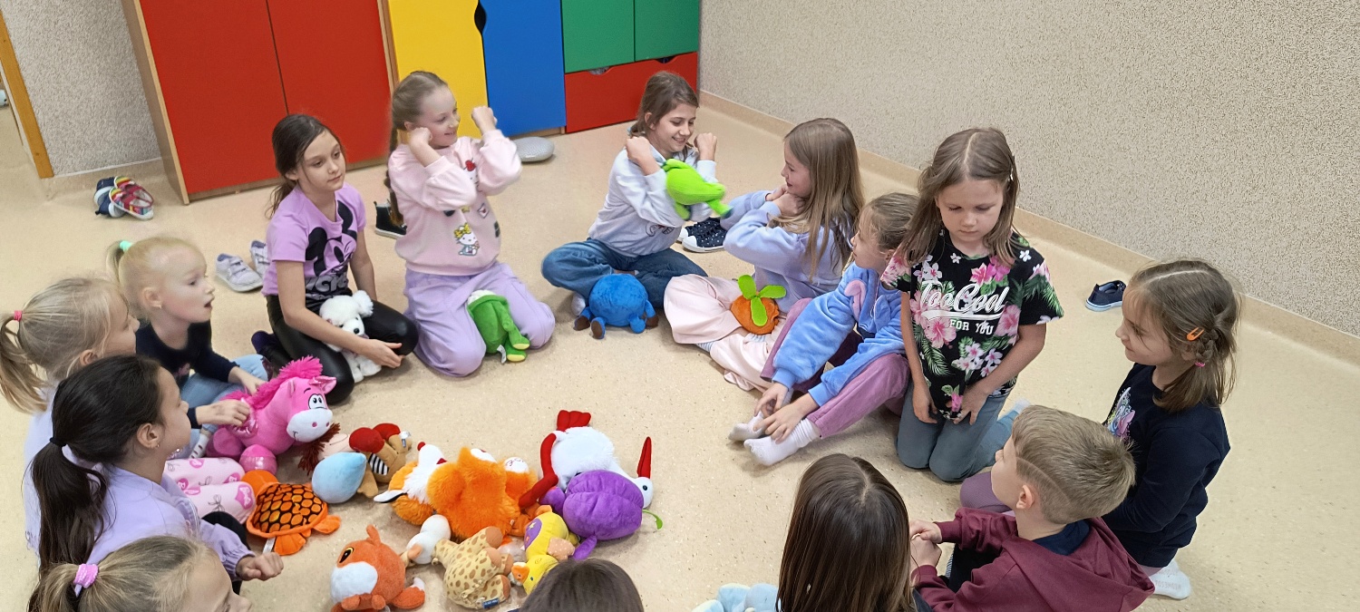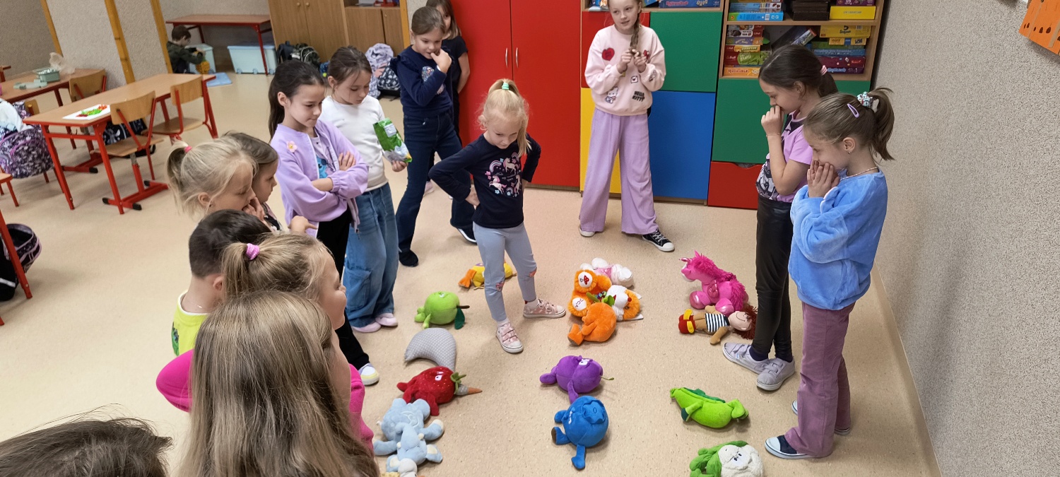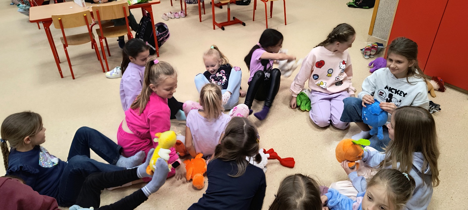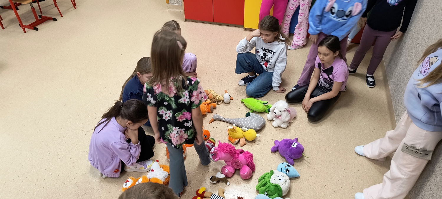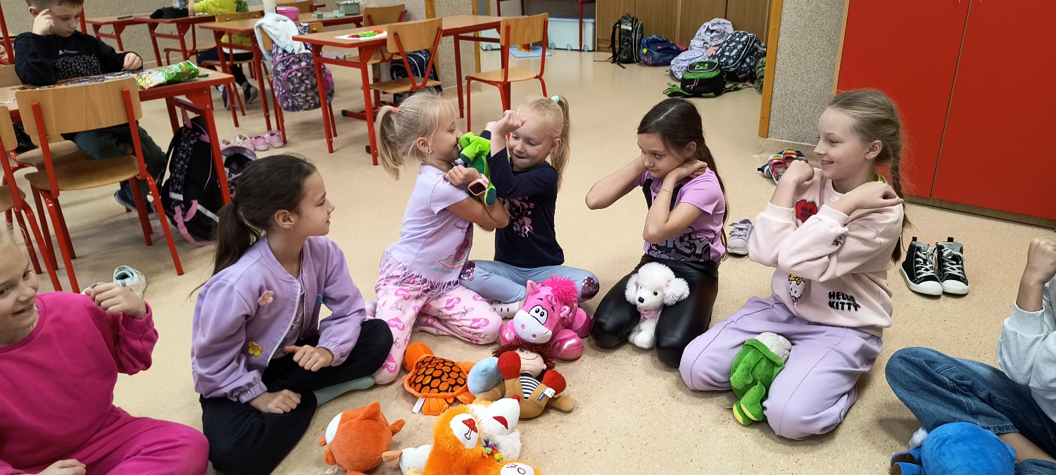 We wtorek 28 października na świetlicy szkolnej obchodziliśmy Dzień Miłośników Pluszaków - było aktywnie, kolorowo i zabawnie, a to za sprawą dużej ilości maskotek. Na początku zadaniem uczniów było odszukanie ukrytych pluszaków w sali. Po ich przeliczeniu, każdy opowiedział o swojej ulubionej maskotce. Następnie przystąpilliśmy do działania - były wyścigi maskotek, rzuty do celu, zabawa zręcznościowa z kasztanami, wyścigi na jednej nodze oraz zabawy ruchowe przy muzyce. Dużym wyzwaniem okazało się podawanie pluszaków za pomocą różnych części ciała oraz zgadywanie, których pluszaków brakuje w zestawie. Każdy jednak wspaniale sobie poradził z tymi zadaniami. Po skończonych zajęciach, uczniowie mogli zabrać ze sobą pluszaka i dołączyć go do grona „domowych przytulanek”.