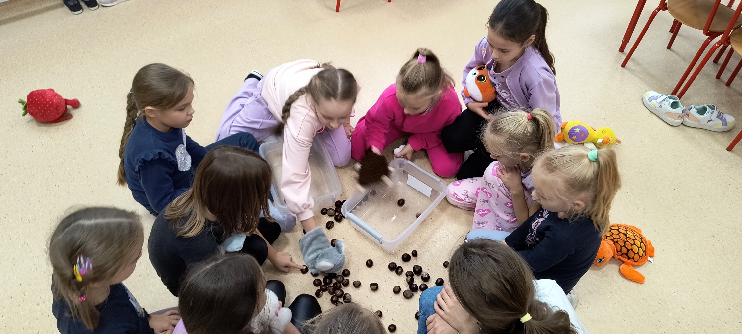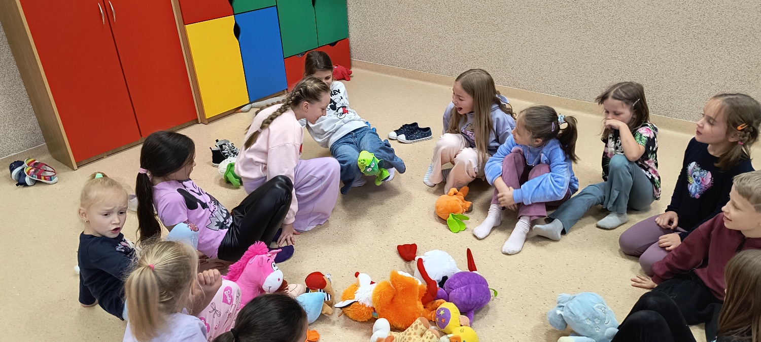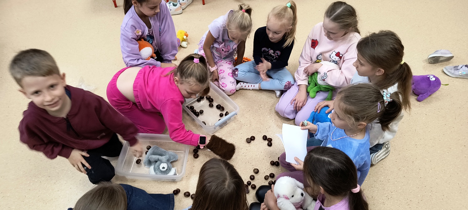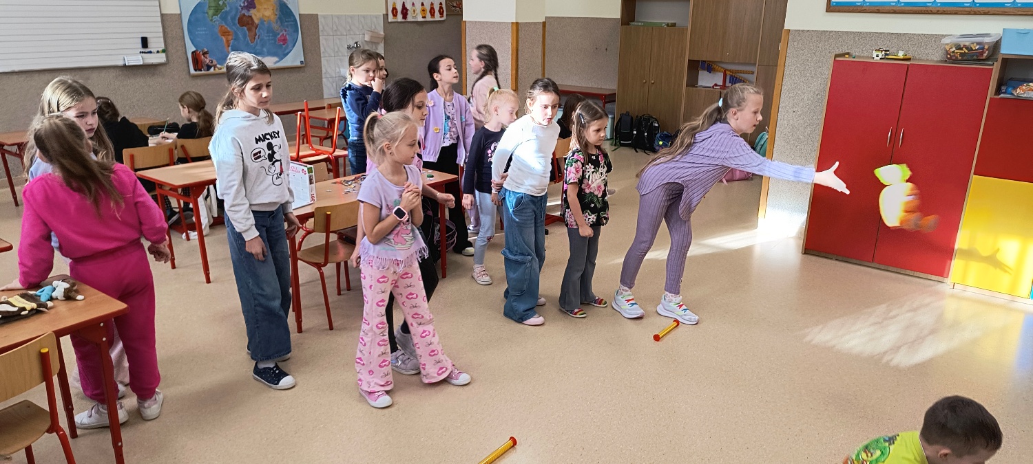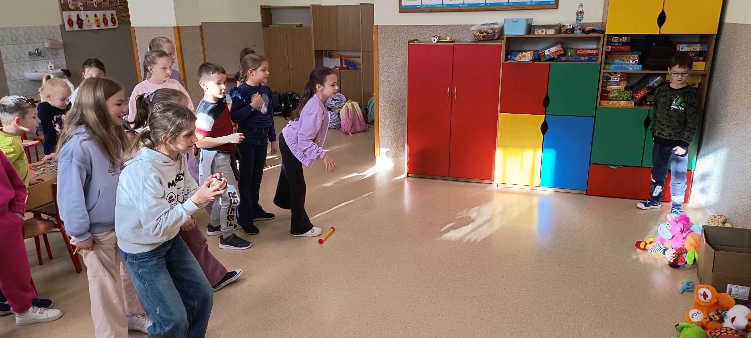 We wtorek 28 października na świetlicy szkolnej obchodziliśmy Dzień Miłośników Pluszaków - było aktywnie, kolorowo i zabawnie, a to za sprawą dużej ilości maskotek. Na początku zadaniem uczniów było odszukanie ukrytych pluszaków w sali. Po ich przeliczeniu, każdy opowiedział o swojej ulubionej maskotce. Następnie przystąpilliśmy do działania - były wyścigi maskotek, rzuty do celu, zabawa zręcznościowa z kasztanami, wyścigi na jednej nodze oraz zabawy ruchowe przy muzyce. Dużym wyzwaniem okazało się podawanie pluszaków za pomocą różnych części ciała oraz zgadywanie, których pluszaków brakuje w zestawie. Każdy jednak wspaniale sobie poradził z tymi zadaniami. Po skończonych zajęciach, uczniowie mogli zabrać ze sobą pluszaka i dołączyć go do grona „domowych przytulanek”.