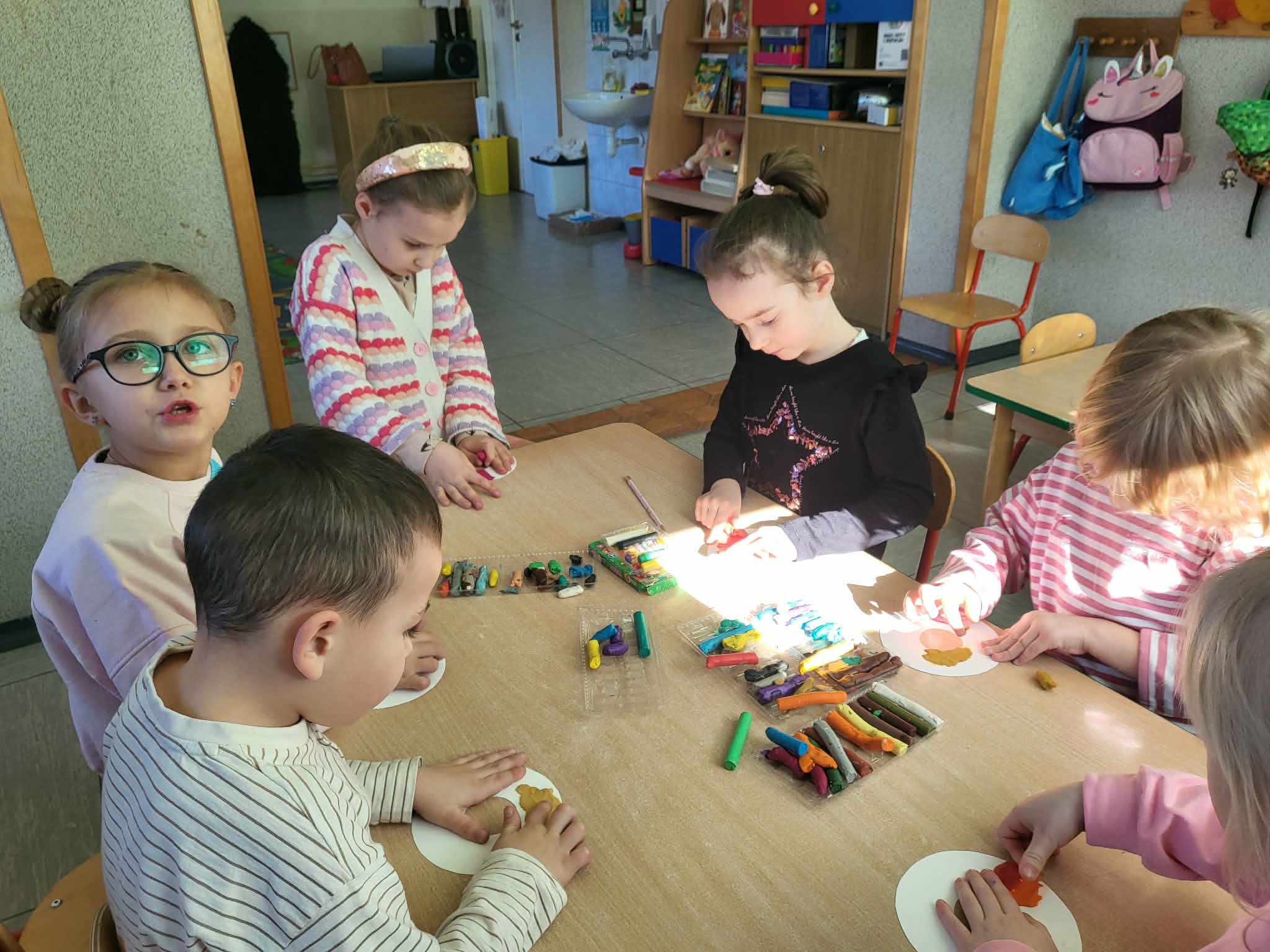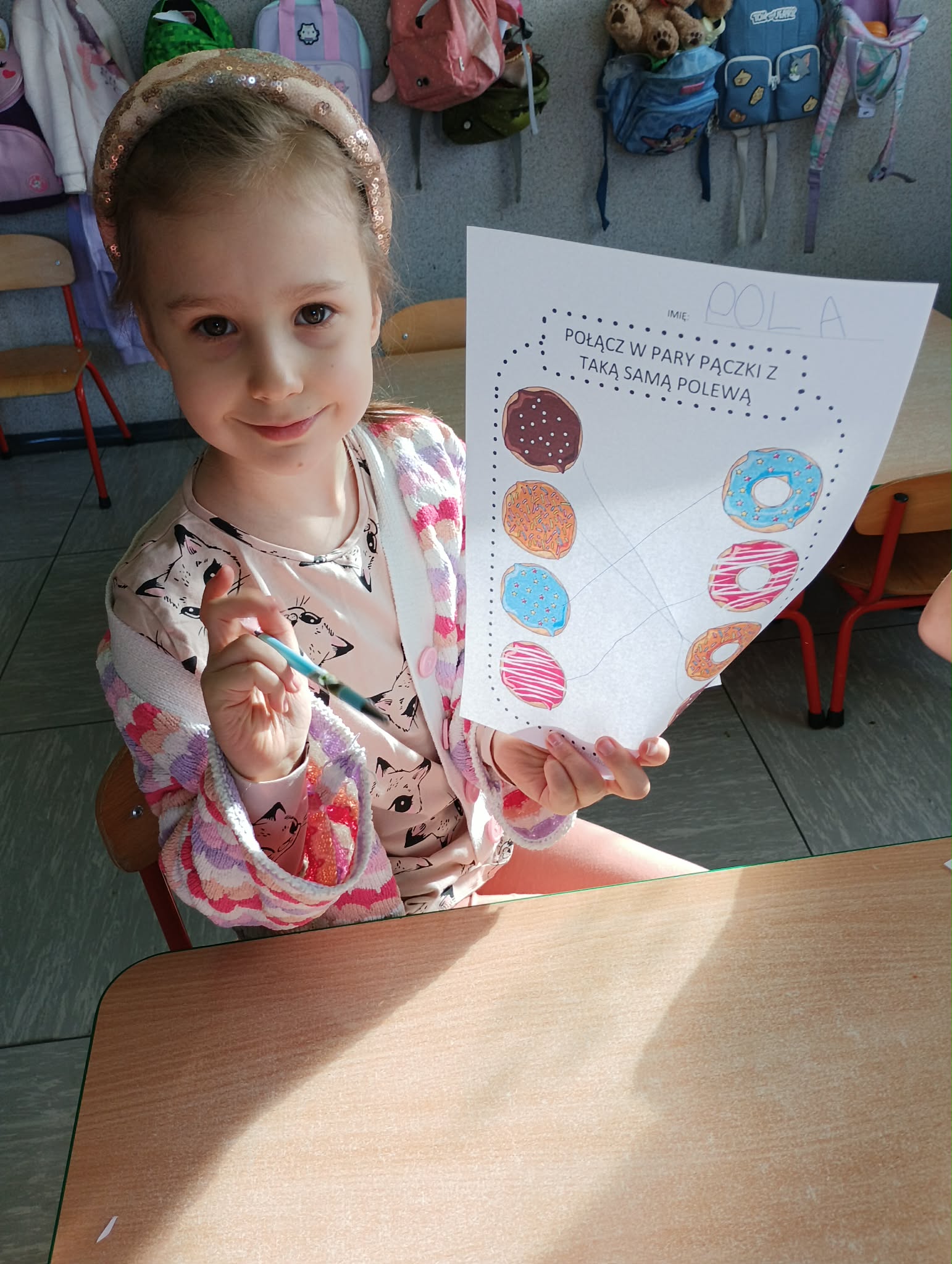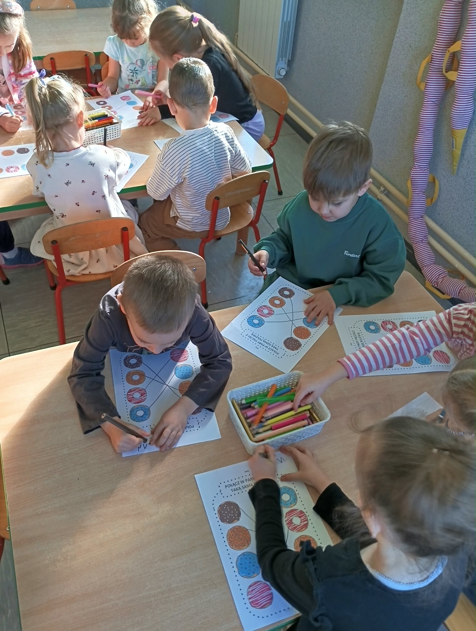 W tym dniu bawiliśmy się w różnorodne "pączkowe" zabawy: ruchowe, rytmiczne, matematyczne, ozdabialiśmy pączki według własnego pomysłu. Na zakończenie dnia, by odpocząć od słodkości wzięliśmy udział w przedstawieniu teatralnym pt.”Czerwony Kapturek”. Dzieci pięknie przedstawiały znaną bajkę przy pomocy wykonanych pacynek.