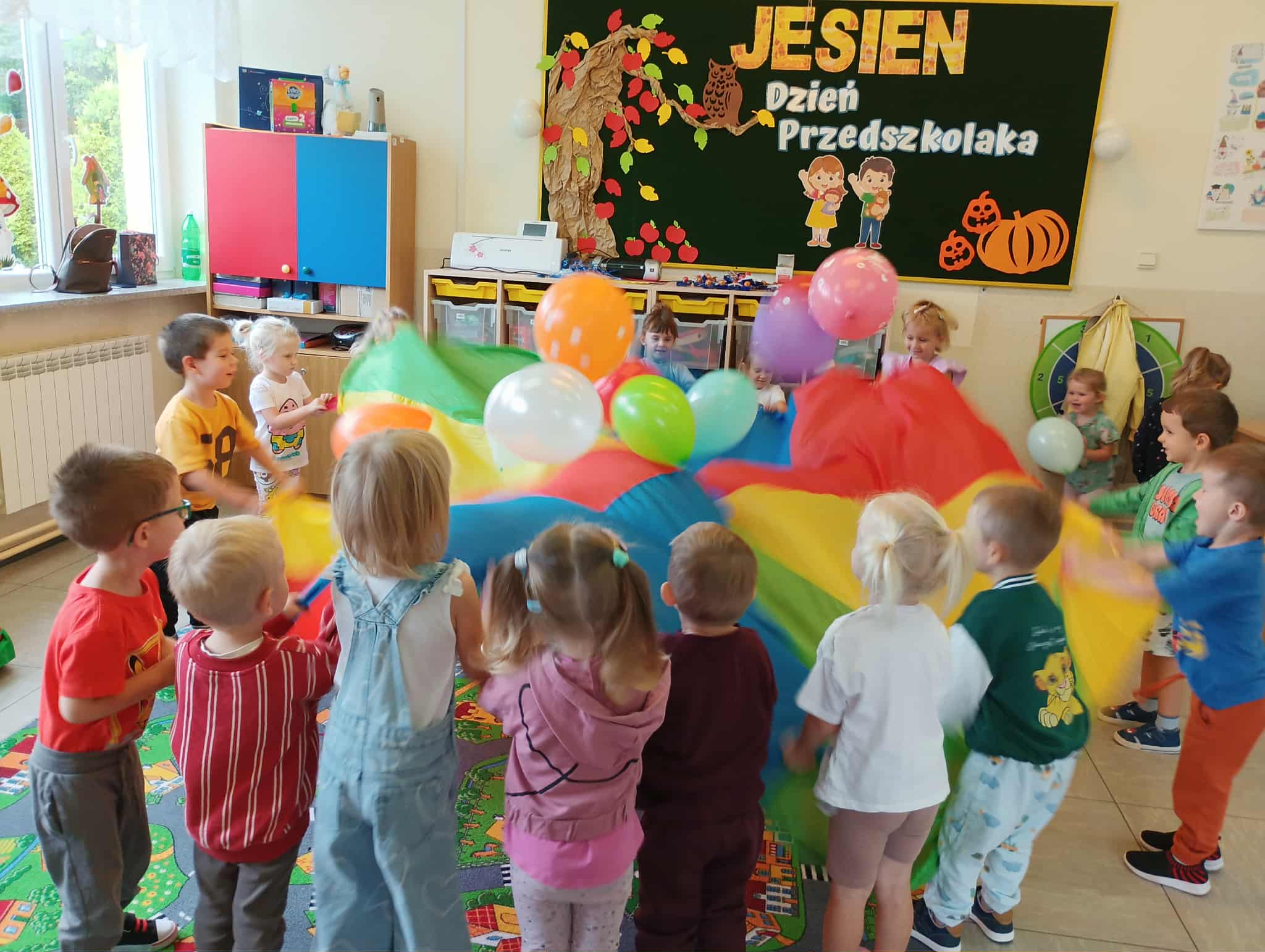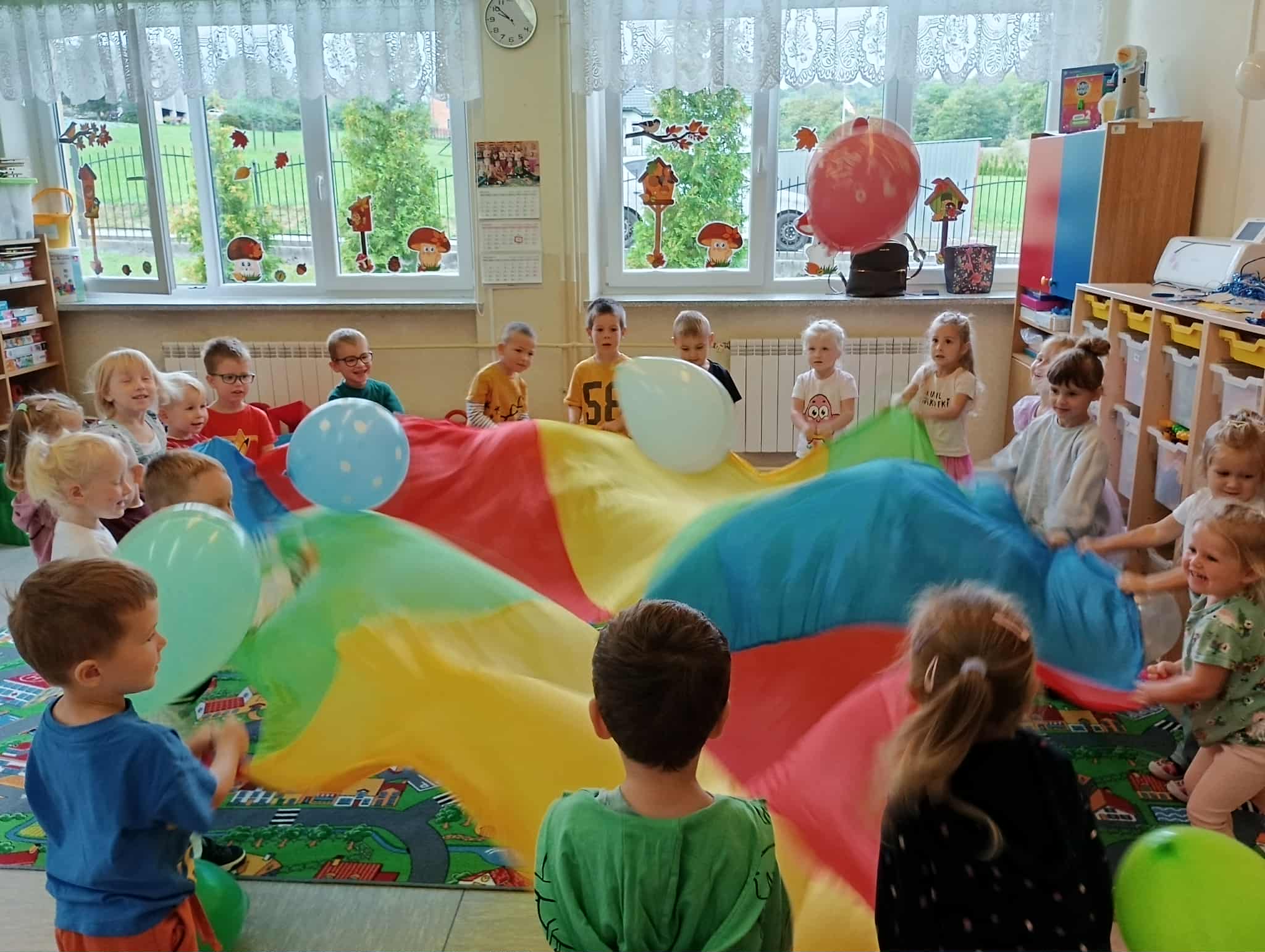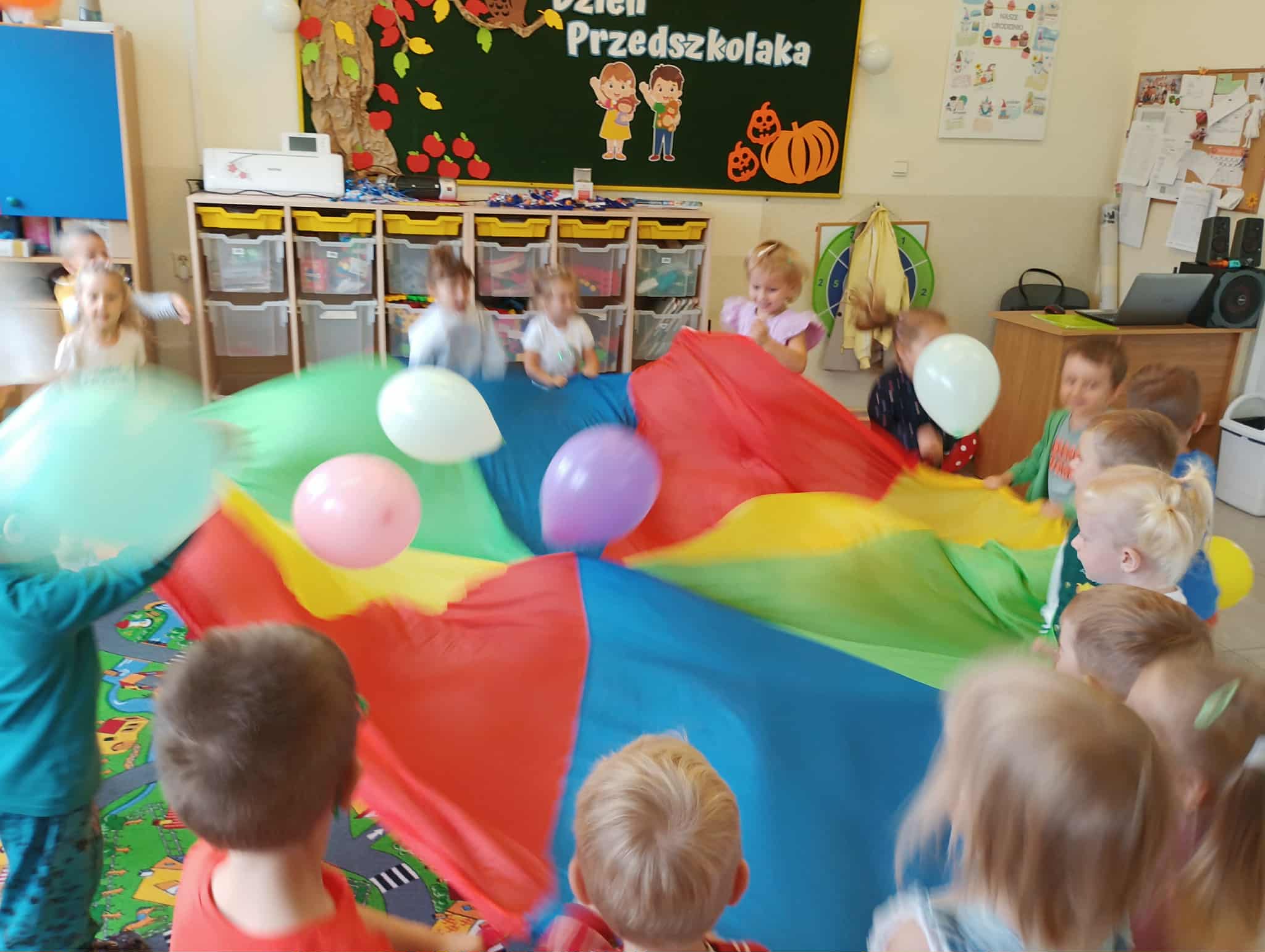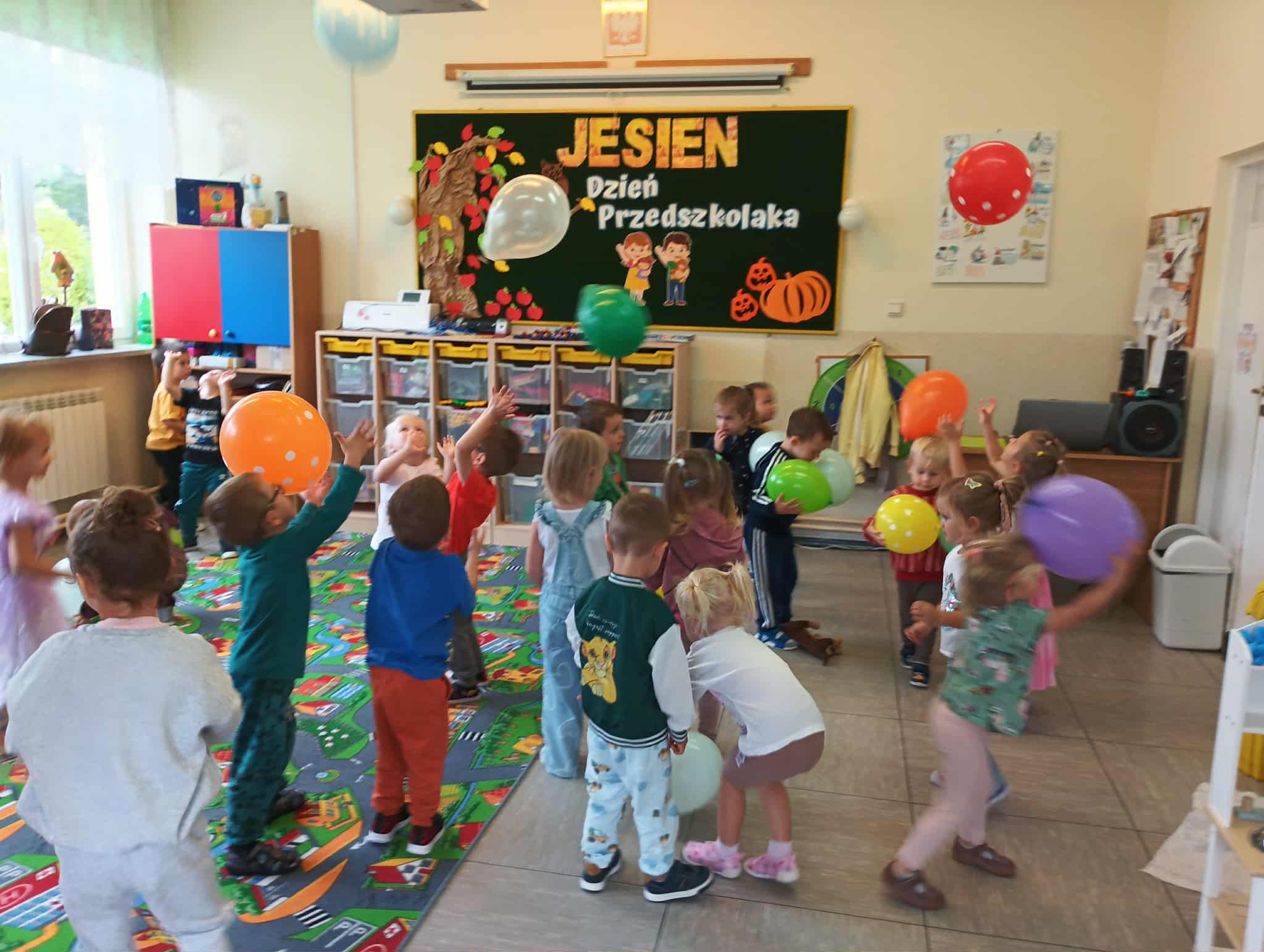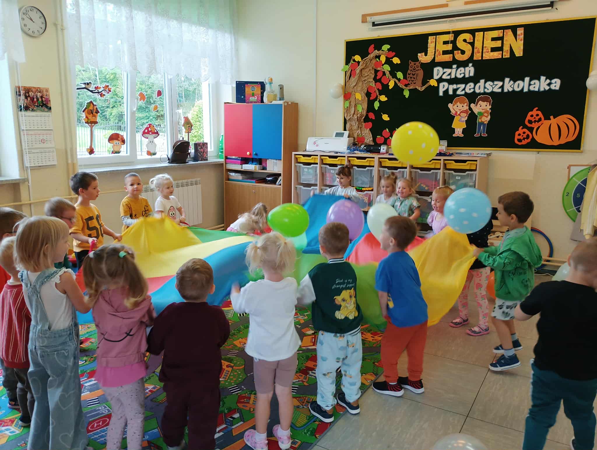 19 września nasze przedszkolaki rozpoczęły świętowanie radosnymi powitaniami, które wprowadziły wszystkich w doskonały nastrój. Następnie dzieci bawiły się na dyskotece i tańczyły przy wesołych rytmach muzyki disco. W programie wydarzenia w przedszkolu nie zabrakło konkursów oraz zabawy z kolorową chustą animacyjną oraz wesołymi balonikami.