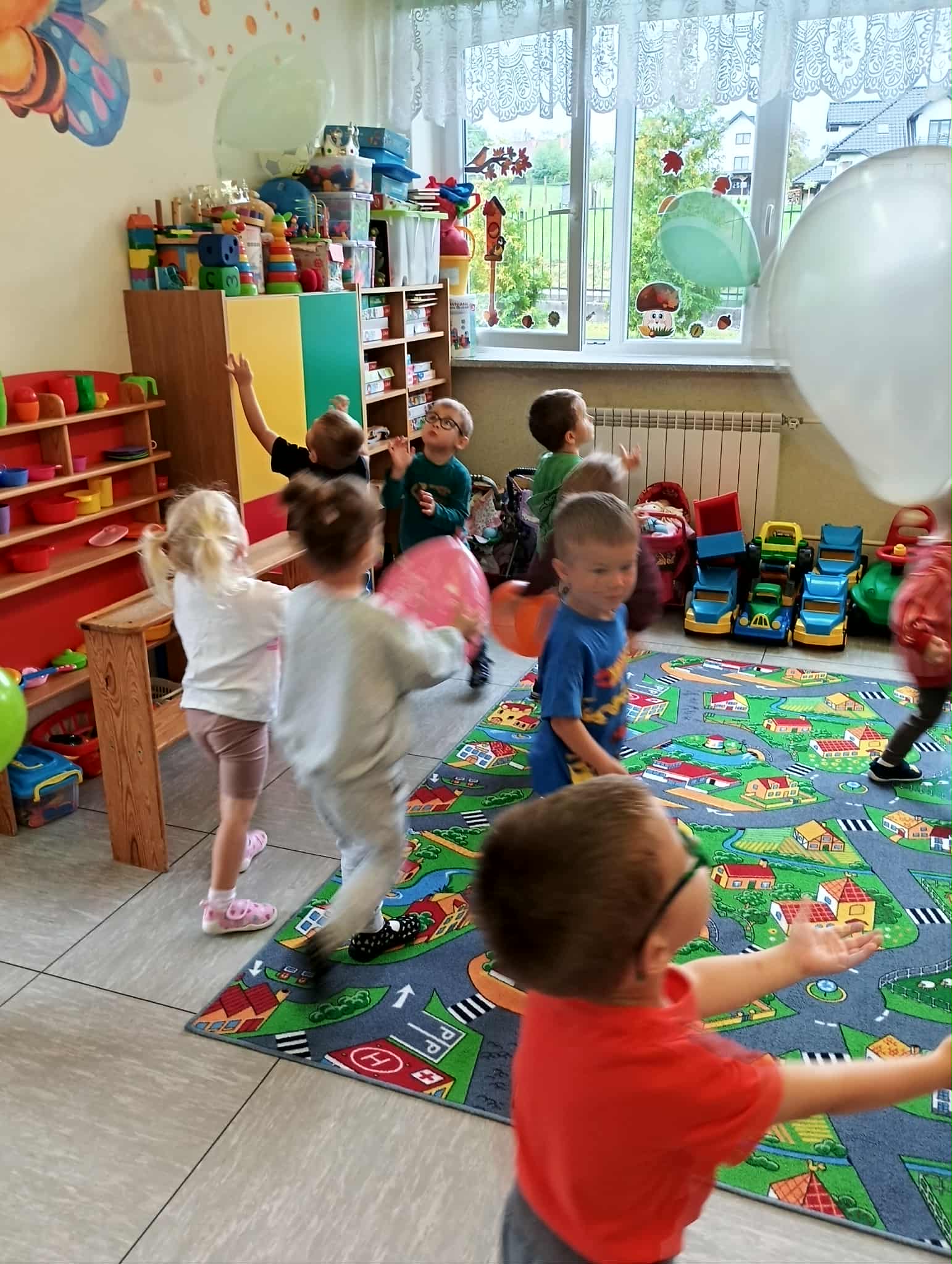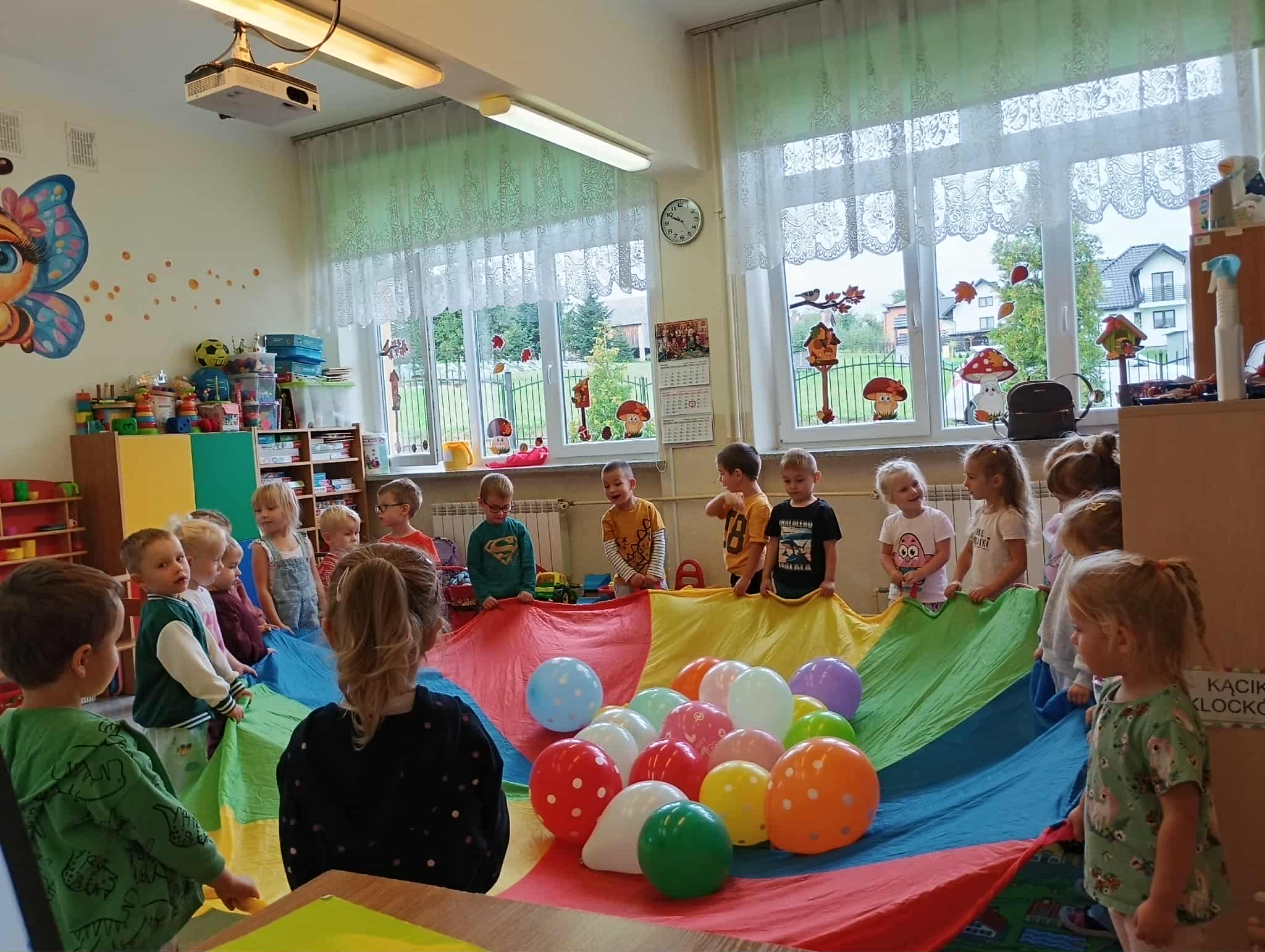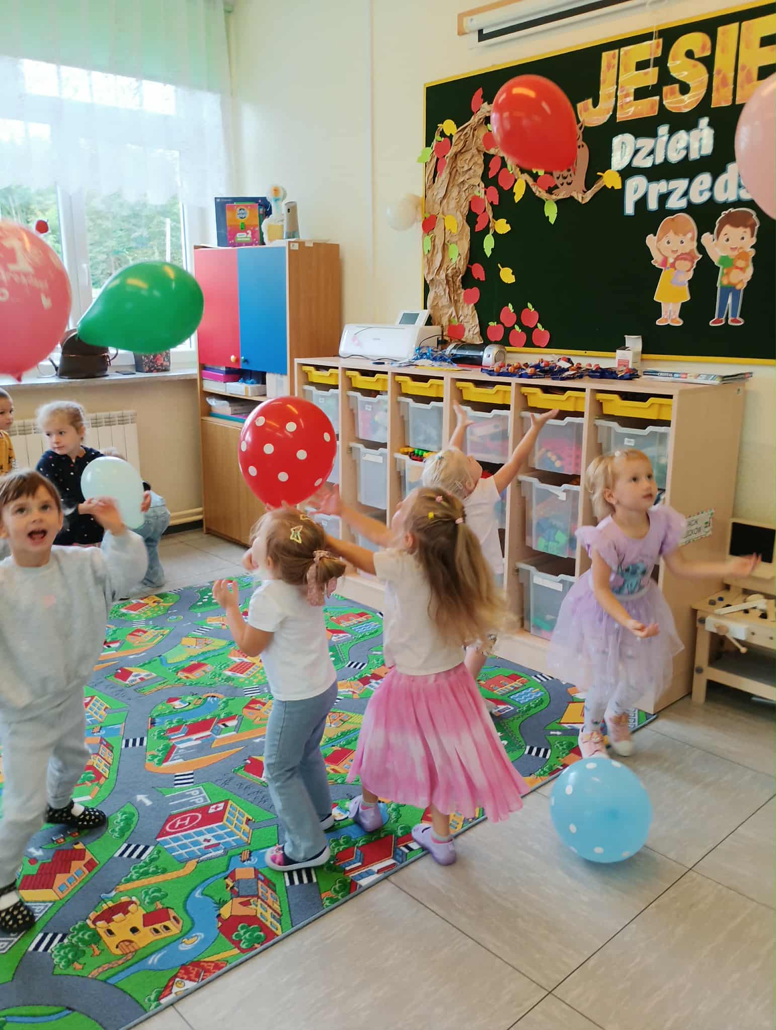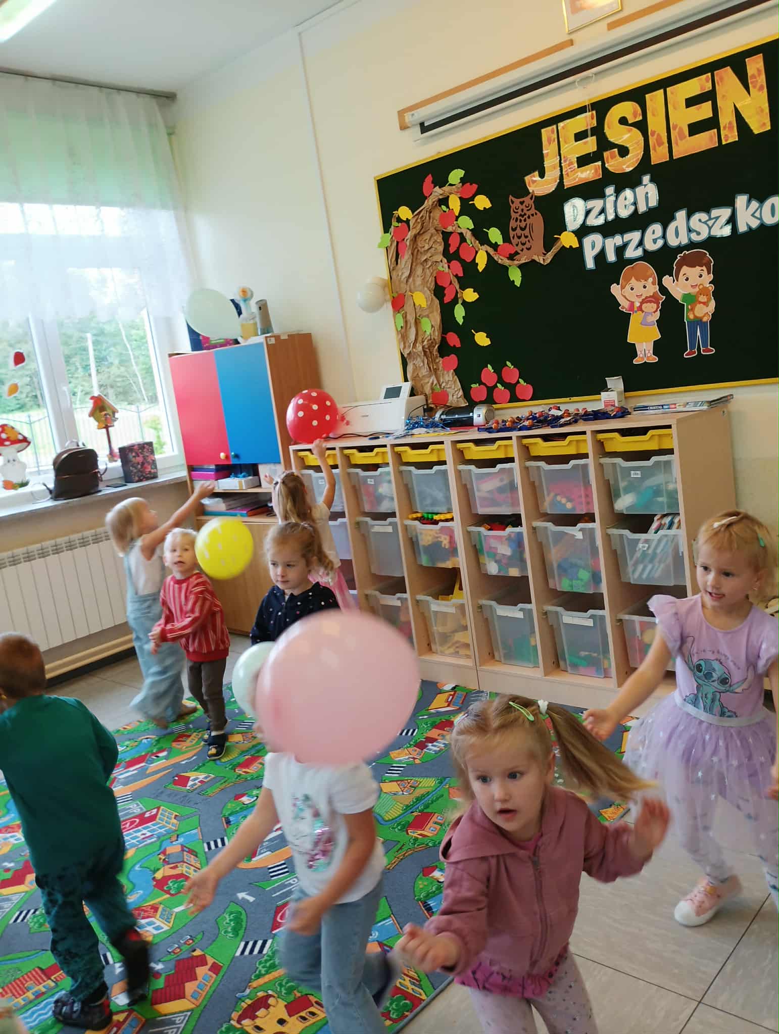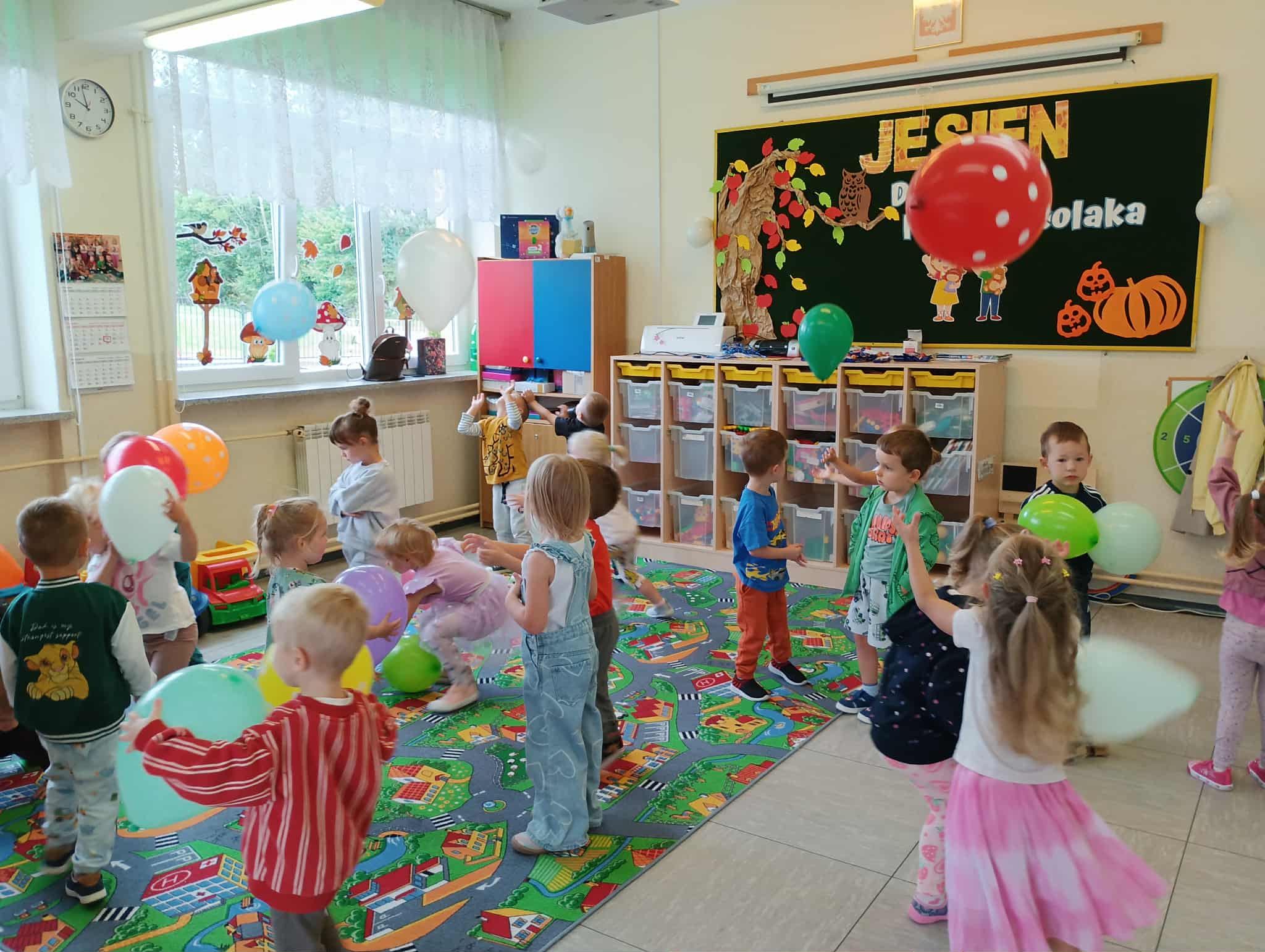 19 września nasze przedszkolaki rozpoczęły świętowanie radosnymi powitaniami, które wprowadziły wszystkich w doskonały nastrój. Następnie dzieci bawiły się na dyskotece i tańczyły przy wesołych rytmach muzyki disco. W programie wydarzenia w przedszkolu nie zabrakło konkursów oraz zabawy z kolorową chustą animacyjną oraz wesołymi balonikami.