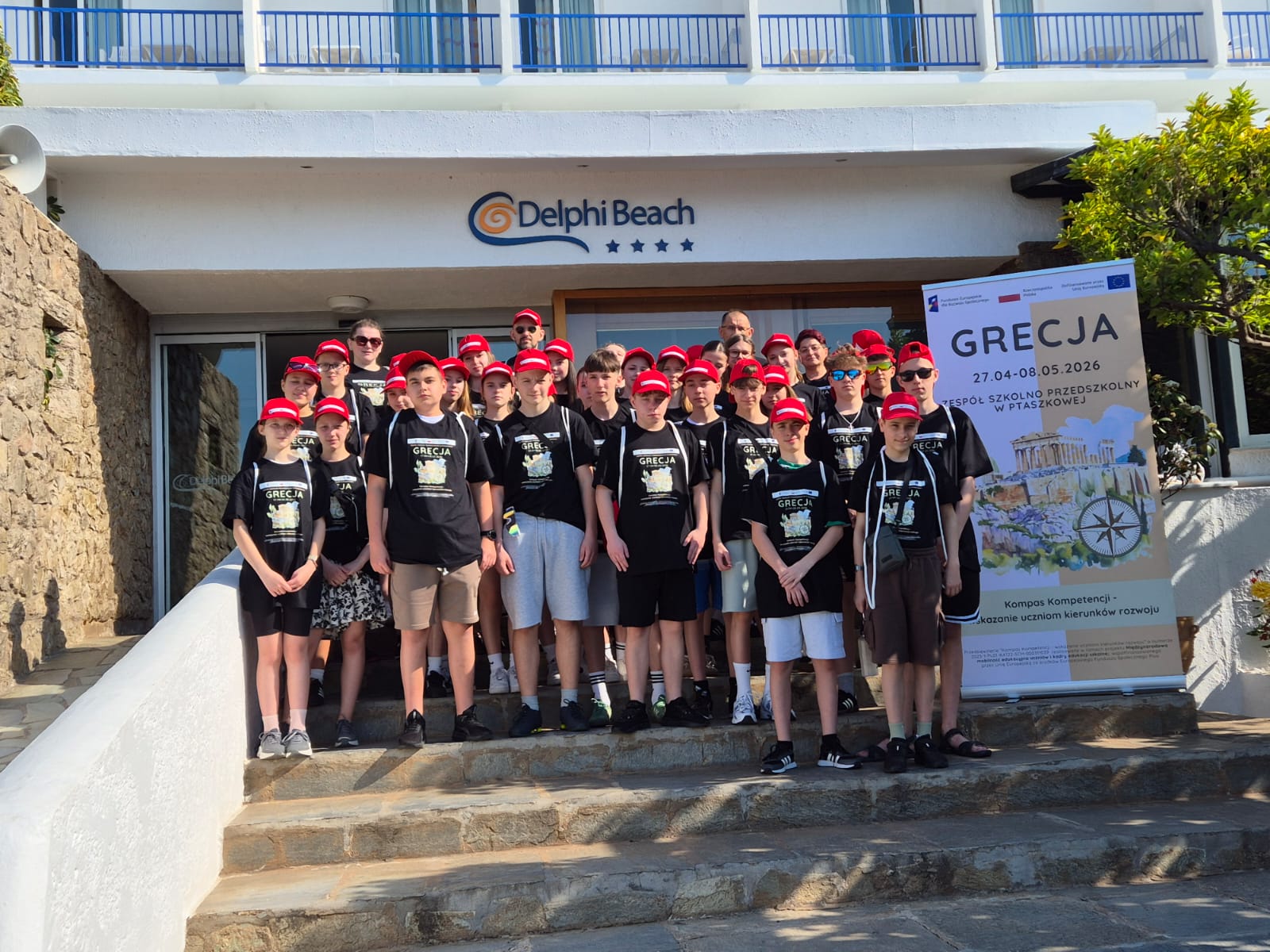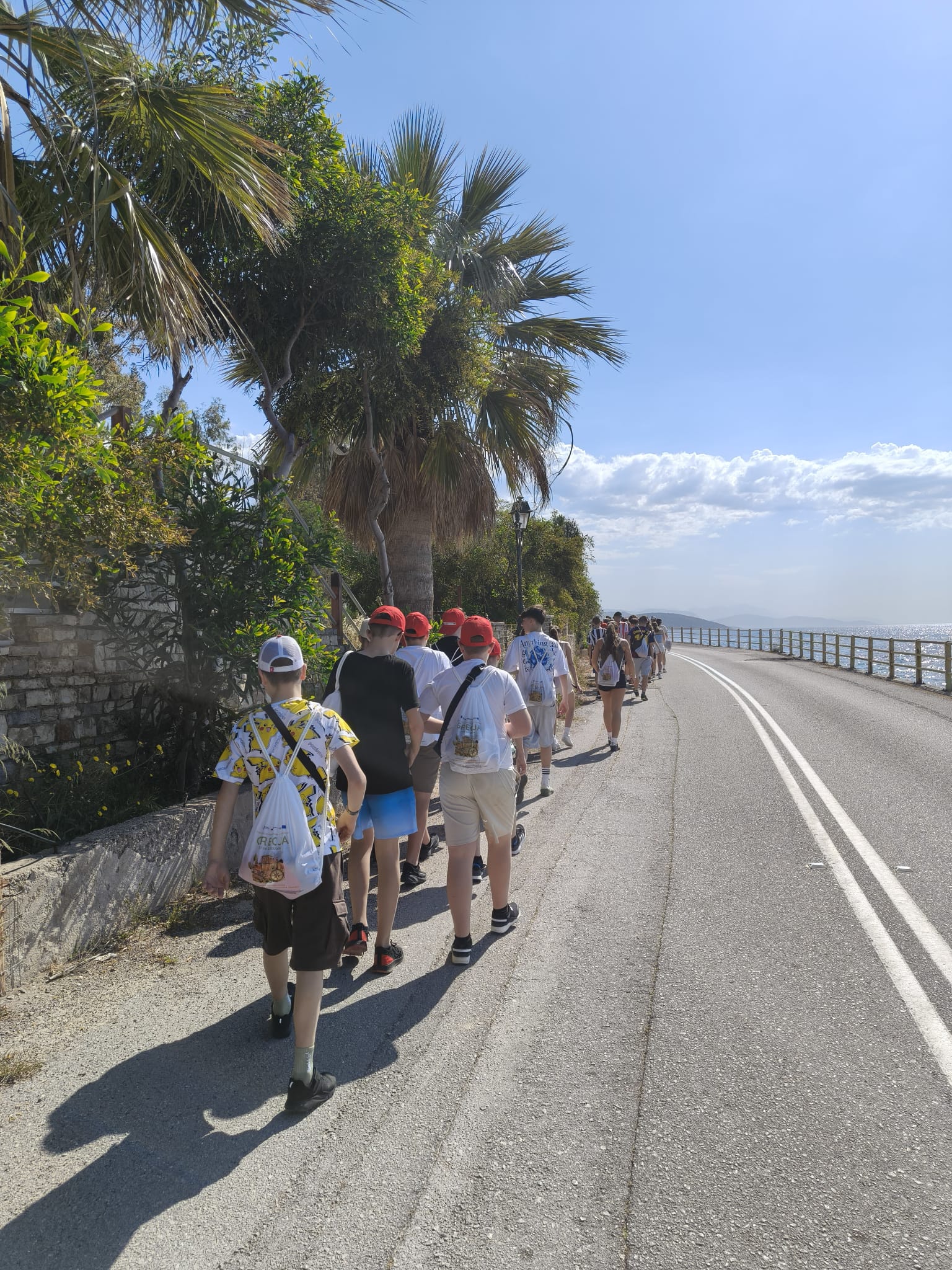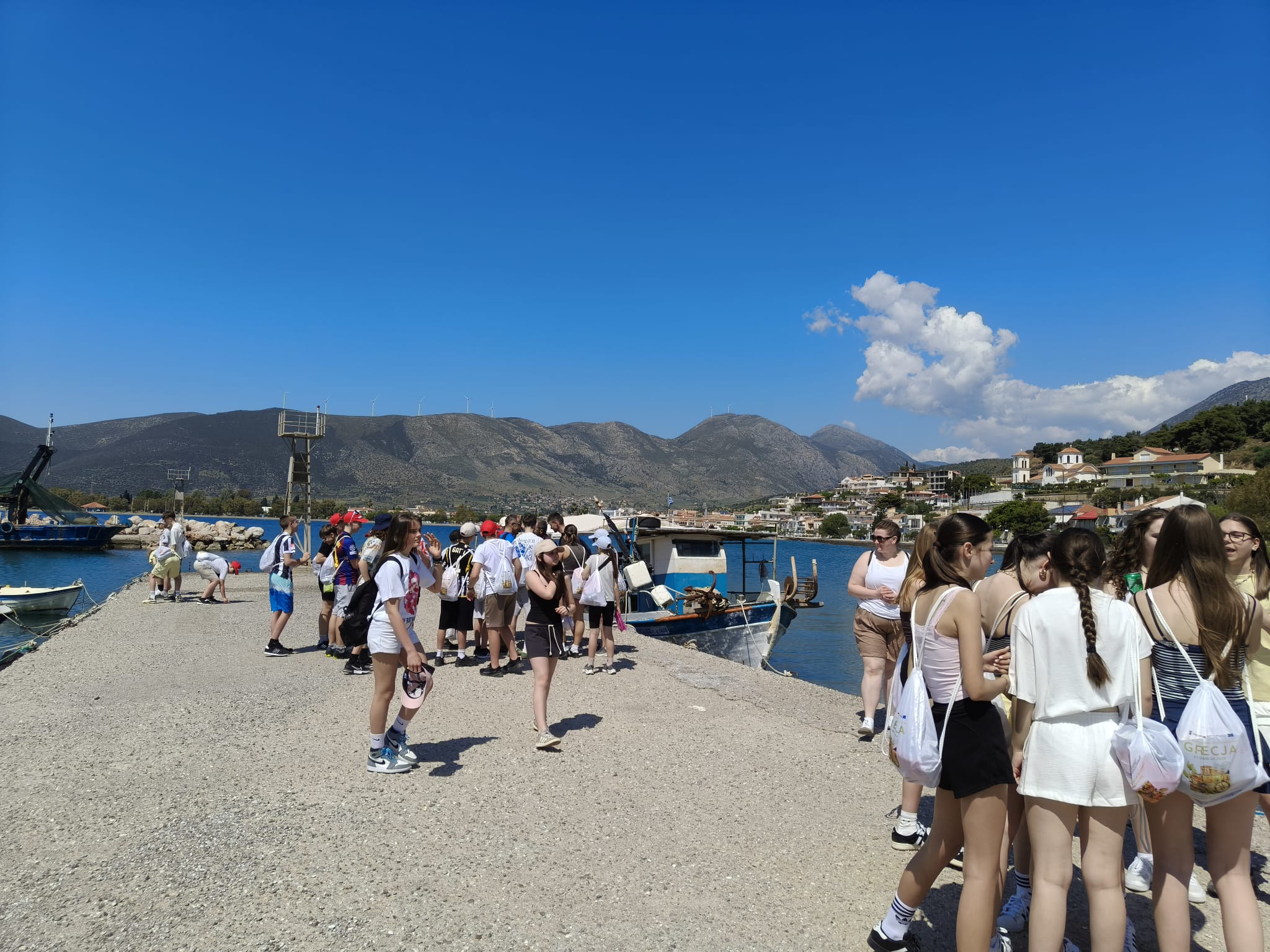 Drugi dzień pobytu w Grecji upłynął pod znakiem spacerów i poznawania lokalnego kolorytu. Uczniowie wraz z opiekunami udali się do centrum Erateini. Wyprawa była idealną okazją do podziwiania widoków, a samo miasteczko urzekło swoją atmosferą. Uczestnicy zwiedzali wąskie, malownicze uliczki, podziwiali tradycyjne greckie domy oraz zabytkowy kościół. Duże wrażenie zrobił na nich również tutejszy port rybacki, gdzie mogli poczuć prawdziwy klimat egejskiego wybrzeża. Korzystając z doskonałej pogody i infrastuktury hotelu, miłośnicy sportu mogli sprawdzić swoje siły na boiskach, grając w siatkówkę oraz tenisa stołowego i ziemnego. Sporą popularnością cieszył się również basen, który przyniósł wszystkim zasłużoną ochłodę. Nie zabrakło też czasu na relaks bliżej natury - podczas spaceru brzegiem morza, wspólnie szukano pięknych okazów muszli i kamieni, a chwilę wytchnienia wypełniły rozmowy i żarty. Był to dzień pełen słońca i pięknych kadrów, który idealnie połączył aktywność fizyczną z błogim wypoczynkiem.