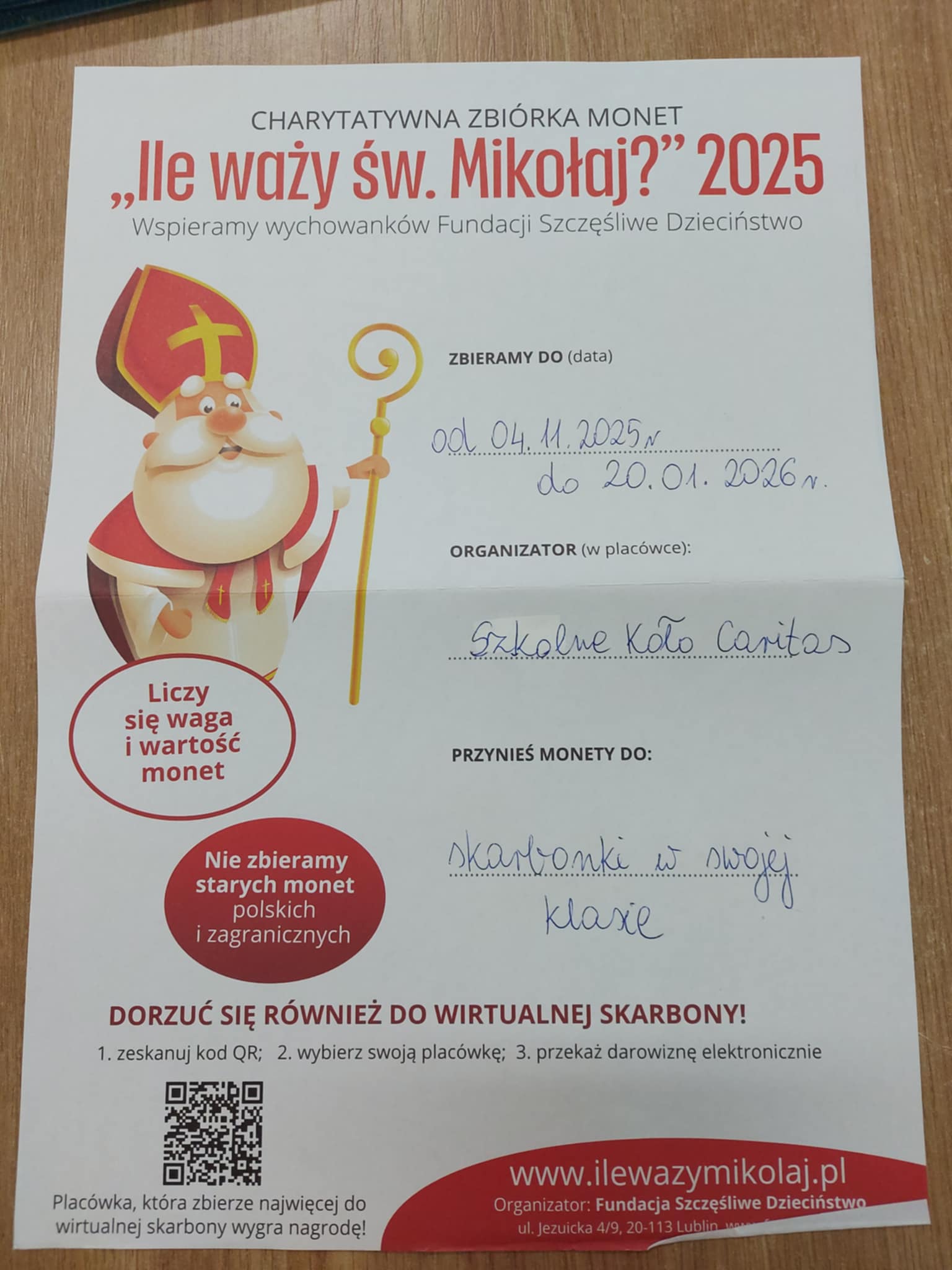 W naszej szkole rusza akcja „Ile waży Św. Mikołaj?”. Zbiórka potrwa od 4 listopada 2025 r. do 16 stycznia 2026 r. Na czym polega akcja? Zbieramy monety (grosze, złotówki) – im więcej uzbieramy, tym „cięższy” będzie nasz Święty Mikołaj. Zebrane pieniądze zostaną przekazane na pomoc potrzebującym dzieciom z Fundacji Szczęśliwe Dzieciństwo.