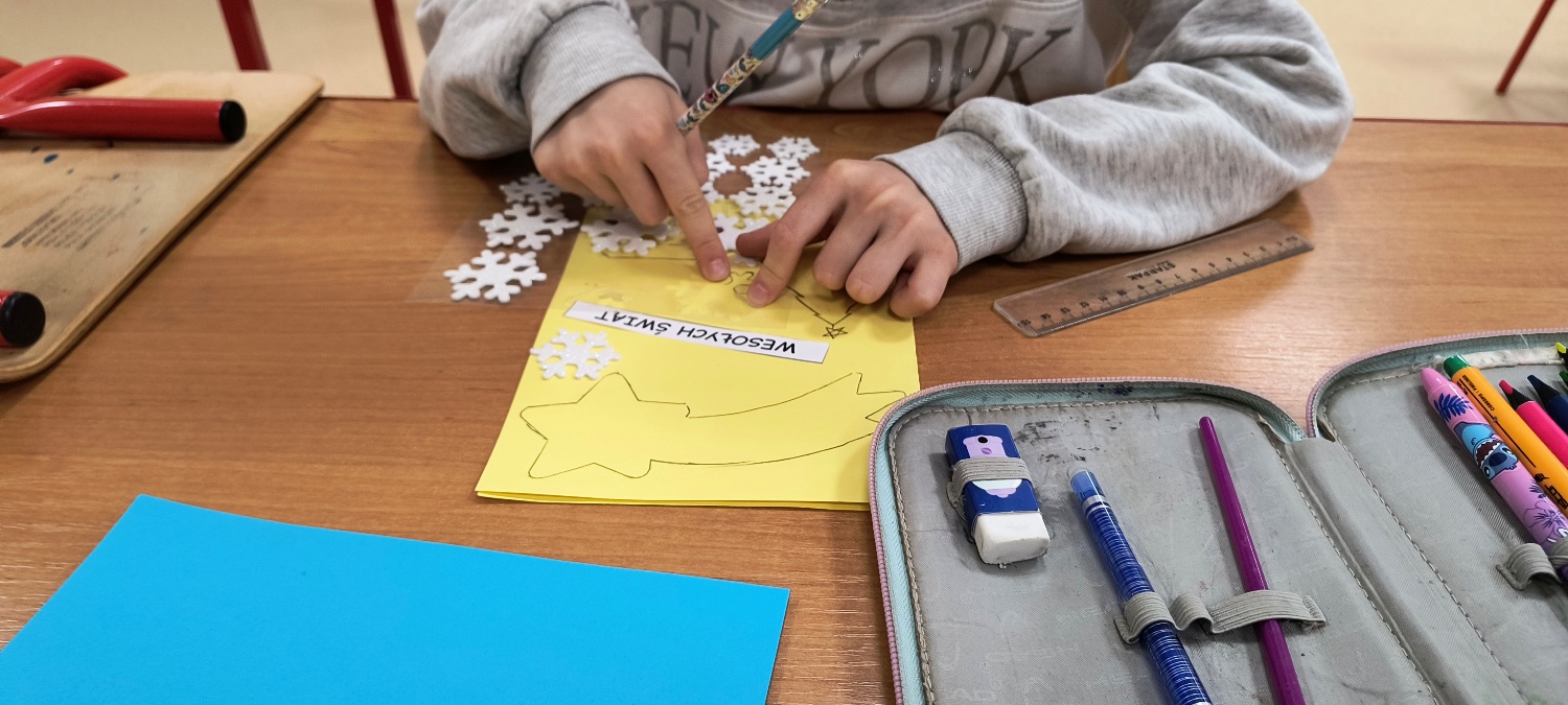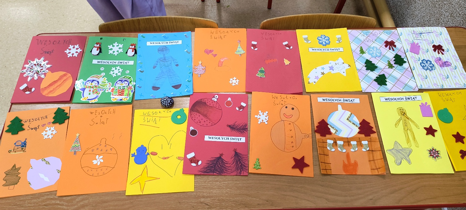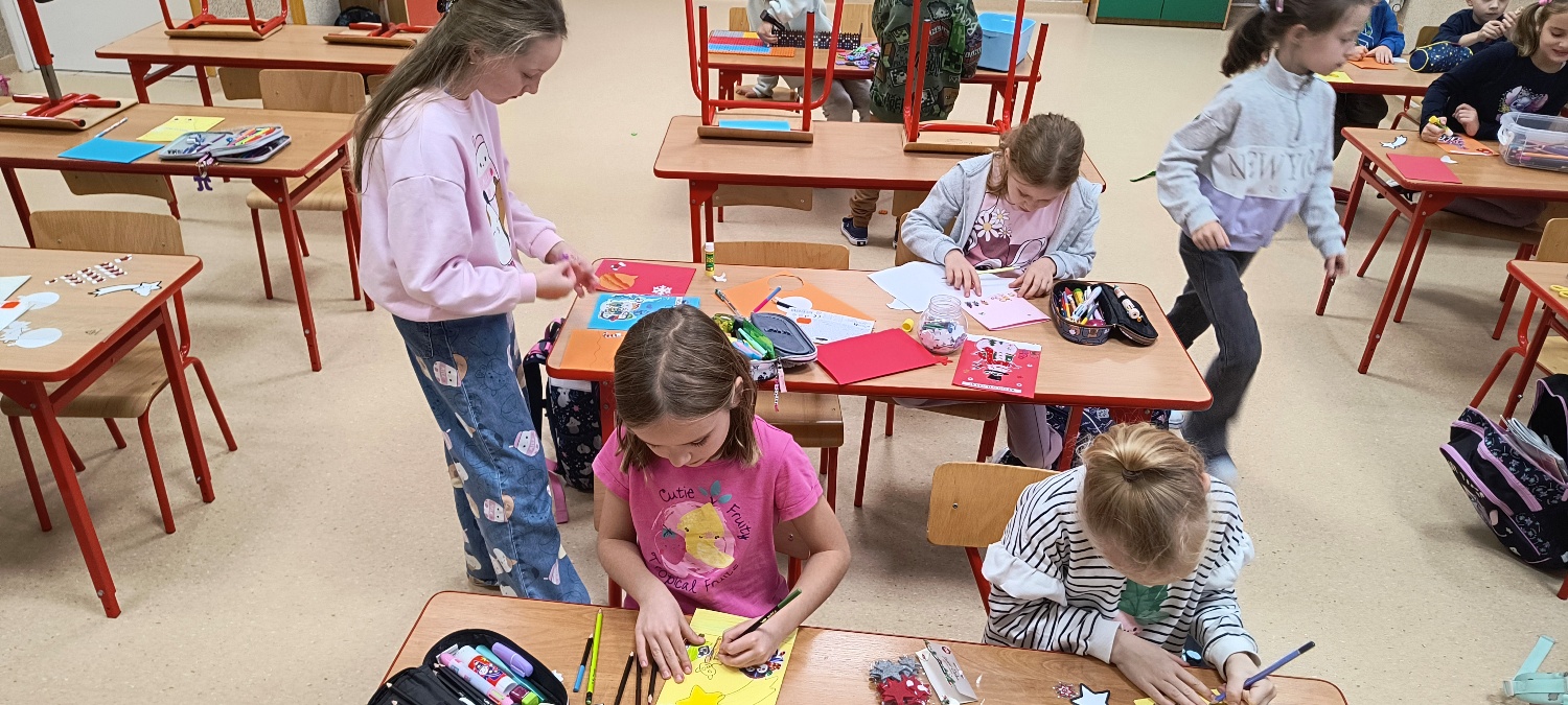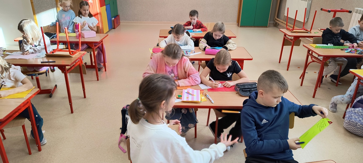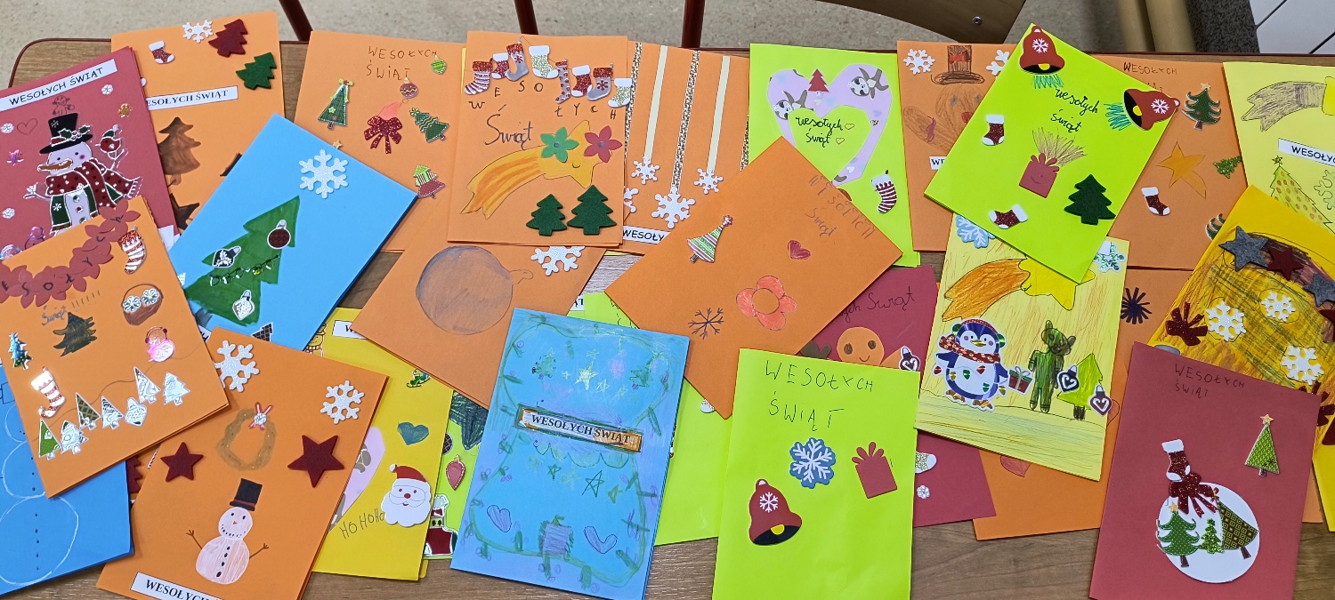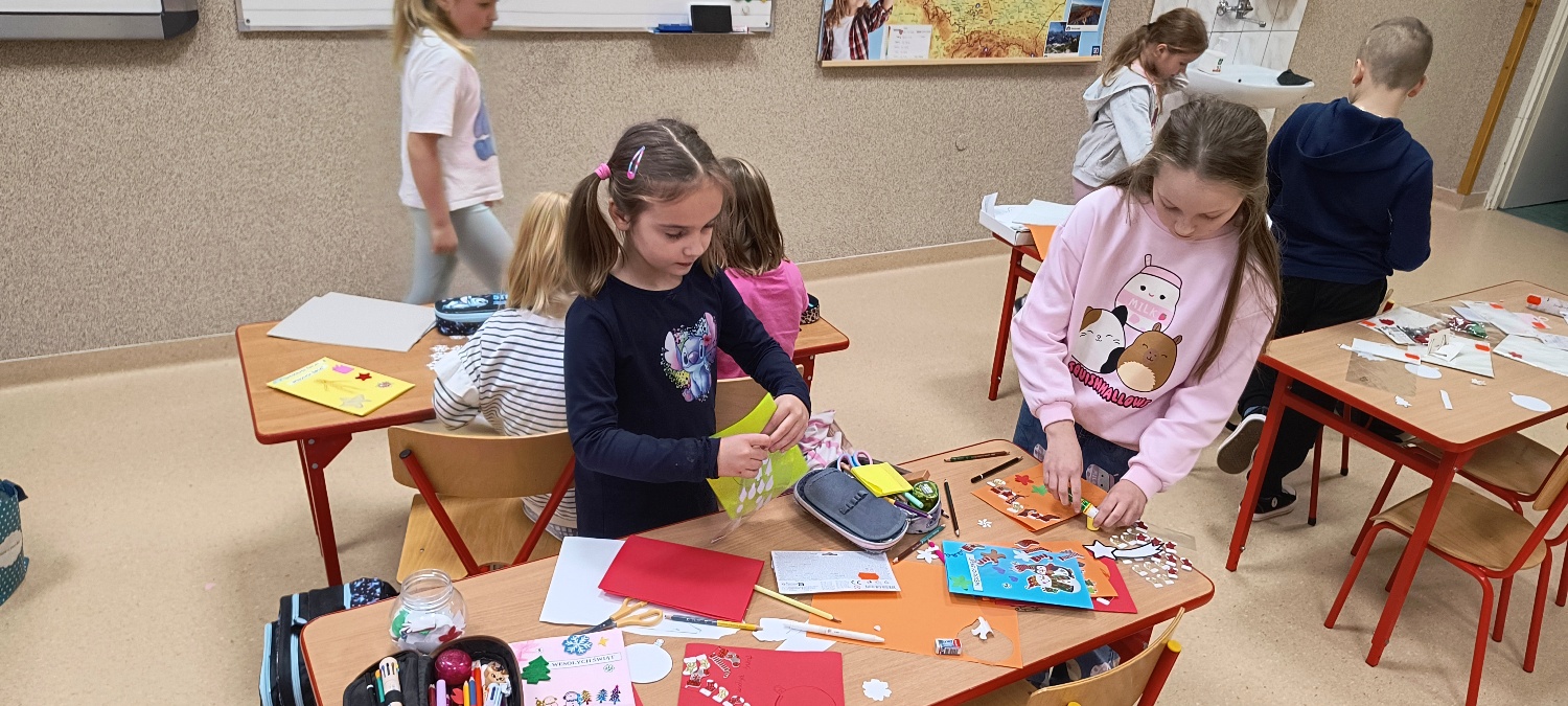 W listopadzie uczniowie uczęszczający na świetlicę szkolną wzięli udział w ogólnopolskiej akcji „Kartka dla Seniora”. Ich zadaniem było przygotowanie kartek świątecznych, które zostaną przekazane mieszkańcom domów pomocy społecznej w całej Polsce. Uczniowie z wielkim zaangażowaniem przystąpili do wykonania kartek, które pięknie przyozdobili. Następnie ćwiczyli umiejętność redagowania życzeń - w każdej kartce własnoręcznie napisali życzenia płynące prosto z serca. Łącznie przygotowali ok. 70 kartek, które zostały wysłane na adres organizatora, a następnie trafią do seniorów. Mam nadzieję, że sprawią im wiele radości.