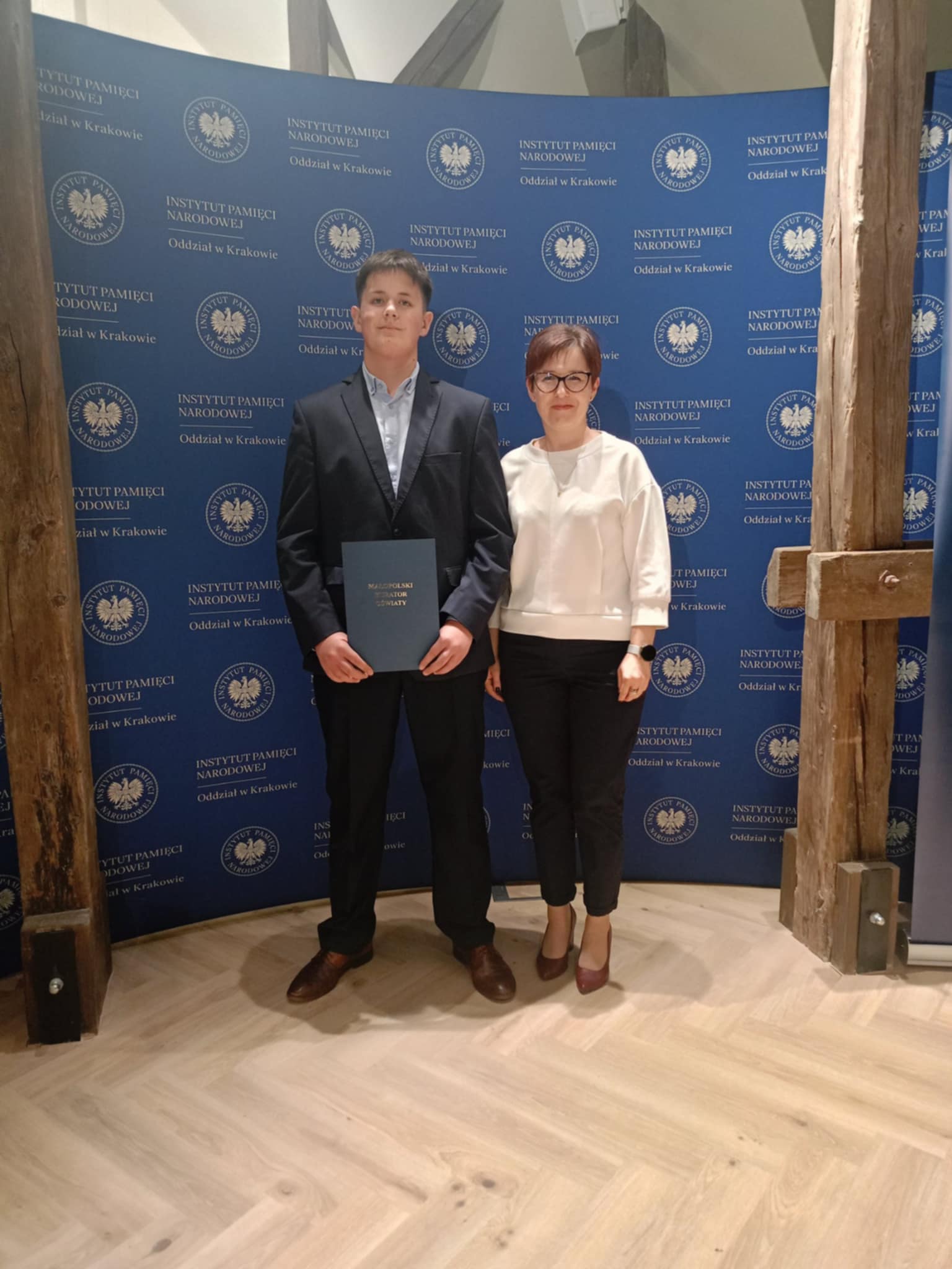 Z radością informujemy, że uczeń naszej szkoły Maciej Ptaszkowski uzyskał tytuł laureata Konkursu Tematycznego „Na szlaku Polski Podziemnej. Armia Krajowa – Delegatura Sił Zbrojnych – Zrzeszenie Wolność i Niezawisłość w 1945 r.” dla uczniów szkół podstawowych województwa małopolskiego w roku szkolnym 2024/2025. W etapie szkolnym konkursu Maciej wykazał się dużą wiedzą w związaną z tematem. W kolejnym etapie napisał twórczą pracę zgodną z tematyką konkursu, opartą na źródłach historycznych. Praca została doceniona i zakwalifikowana przez komisję rejonową do finału konkursu. W etapie wojewódzkim, który odbył się 4 kwietnia br. w Instytucie Pamięci Narodowej w Krakowie uczeń zaprezentował swoją pracę i odpowiadał na pytania komisji konkursowej uzyskując maksymalną ilość punków możliwych do zdobycia . Został wyróżniony wśród laureatów I miejscem.