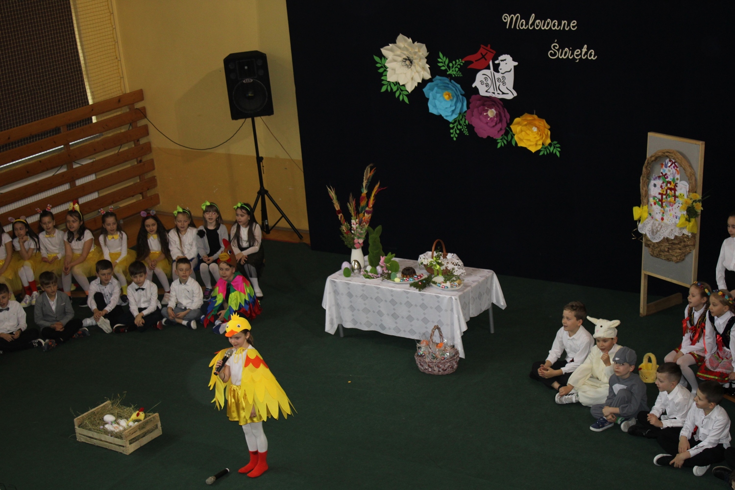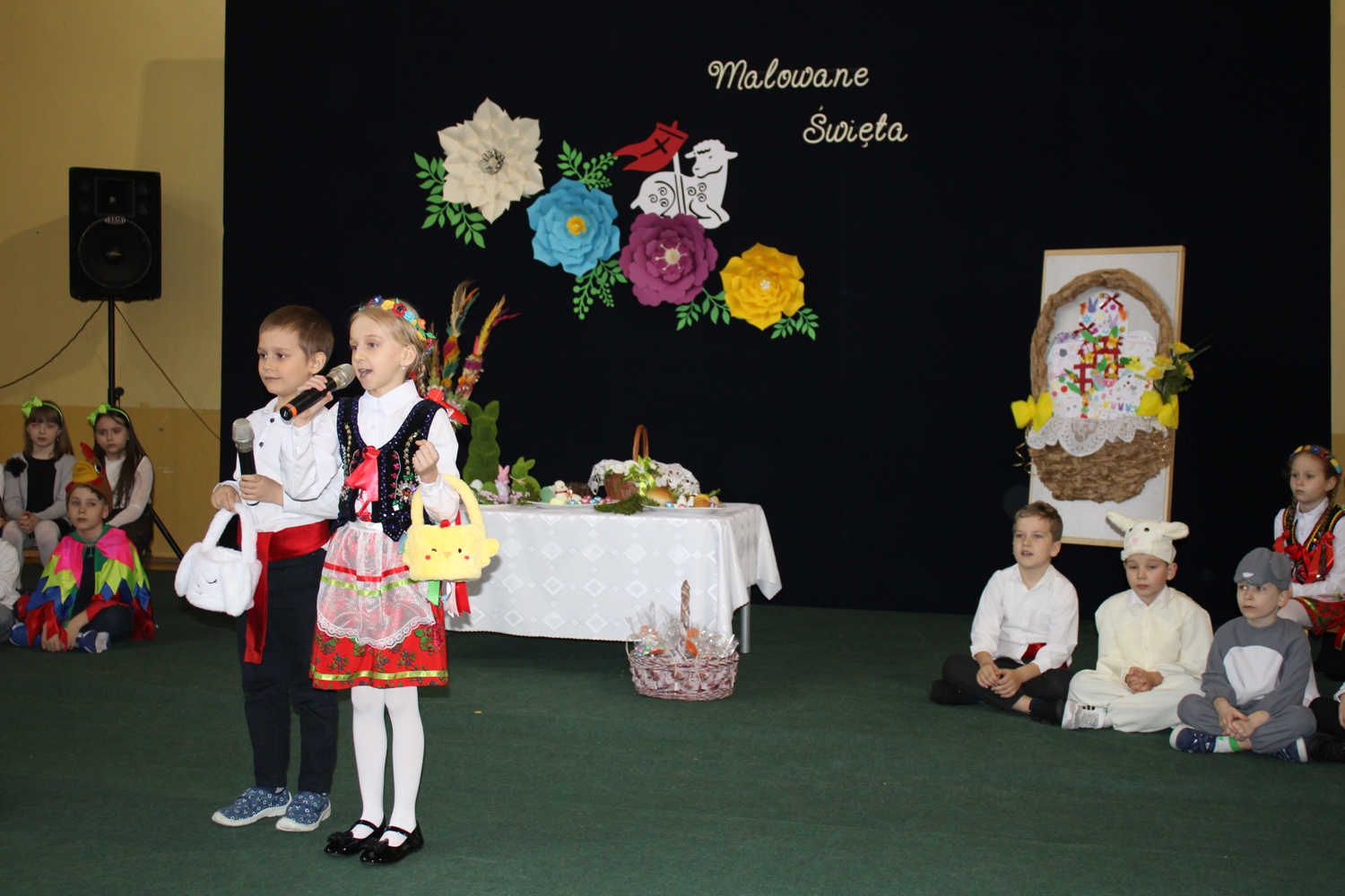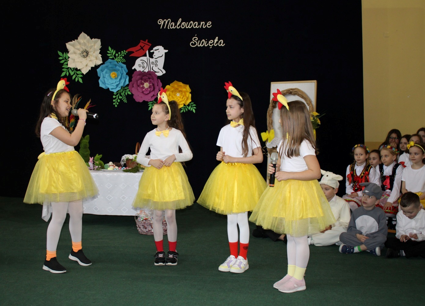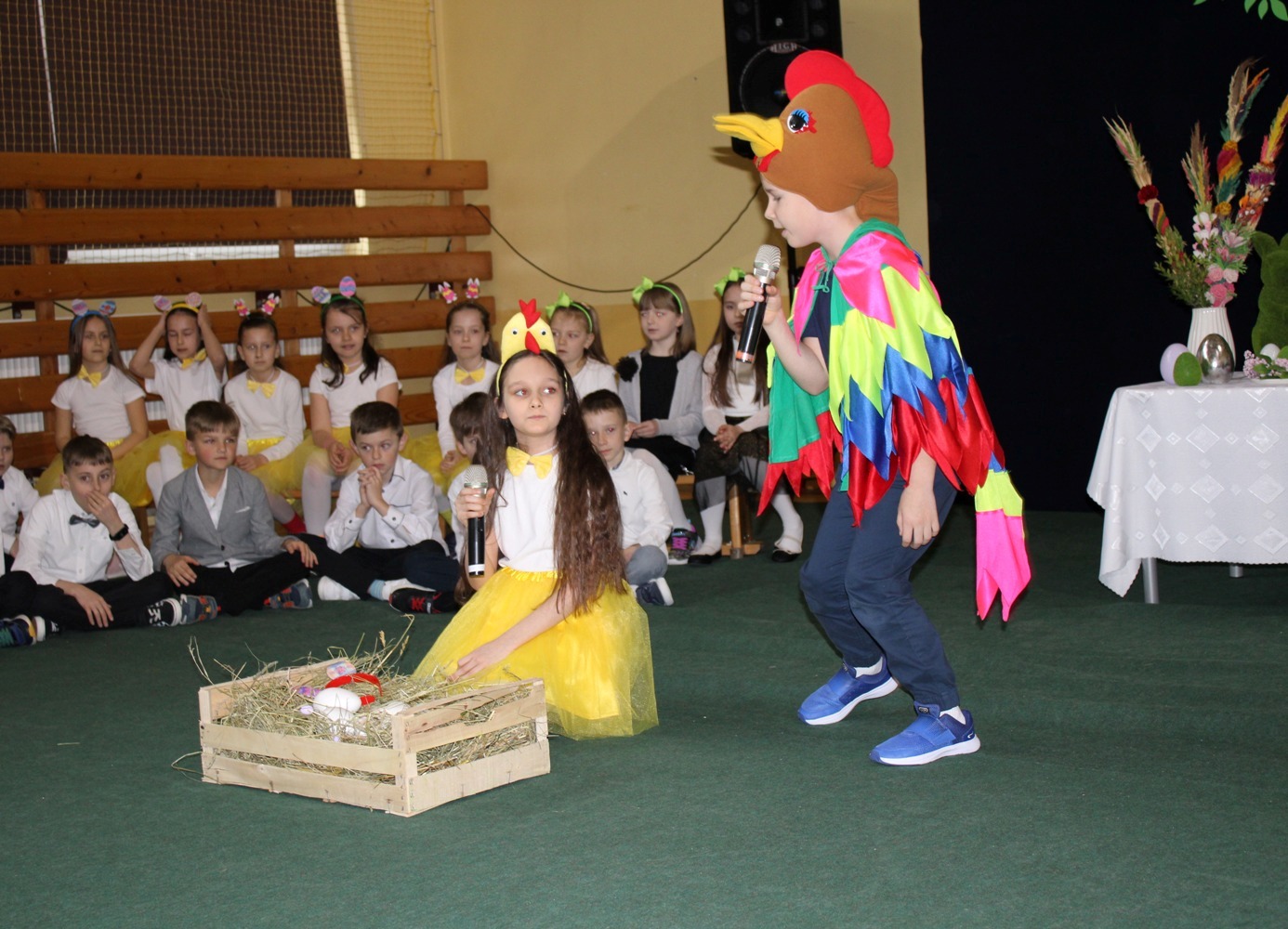 Przebiegała ona pod hasłem „Malowane Święta”. W zabawny, humorystyczny sposób przypomnieliśmy sobie świąteczne zwyczaje. Dowiedzieliśmy się czego symbolem są poszczególne pokarmy, które wkładamy do koszyka i niesiemy do święcenia. Powitaliśmy na scenie: zajączka, kurę z pisklakami, kolorowe pisanki, baranka… Każda z tych postaci miała coś ważnego do powiedzenia.