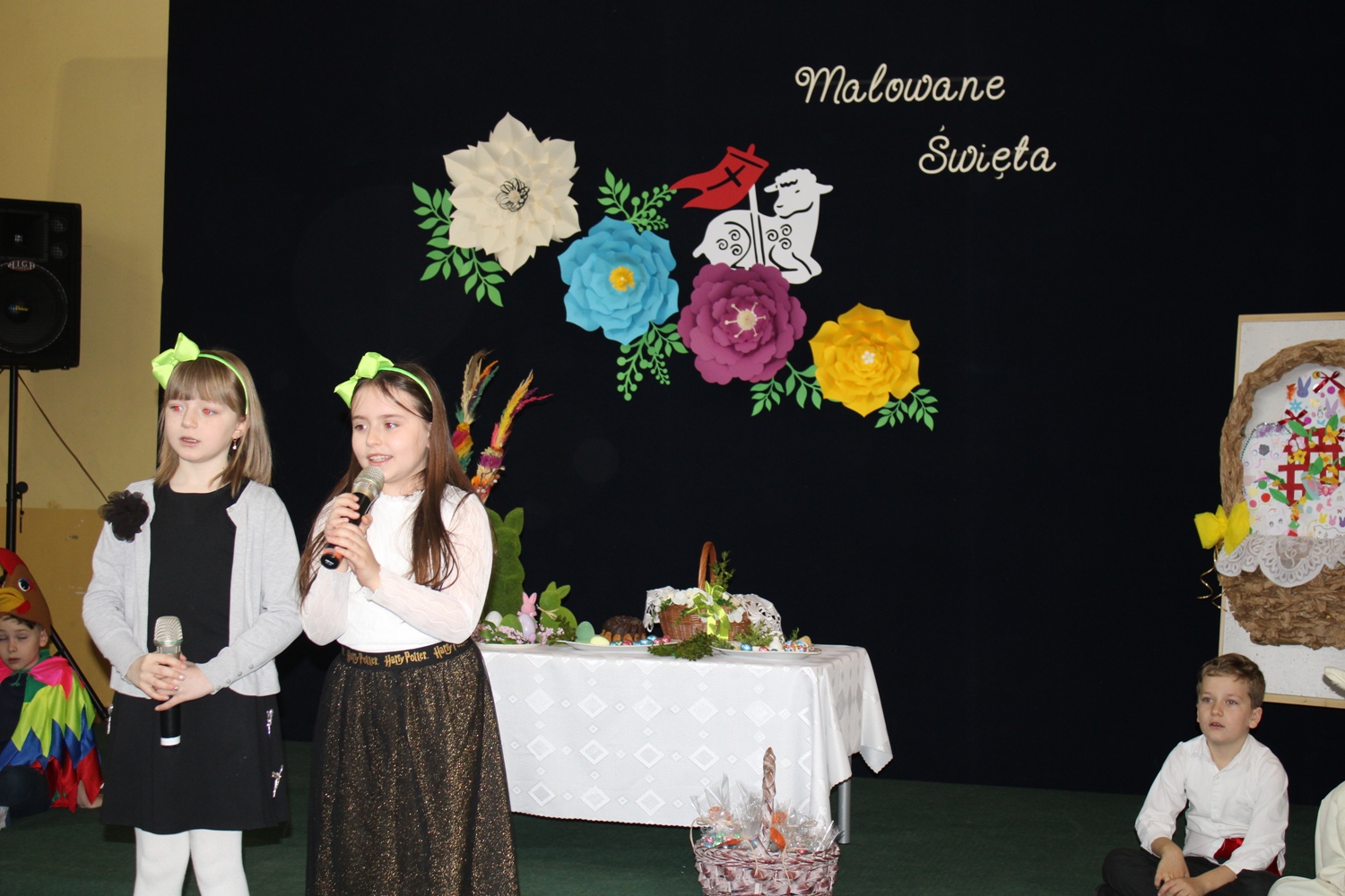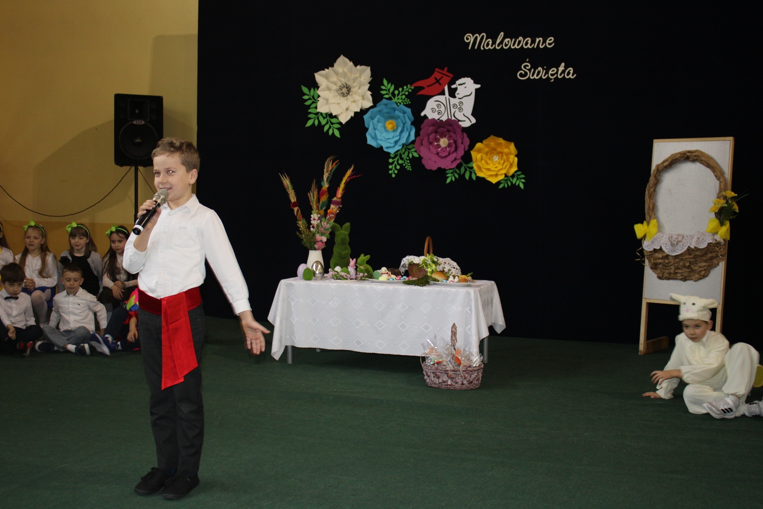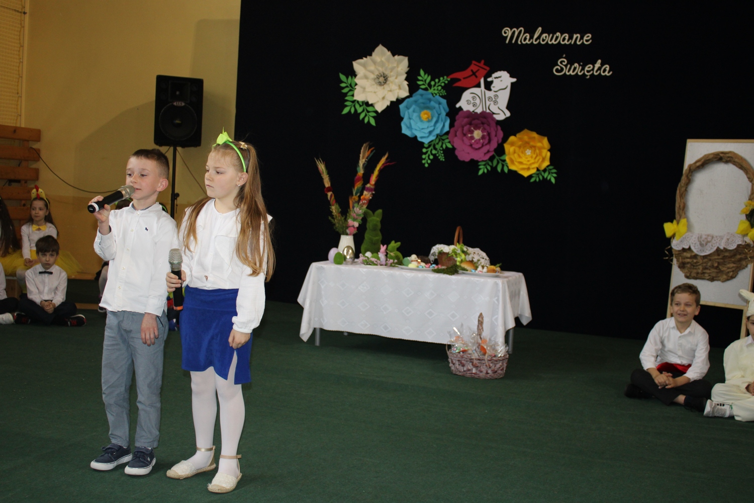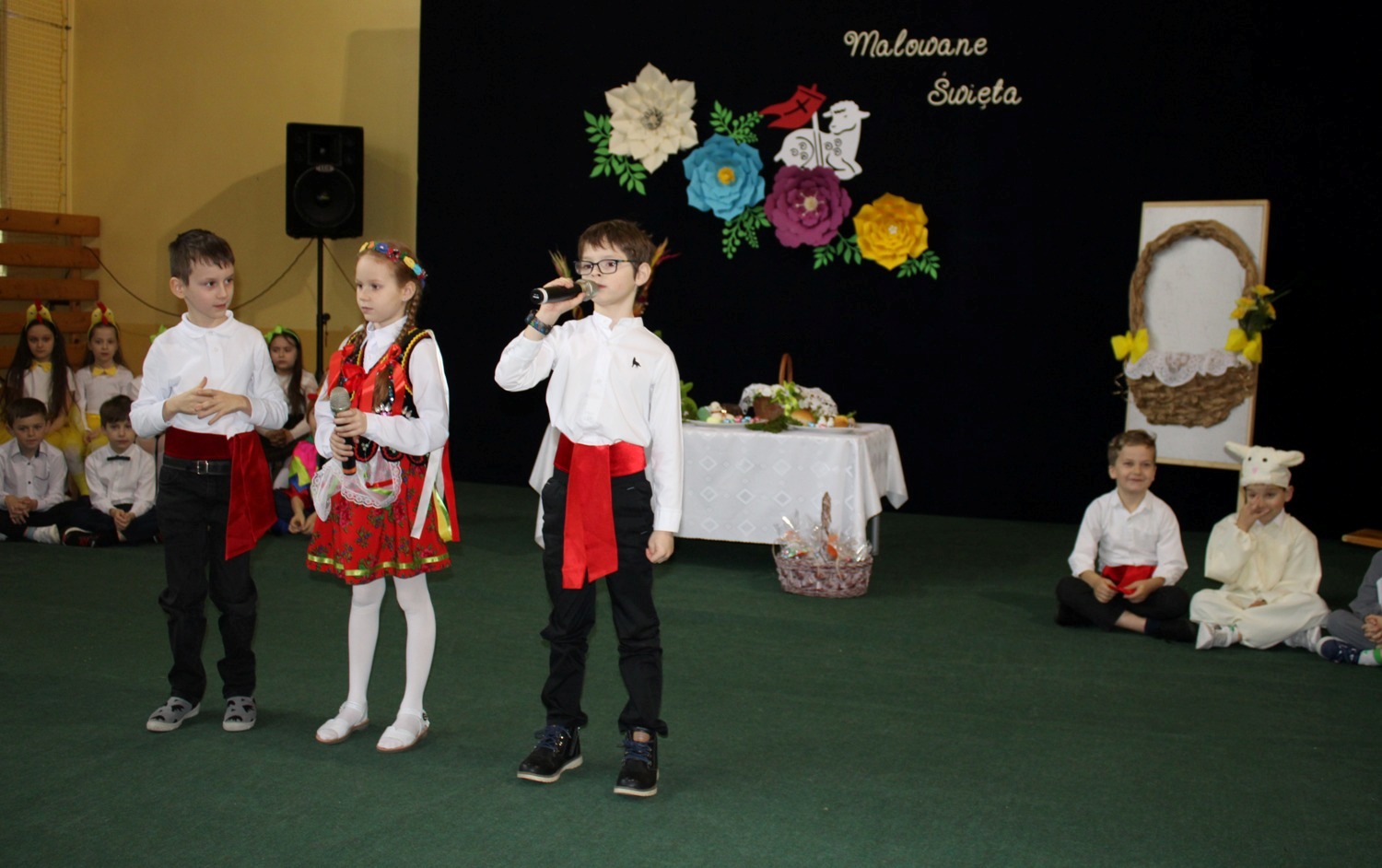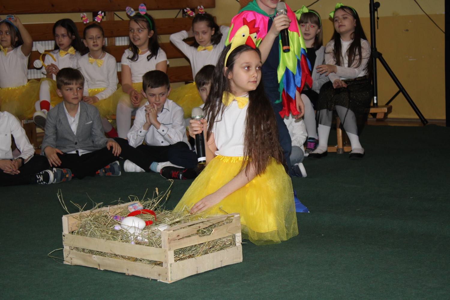 Przebiegała ona pod hasłem „Malowane Święta”. W zabawny, humorystyczny sposób przypomnieliśmy sobie świąteczne zwyczaje. Dowiedzieliśmy się czego symbolem są poszczególne pokarmy, które wkładamy do koszyka i niesiemy do święcenia. Powitaliśmy na scenie: zajączka, kurę z pisklakami, kolorowe pisanki, baranka… Każda z tych postaci miała coś ważnego do powiedzenia.
