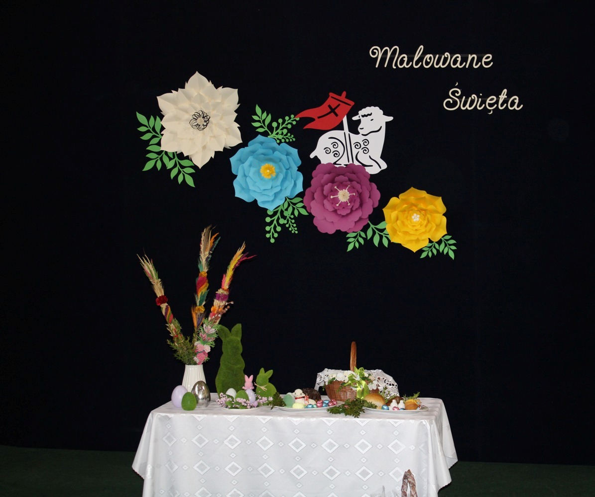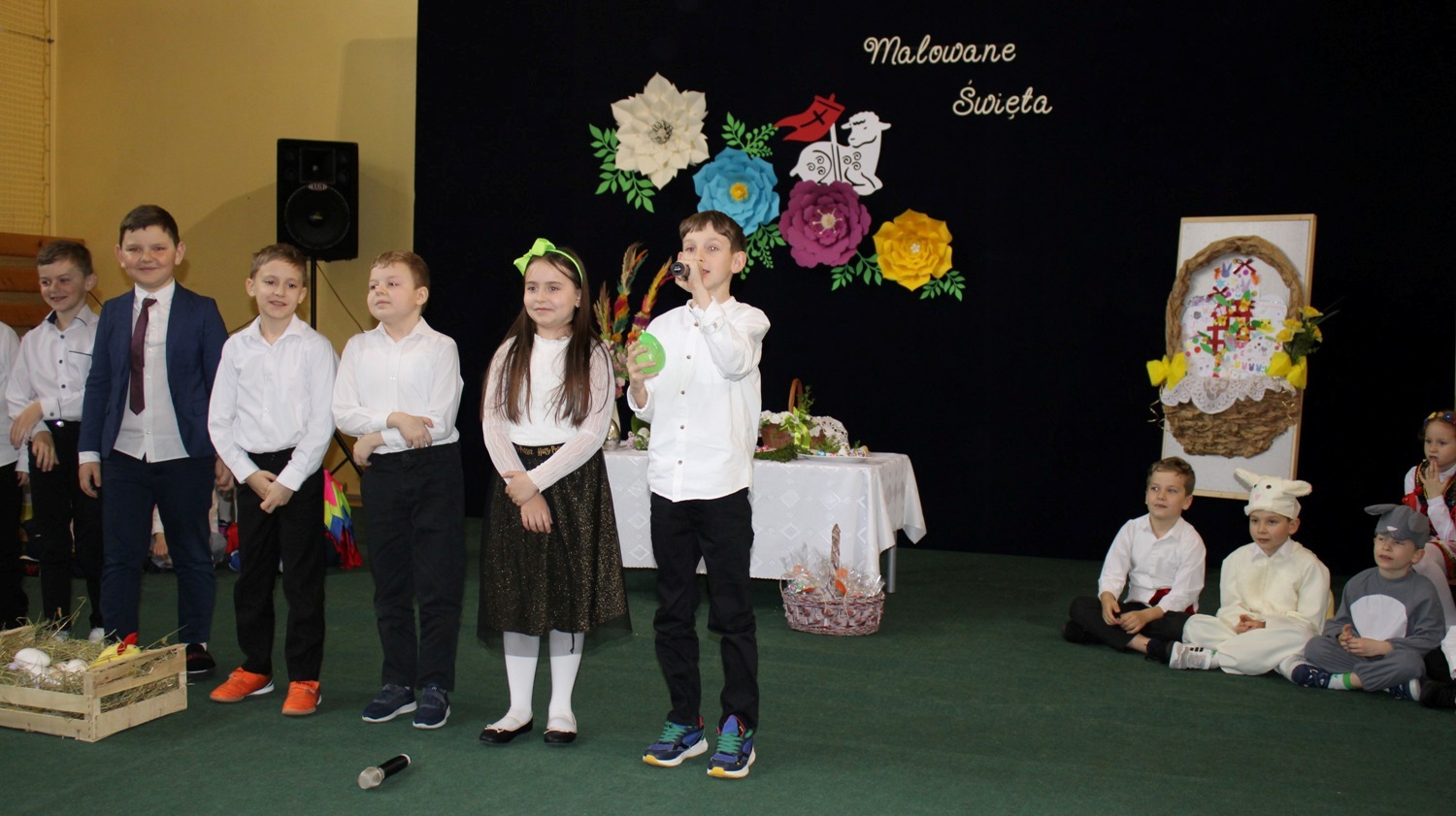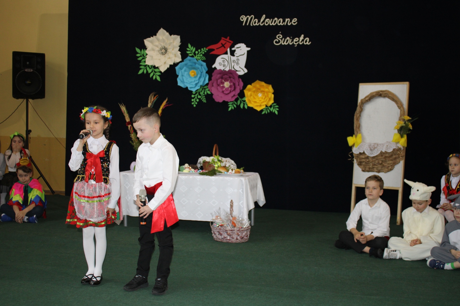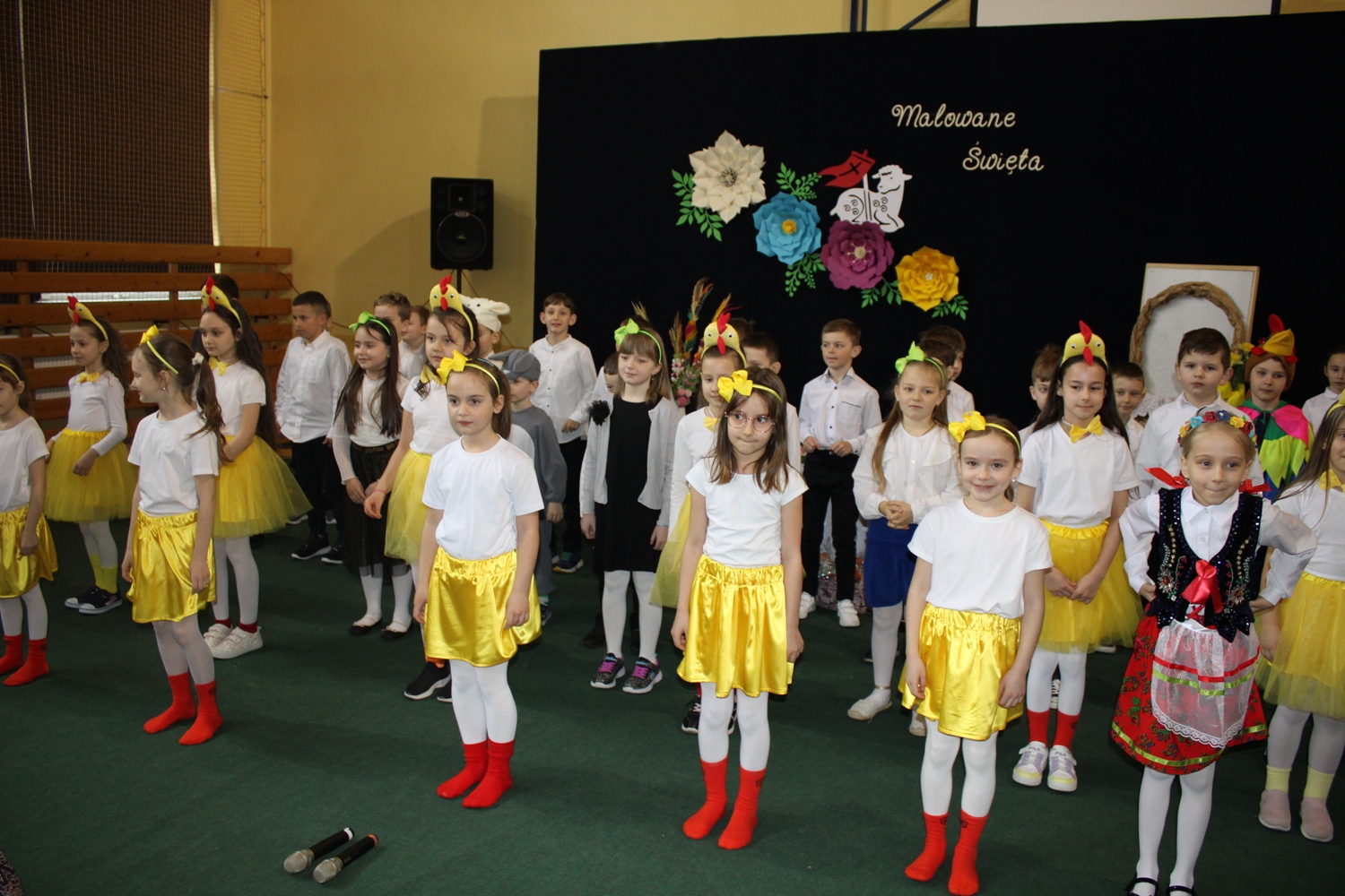 Przebiegała ona pod hasłem „Malowane Święta”. W zabawny, humorystyczny sposób przypomnieliśmy sobie świąteczne zwyczaje. Dowiedzieliśmy się czego symbolem są poszczególne pokarmy, które wkładamy do koszyka i niesiemy do święcenia. Powitaliśmy na scenie: zajączka, kurę z pisklakami, kolorowe pisanki, baranka… Każda z tych postaci miała coś ważnego do powiedzenia.