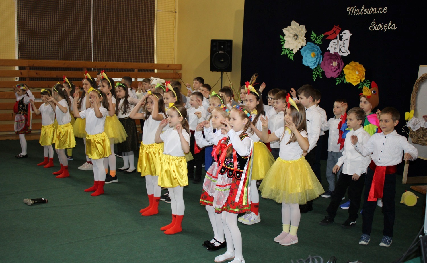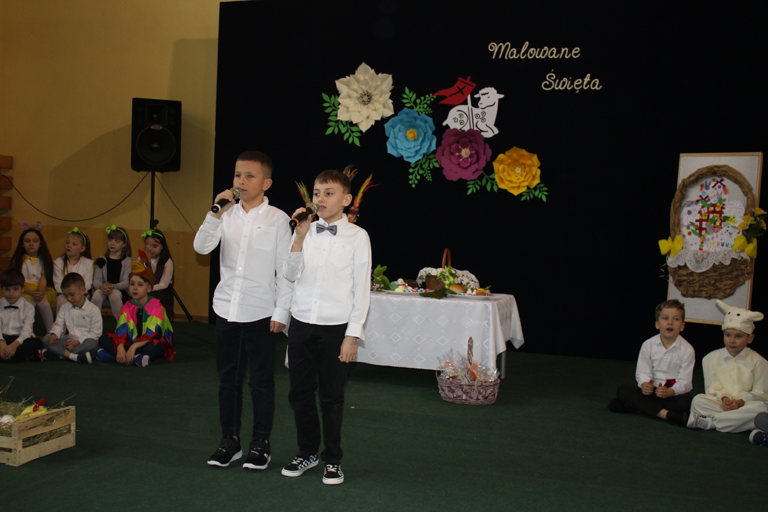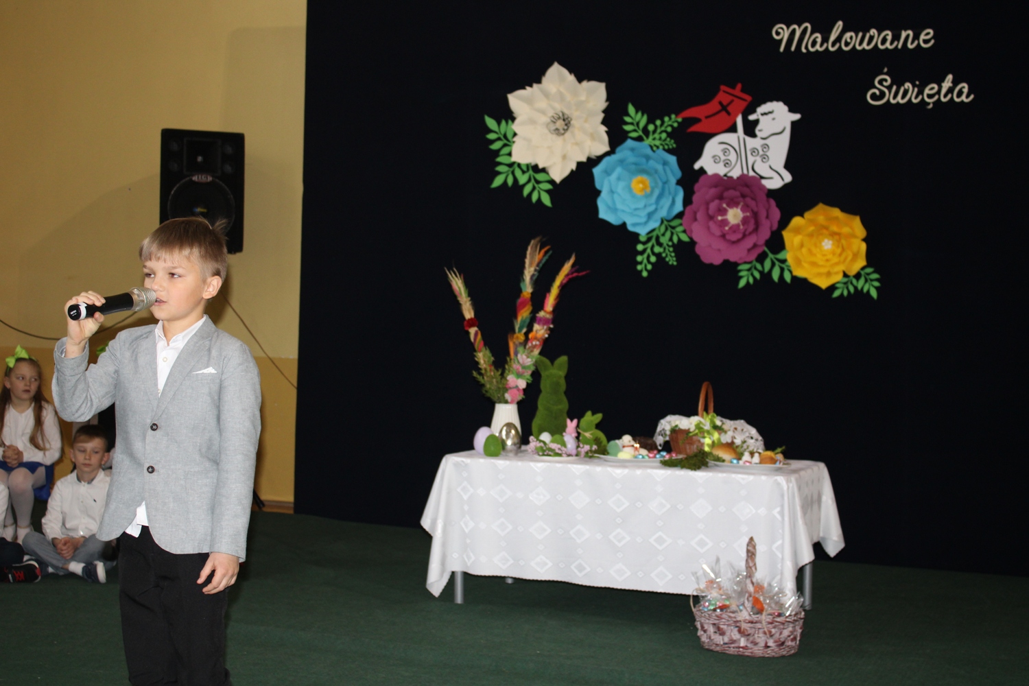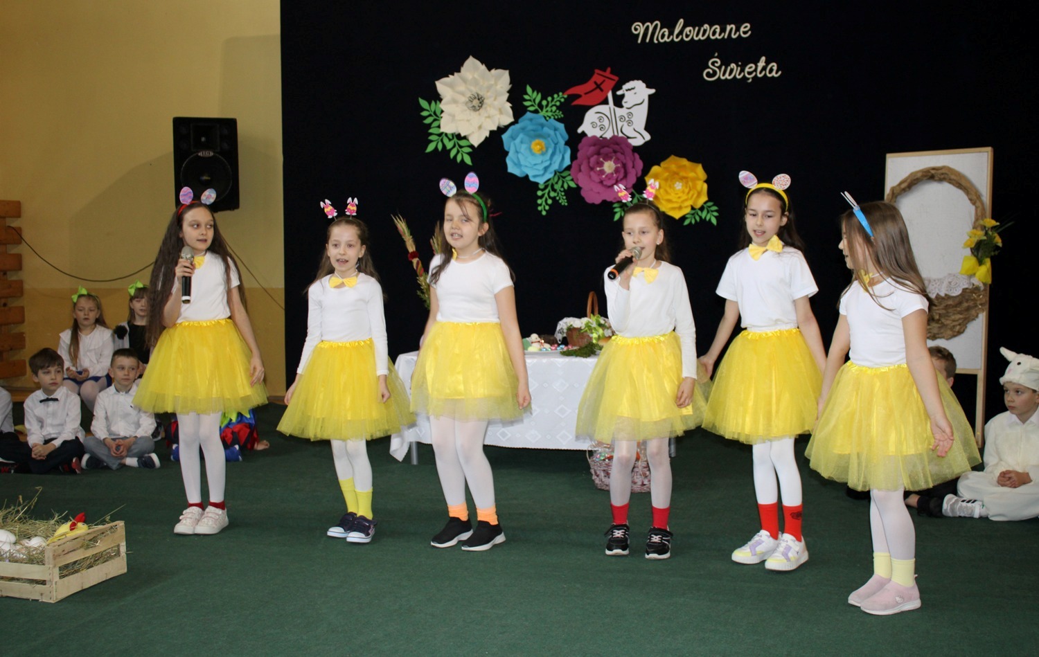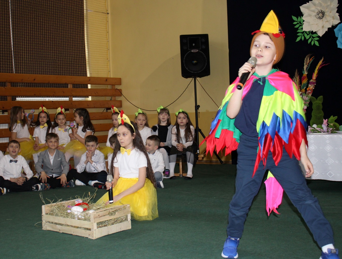 Przebiegała ona pod hasłem „Malowane Święta”. W zabawny, humorystyczny sposób przypomnieliśmy sobie świąteczne zwyczaje. Dowiedzieliśmy się czego symbolem są poszczególne pokarmy, które wkładamy do koszyka i niesiemy do święcenia. Powitaliśmy na scenie: zajączka, kurę z pisklakami, kolorowe pisanki, baranka… Każda z tych postaci miała coś ważnego do powiedzenia.