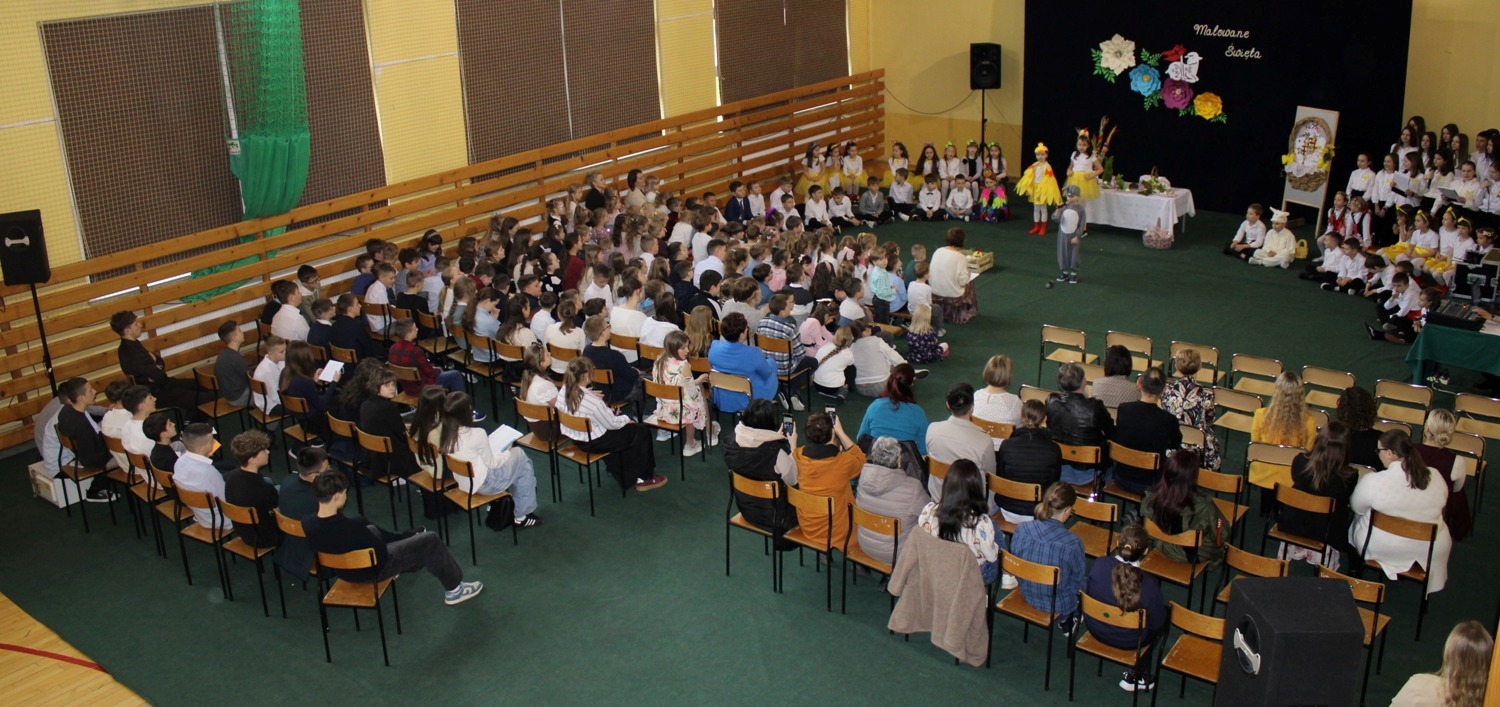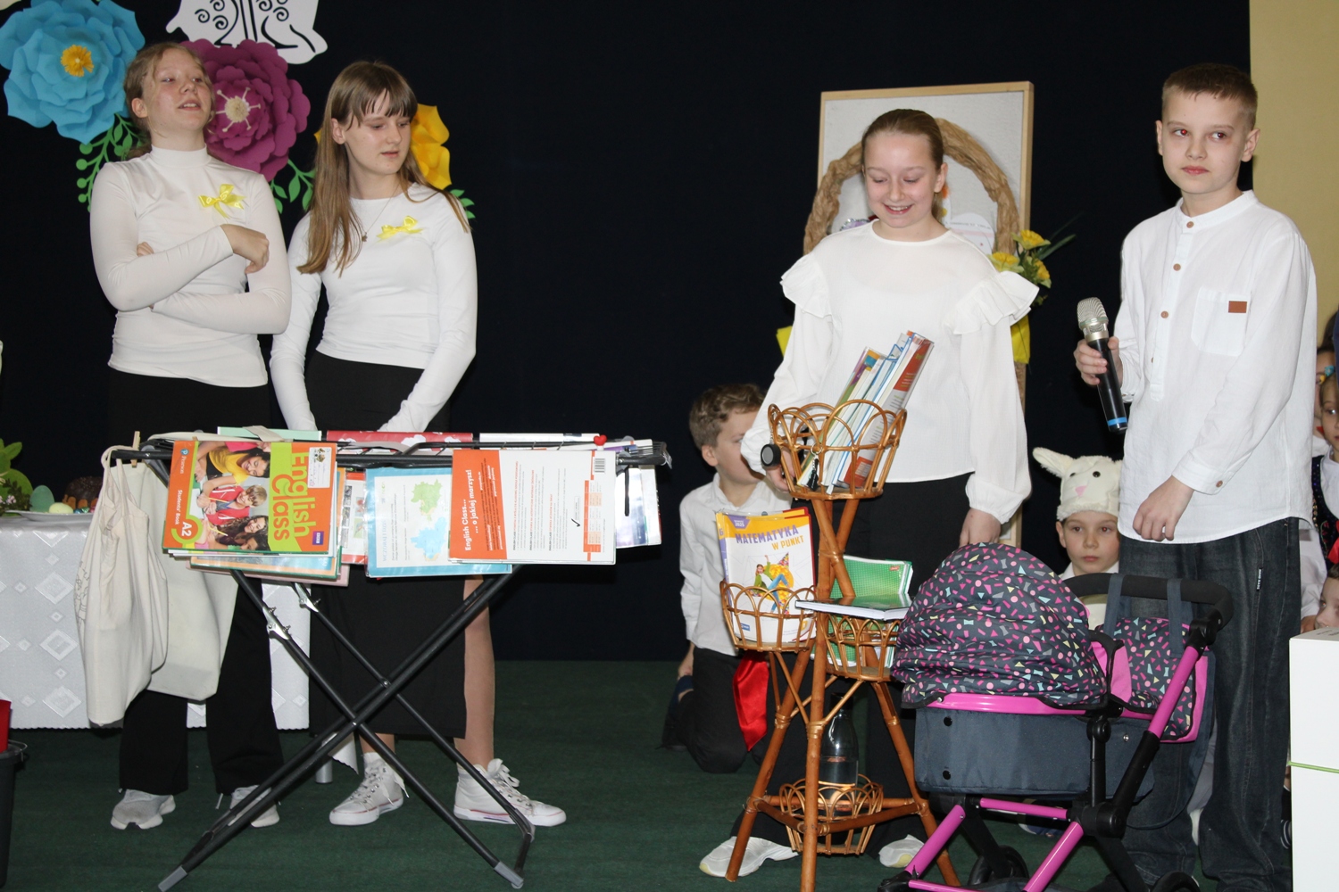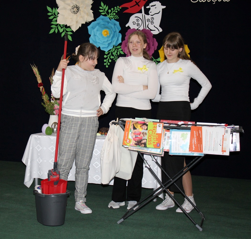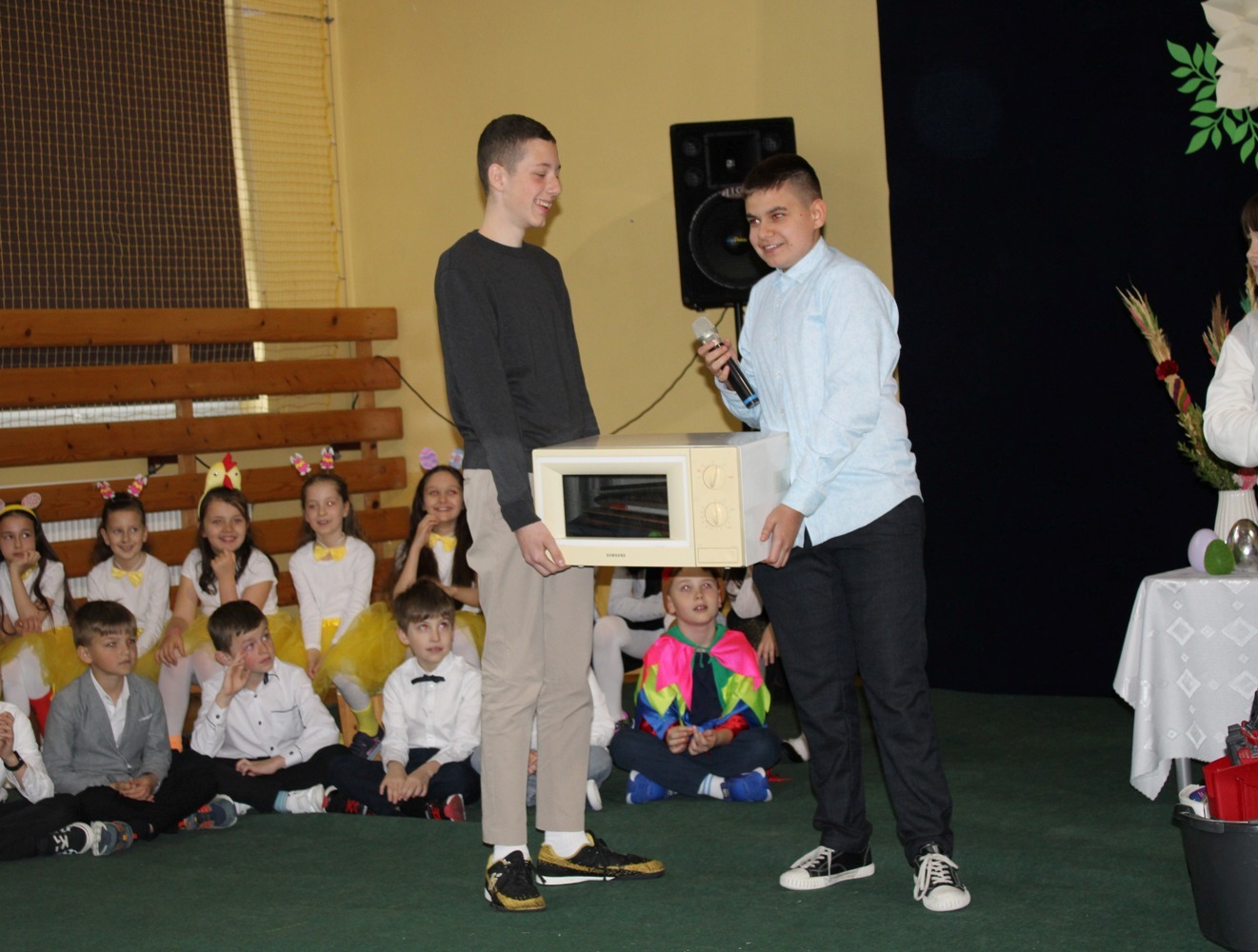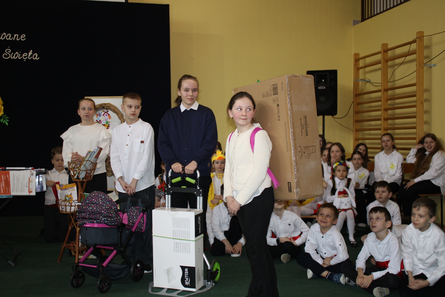 Przebiegała ona pod hasłem „Malowane Święta”. W zabawny, humorystyczny sposób przypomnieliśmy sobie świąteczne zwyczaje. Dowiedzieliśmy się czego symbolem są poszczególne pokarmy, które wkładamy do koszyka i niesiemy do święcenia. Powitaliśmy na scenie: zajączka, kurę z pisklakami, kolorowe pisanki, baranka… Każda z tych postaci miała coś ważnego do powiedzenia.