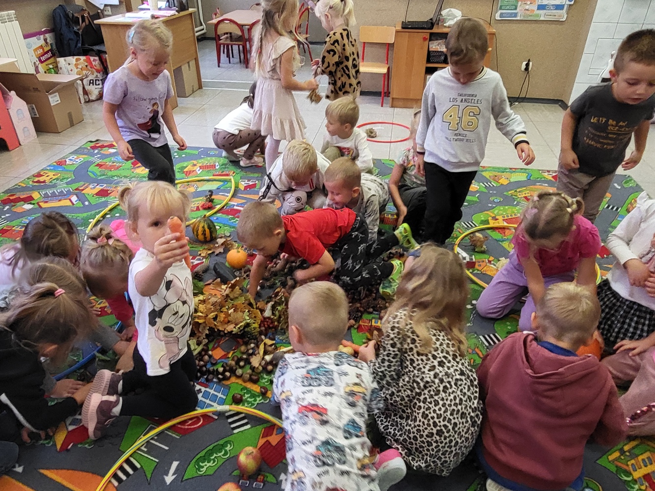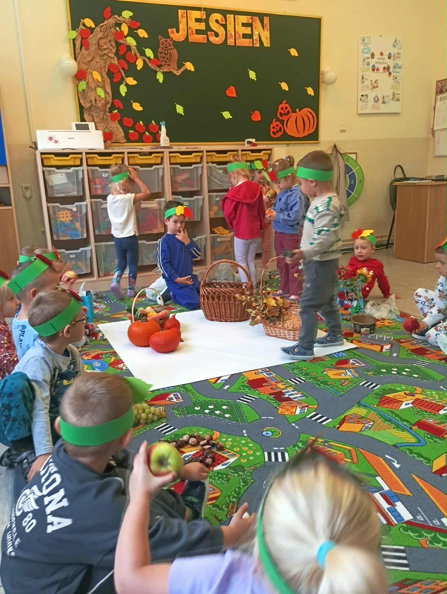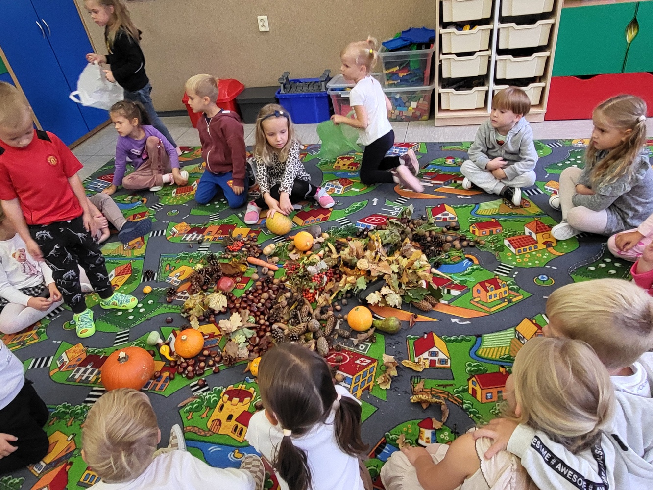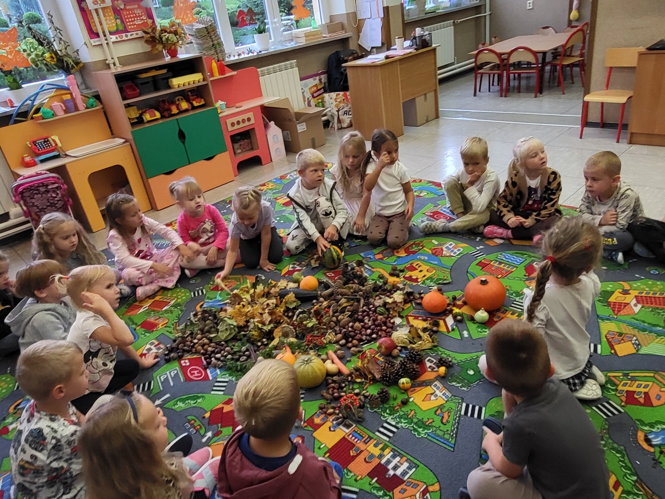 23 września to wyjątkowy dzień - Pierwszy Dzień Jesieni. To kolorowa i urokliwa pora roku. Tego dnia towarzyszyły nam kolory: żółty, brązowy, pomarańczowy, czerwony. Aby lepiej poznać tę porę roku przedszkolaki z wielkim zaciekawieniem oglądały dary od samej Pani Jesieni: kolorowe liście, czerwone jarzębiny, soczyste owoce oraz pachnące warzywa.