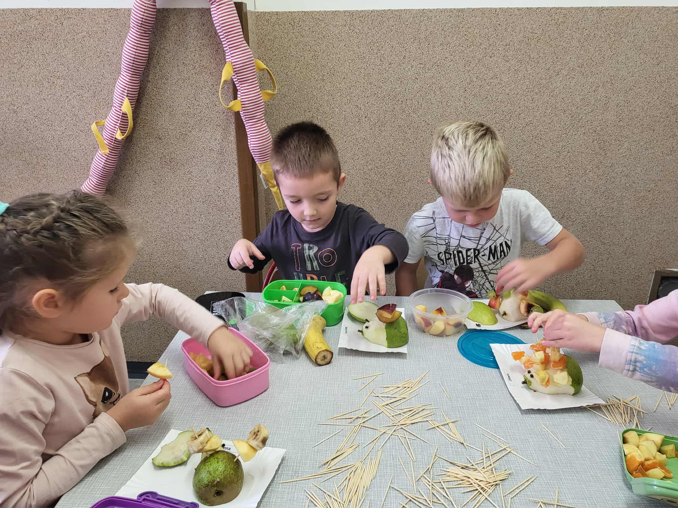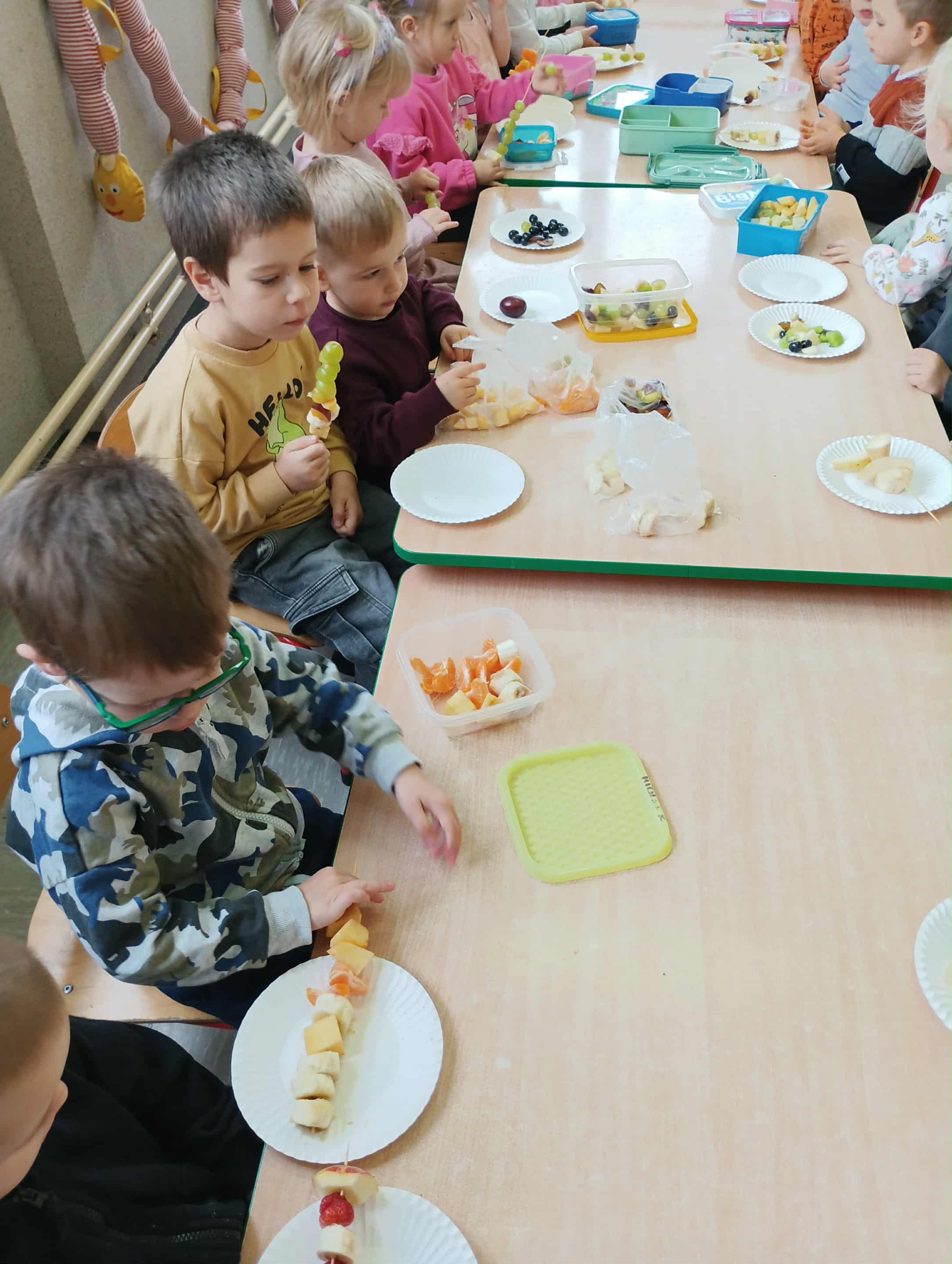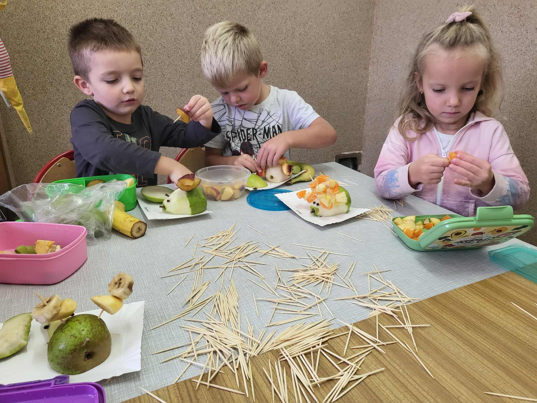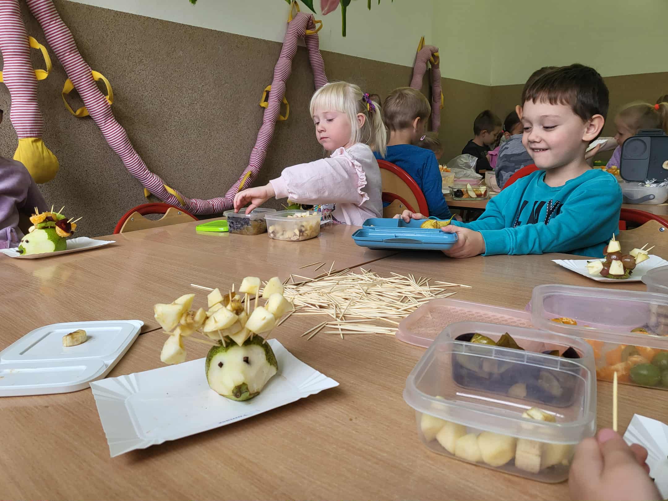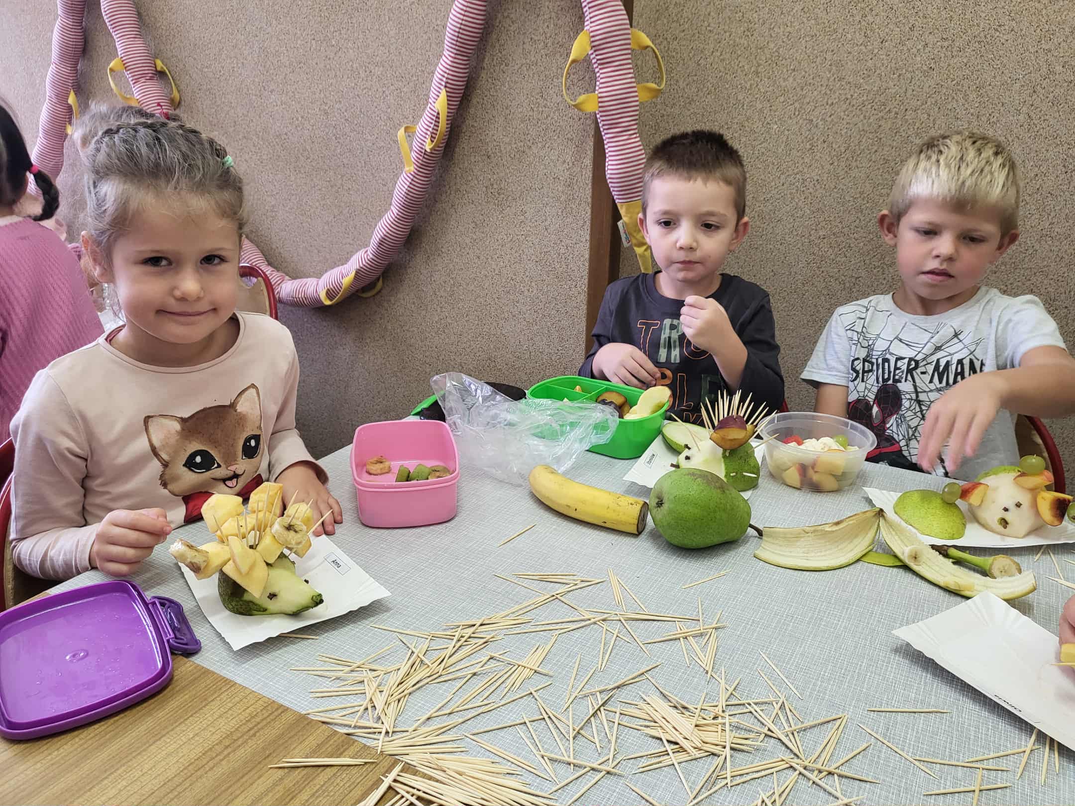 Sezon na pyszne owoce trwa! Nie zapominamy o tym także w przedszkolu. Każdy przedszkolak już wie, jak ważne są dla nas owoce – nie tylko dlatego, że są smaczne, ale przede wszystkim – zawierają mnóstwo witamin, które chronią i wzmacniają nasz organizm. Dlatego też dzieci postanowiły zrobić pyszne i zdrowe szaszłyki owocowe oraz jesienne owocowe jeżyki. Nie zabrakło również pysznego, świeżo wyciskanego soku jabłkowego. Przed przygotowaniem szaszłyków i jeżyków dzieci umyły owoce, przybory kuchenne, a także rączki. Ach, co to była za uczta! Głównym celem zajęć było zachęcenie dzieci do spożywania owoców i warzyw. Podczas zajęć przedszkolaki utrwaliły wiadomości na temat zdrowego stylu, poznały piramidę zdrowia oraz wpływ owoców i warzyw na zdrowie. Były również zabawy dydaktyczne oraz zabawy muzyczno – ruchowe przy piosenkach o tematyce owoców i warzyw.