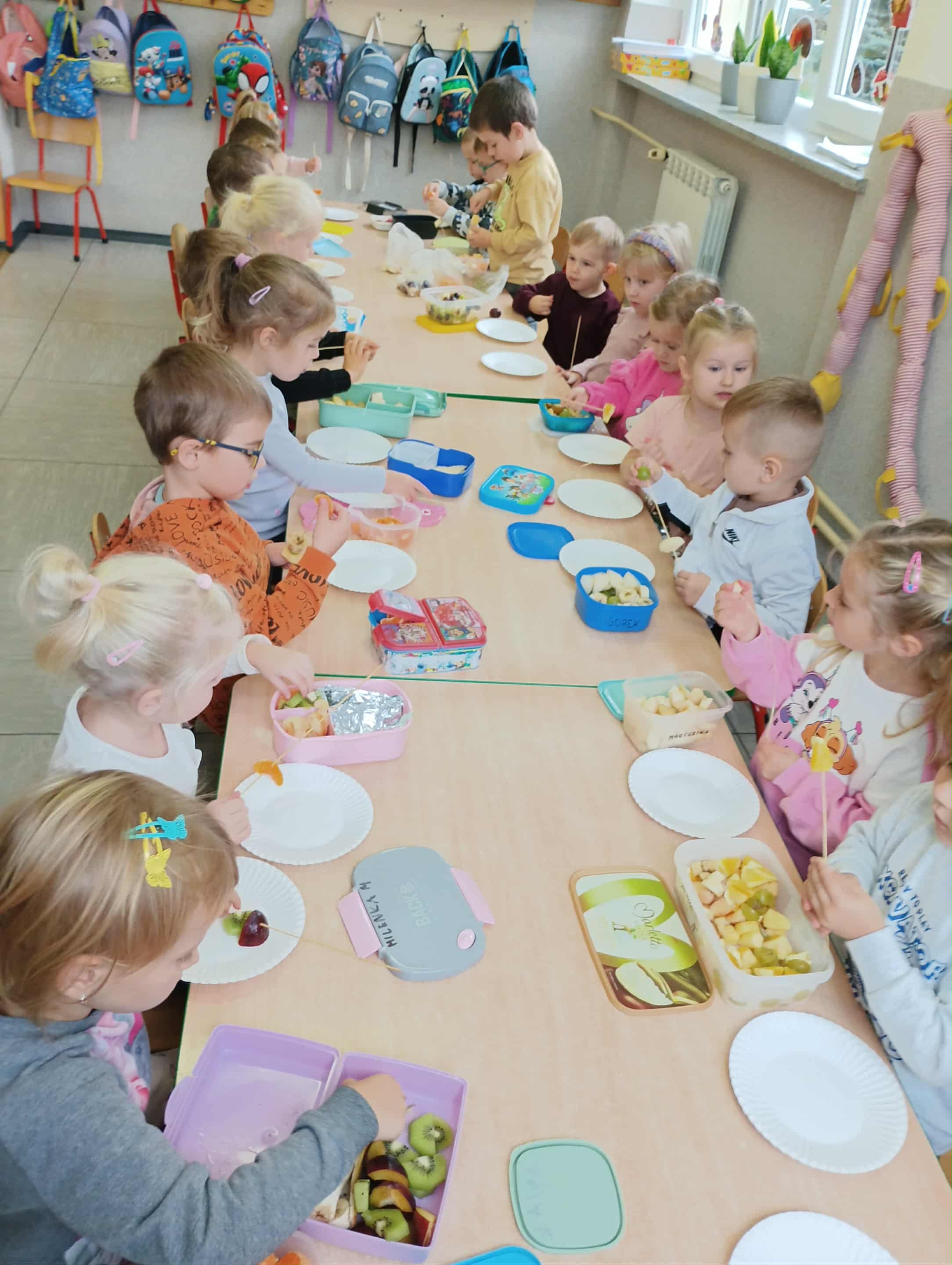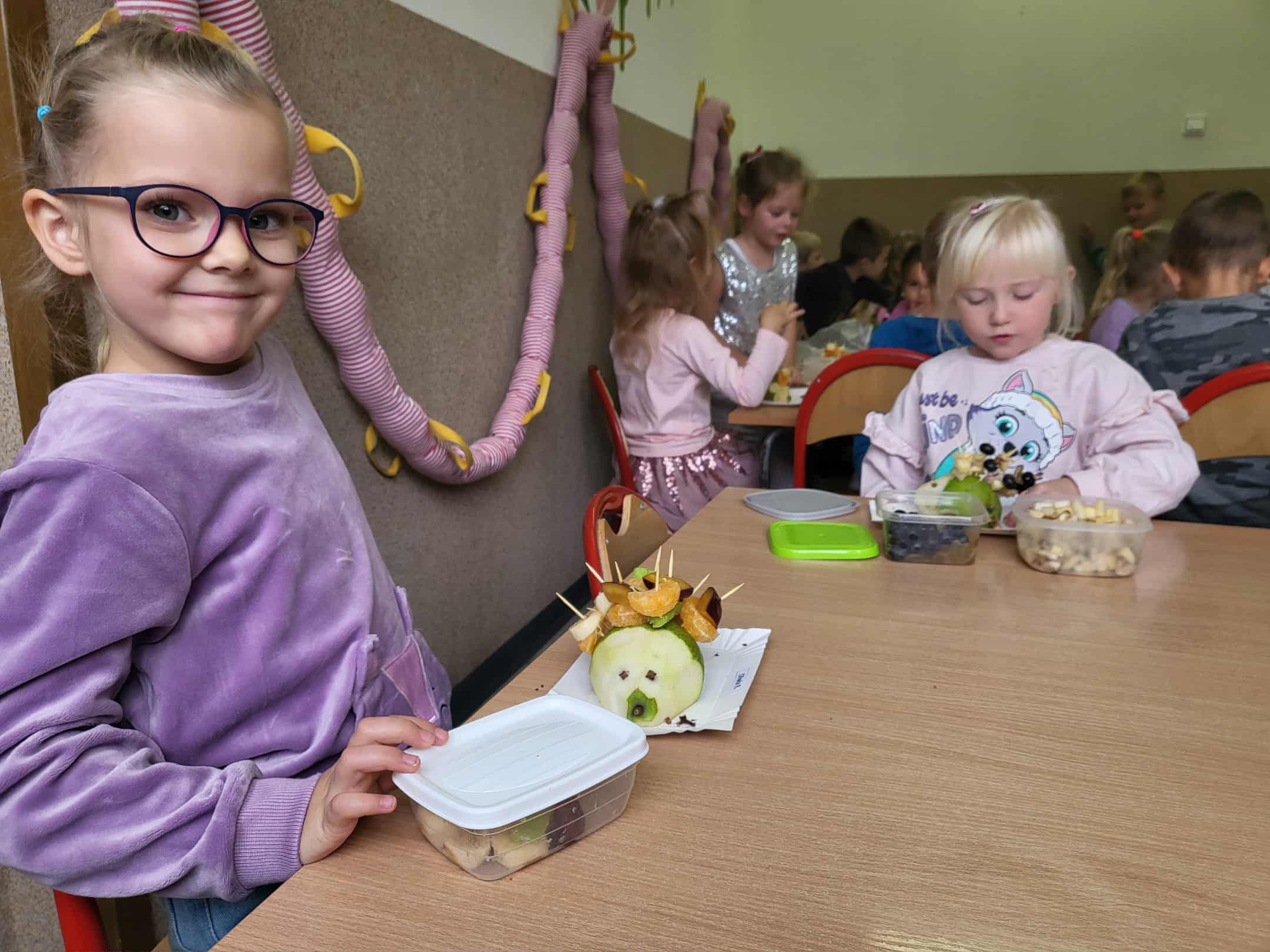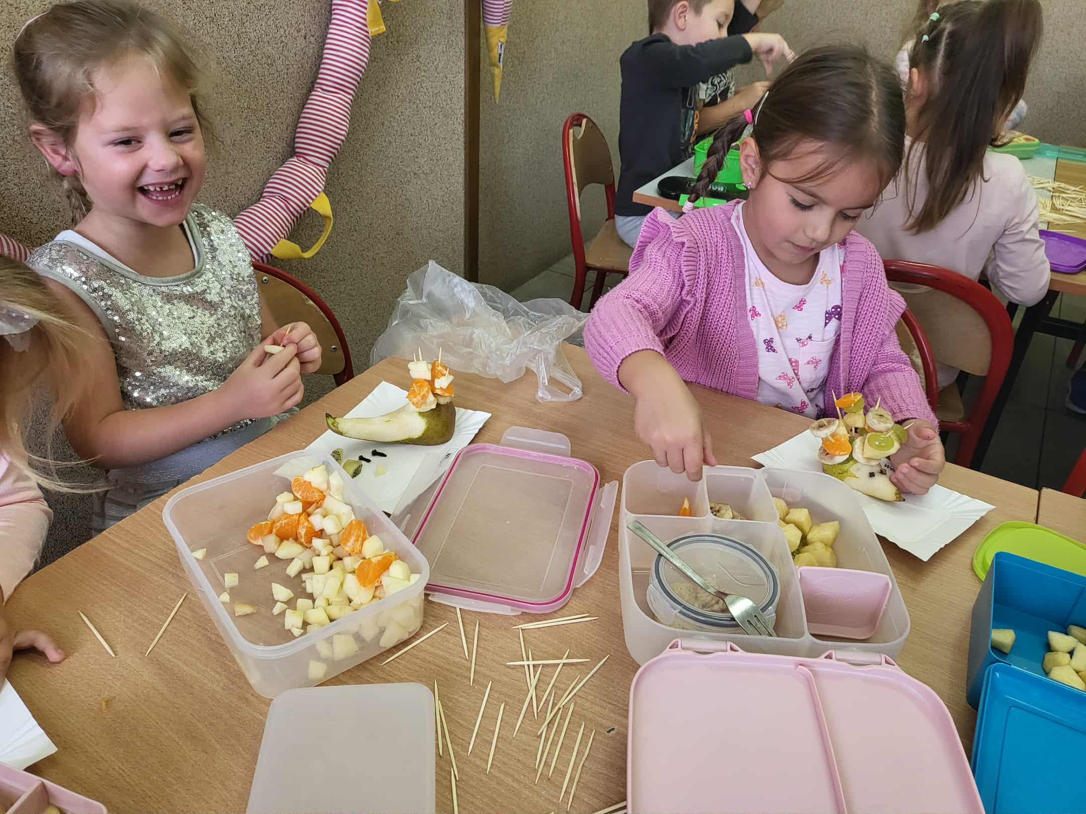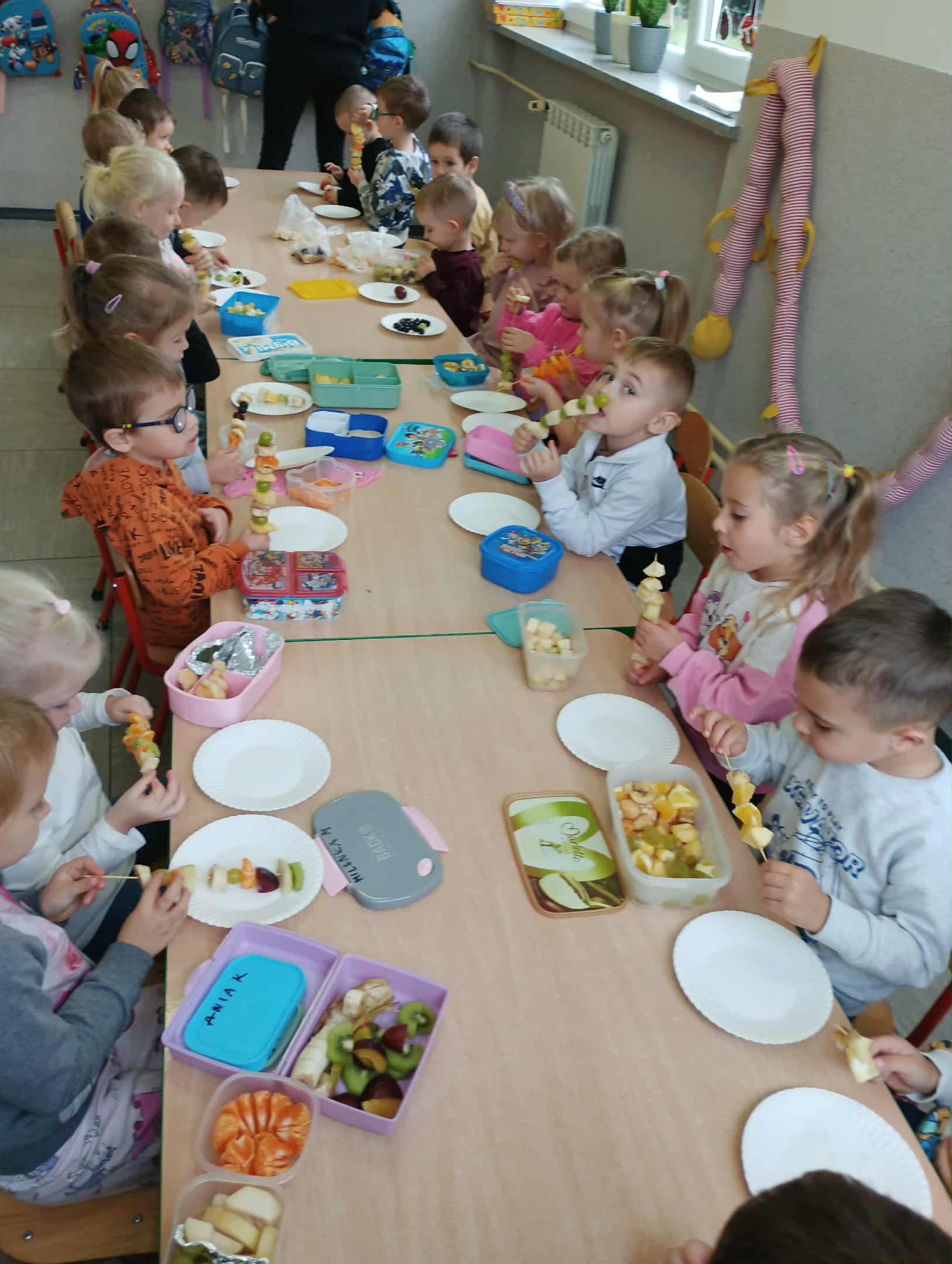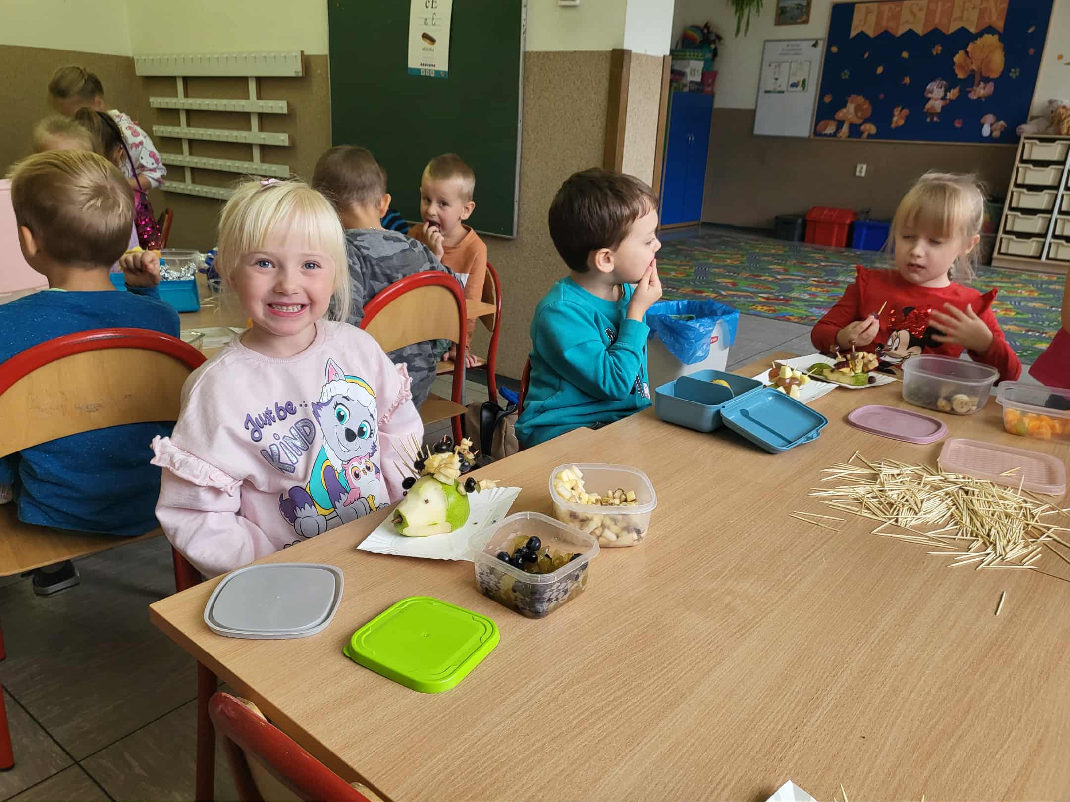 Sezon na pyszne owoce trwa! Nie zapominamy o tym także w przedszkolu. Każdy przedszkolak już wie, jak ważne są dla nas owoce – nie tylko dlatego, że są smaczne, ale przede wszystkim – zawierają mnóstwo witamin, które chronią i wzmacniają nasz organizm. Dlatego też dzieci postanowiły zrobić pyszne i zdrowe szaszłyki owocowe oraz jesienne owocowe jeżyki. Nie zabrakło również pysznego, świeżo wyciskanego soku jabłkowego. Przed przygotowaniem szaszłyków i jeżyków dzieci umyły owoce, przybory kuchenne, a także rączki. Ach, co to była za uczta! Głównym celem zajęć było zachęcenie dzieci do spożywania owoców i warzyw. Podczas zajęć przedszkolaki utrwaliły wiadomości na temat zdrowego stylu, poznały piramidę zdrowia oraz wpływ owoców i warzyw na zdrowie. Były również zabawy dydaktyczne oraz zabawy muzyczno – ruchowe przy piosenkach o tematyce owoców i warzyw.