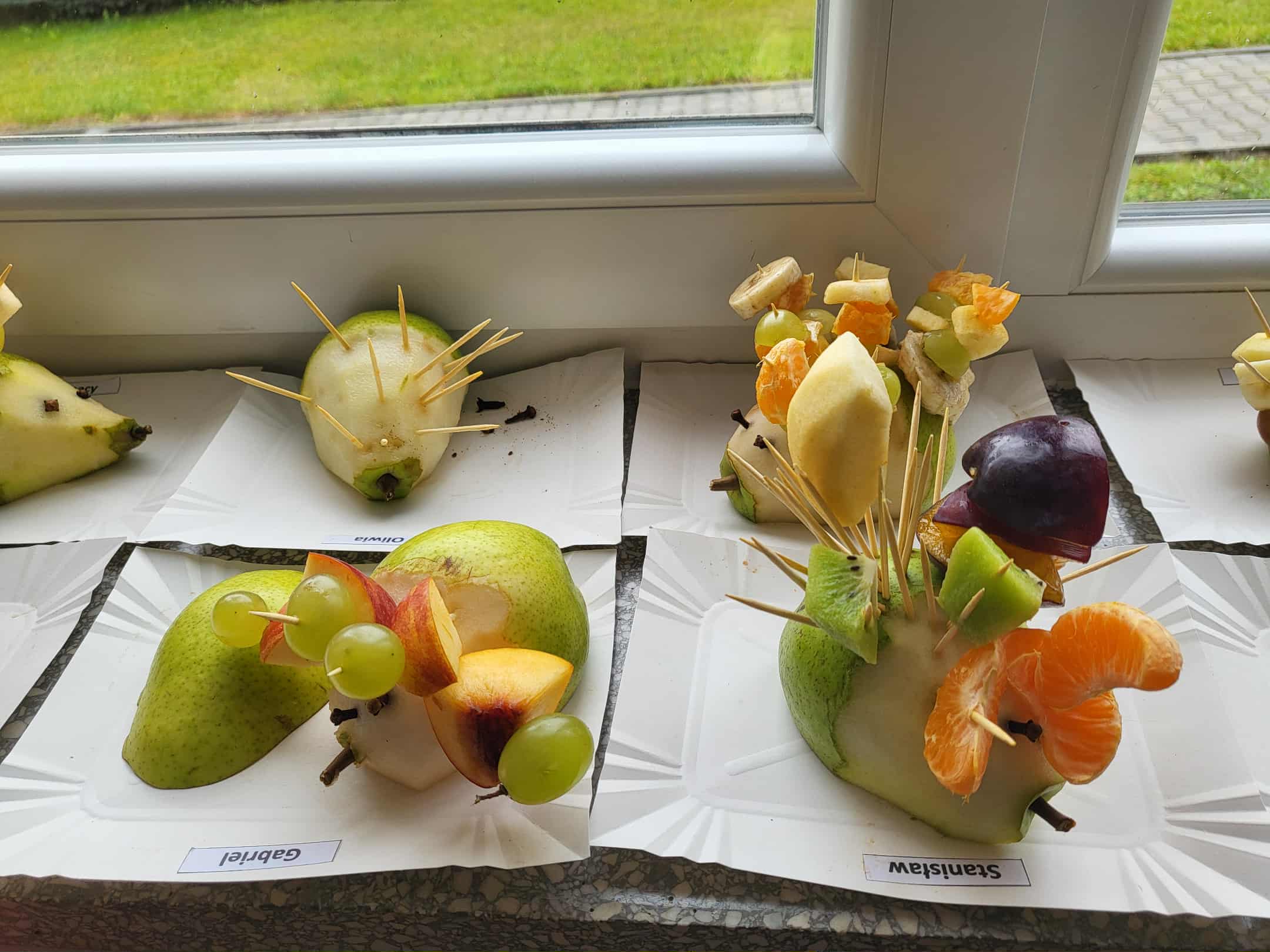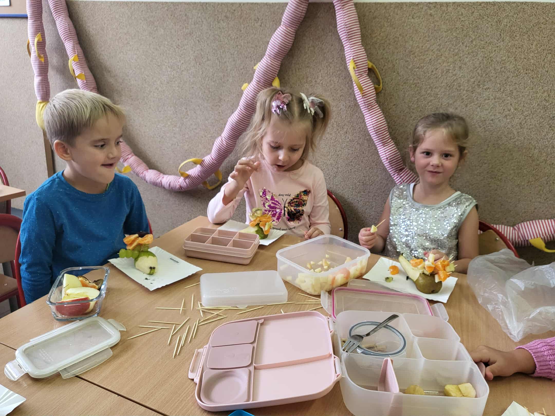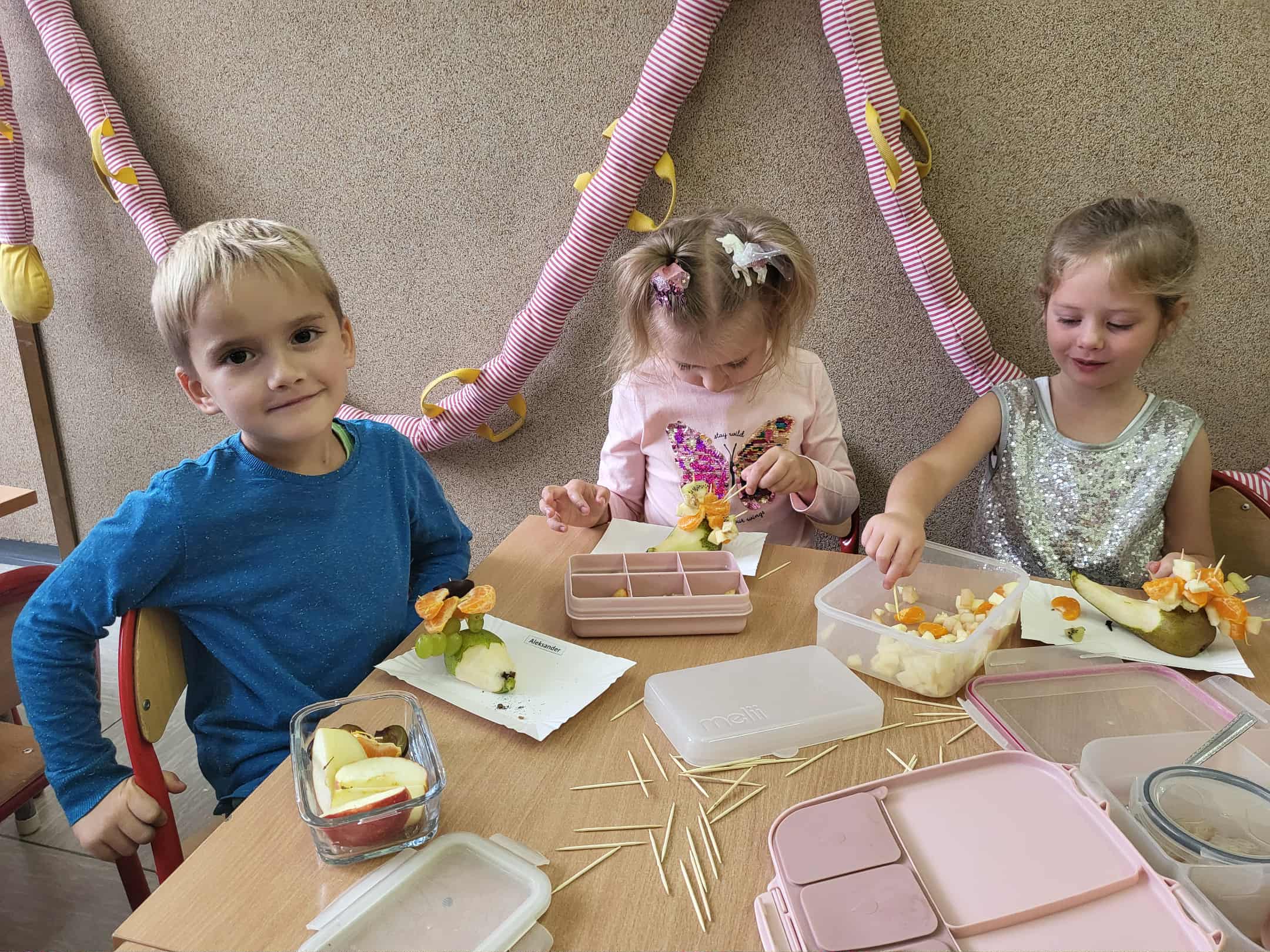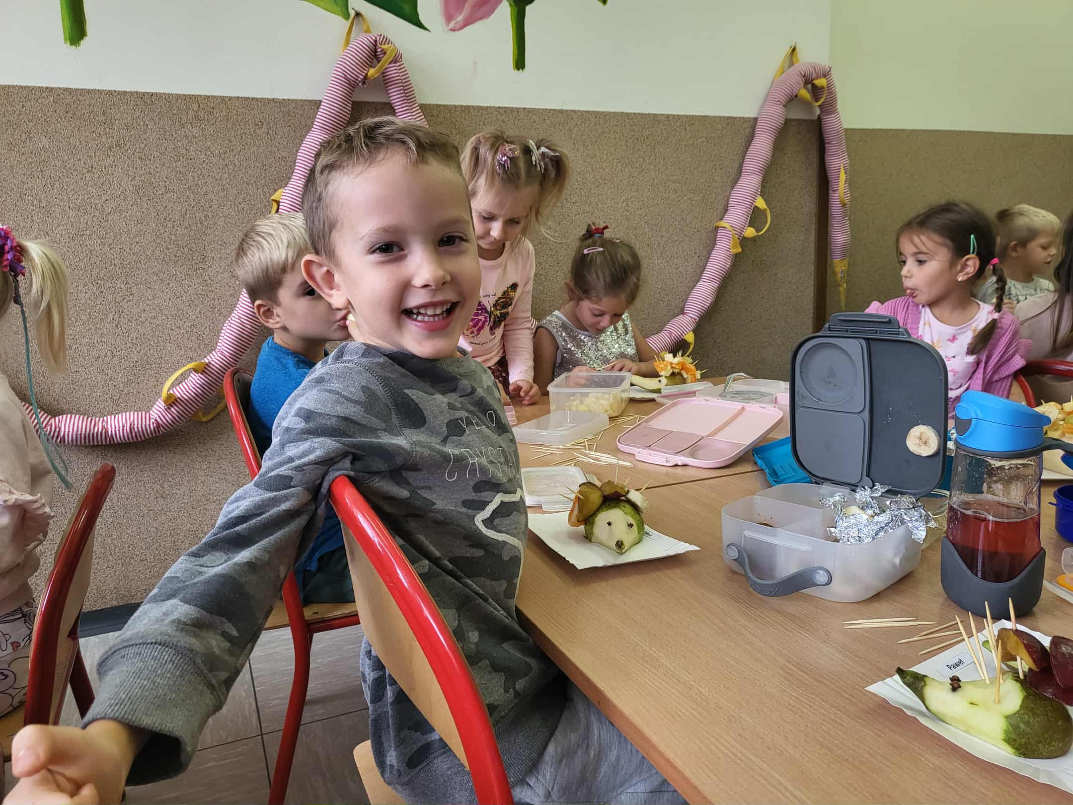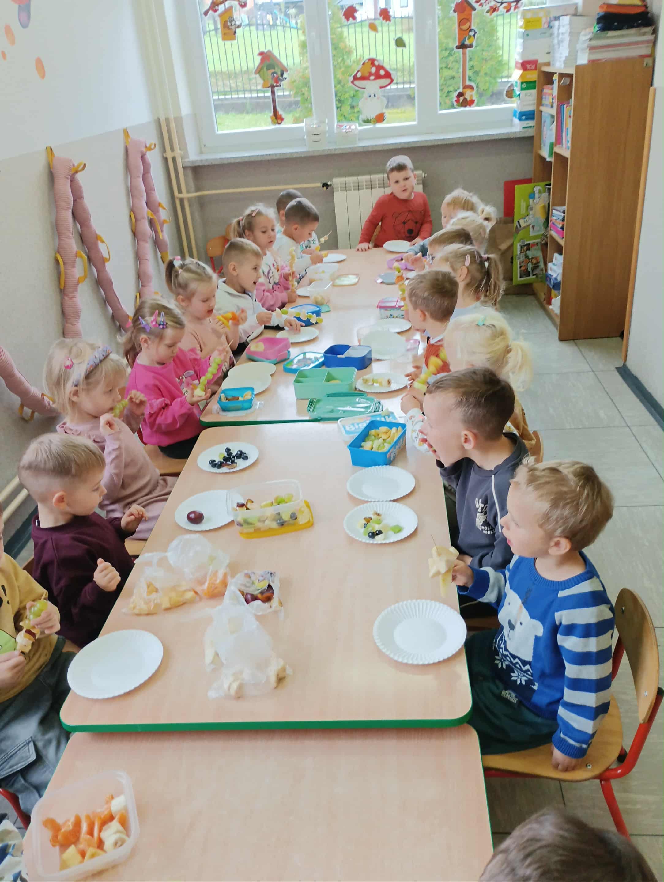 Sezon na pyszne owoce trwa! Nie zapominamy o tym także w przedszkolu. Każdy przedszkolak już wie, jak ważne są dla nas owoce – nie tylko dlatego, że są smaczne, ale przede wszystkim – zawierają mnóstwo witamin, które chronią i wzmacniają nasz organizm. Dlatego też dzieci postanowiły zrobić pyszne i zdrowe szaszłyki owocowe oraz jesienne owocowe jeżyki. Nie zabrakło również pysznego, świeżo wyciskanego soku jabłkowego. Przed przygotowaniem szaszłyków i jeżyków dzieci umyły owoce, przybory kuchenne, a także rączki. Ach, co to była za uczta! Głównym celem zajęć było zachęcenie dzieci do spożywania owoców i warzyw. Podczas zajęć przedszkolaki utrwaliły wiadomości na temat zdrowego stylu, poznały piramidę zdrowia oraz wpływ owoców i warzyw na zdrowie. Były również zabawy dydaktyczne oraz zabawy muzyczno – ruchowe przy piosenkach o tematyce owoców i warzyw.