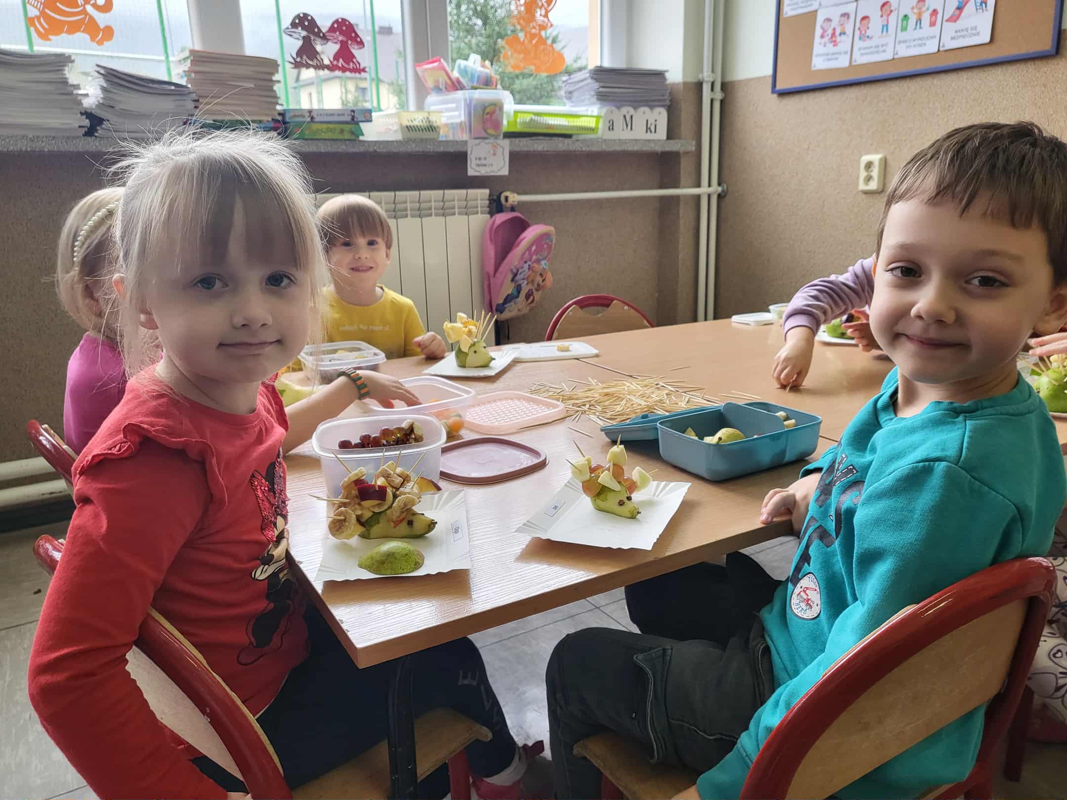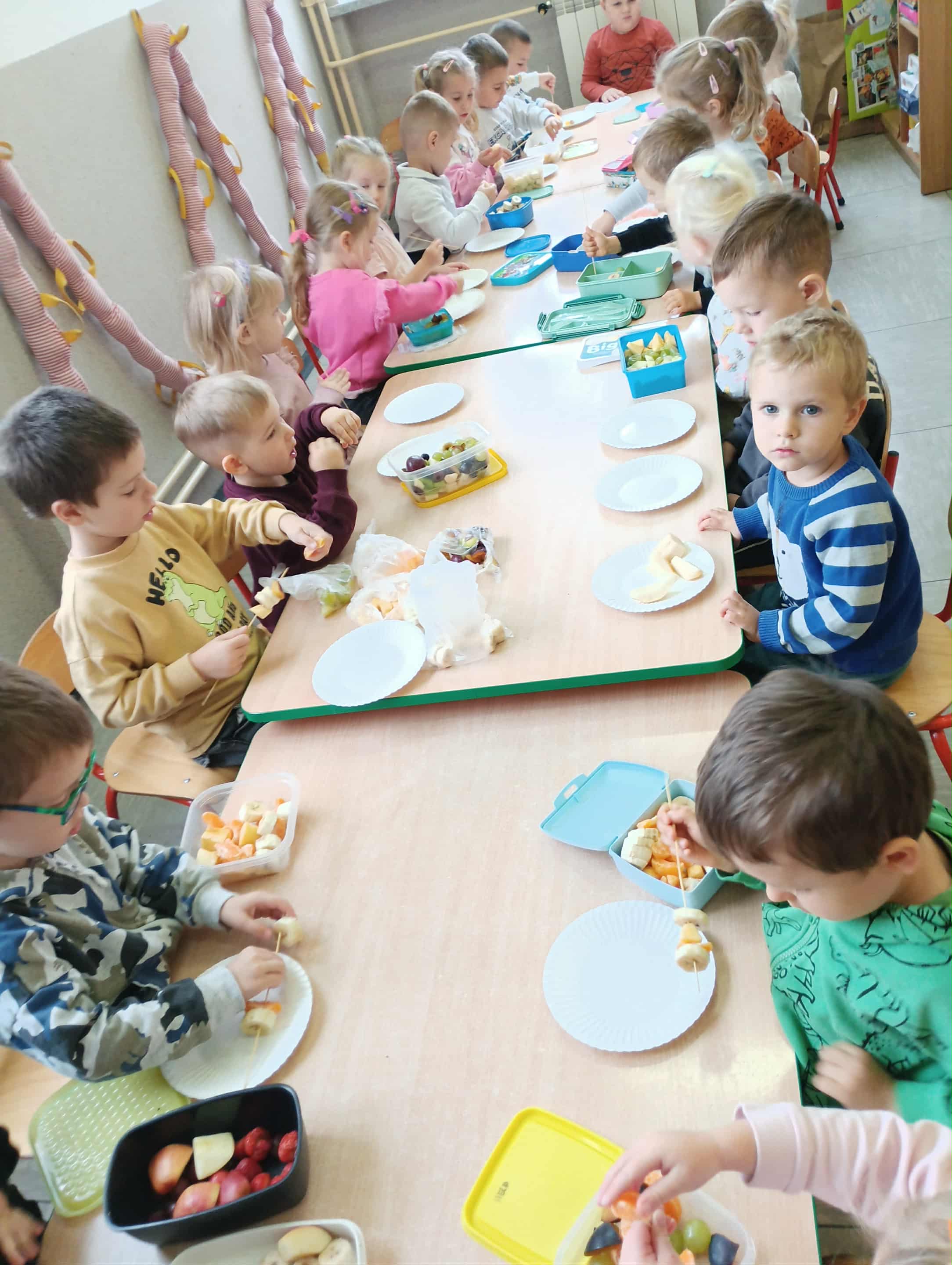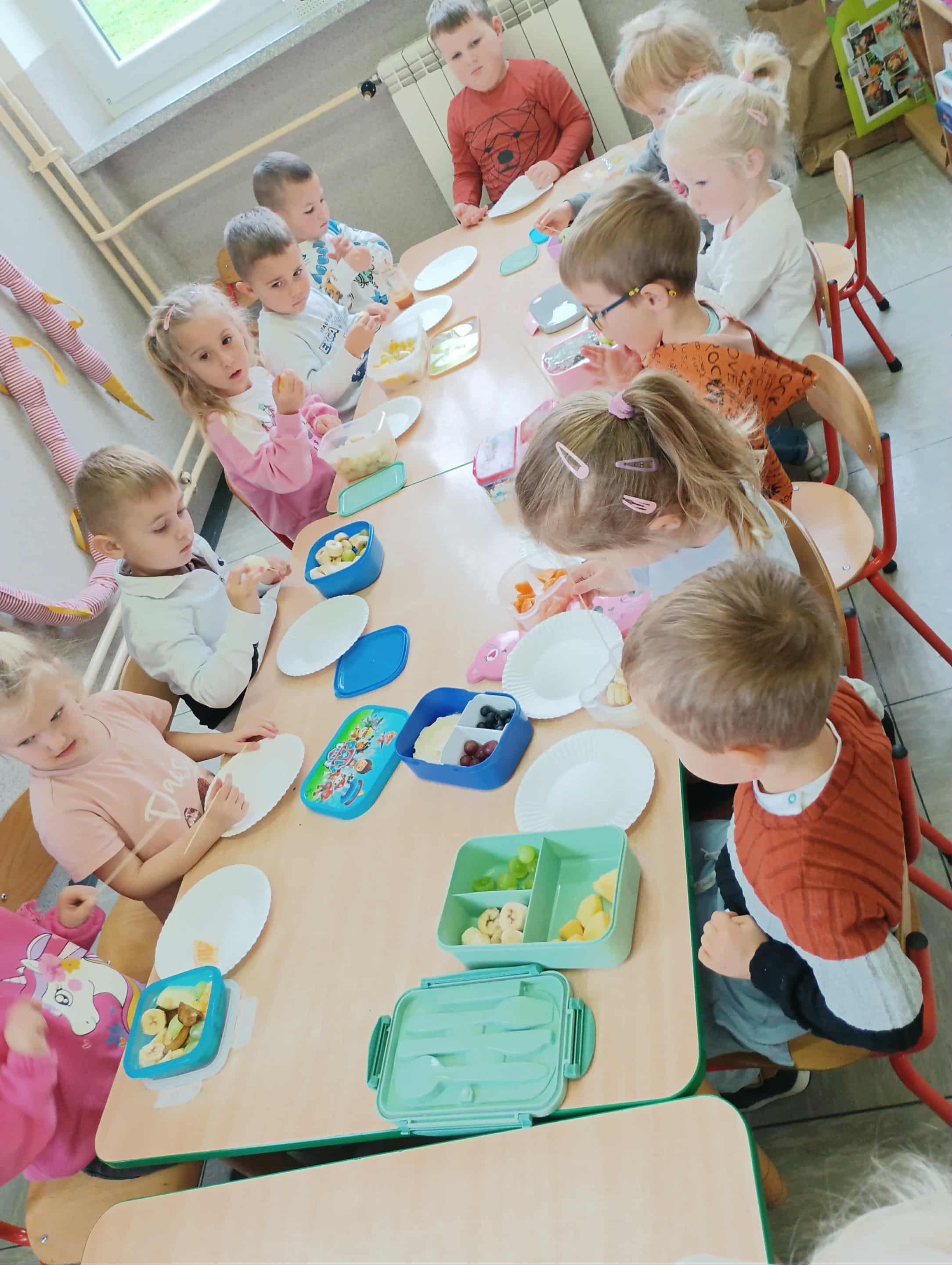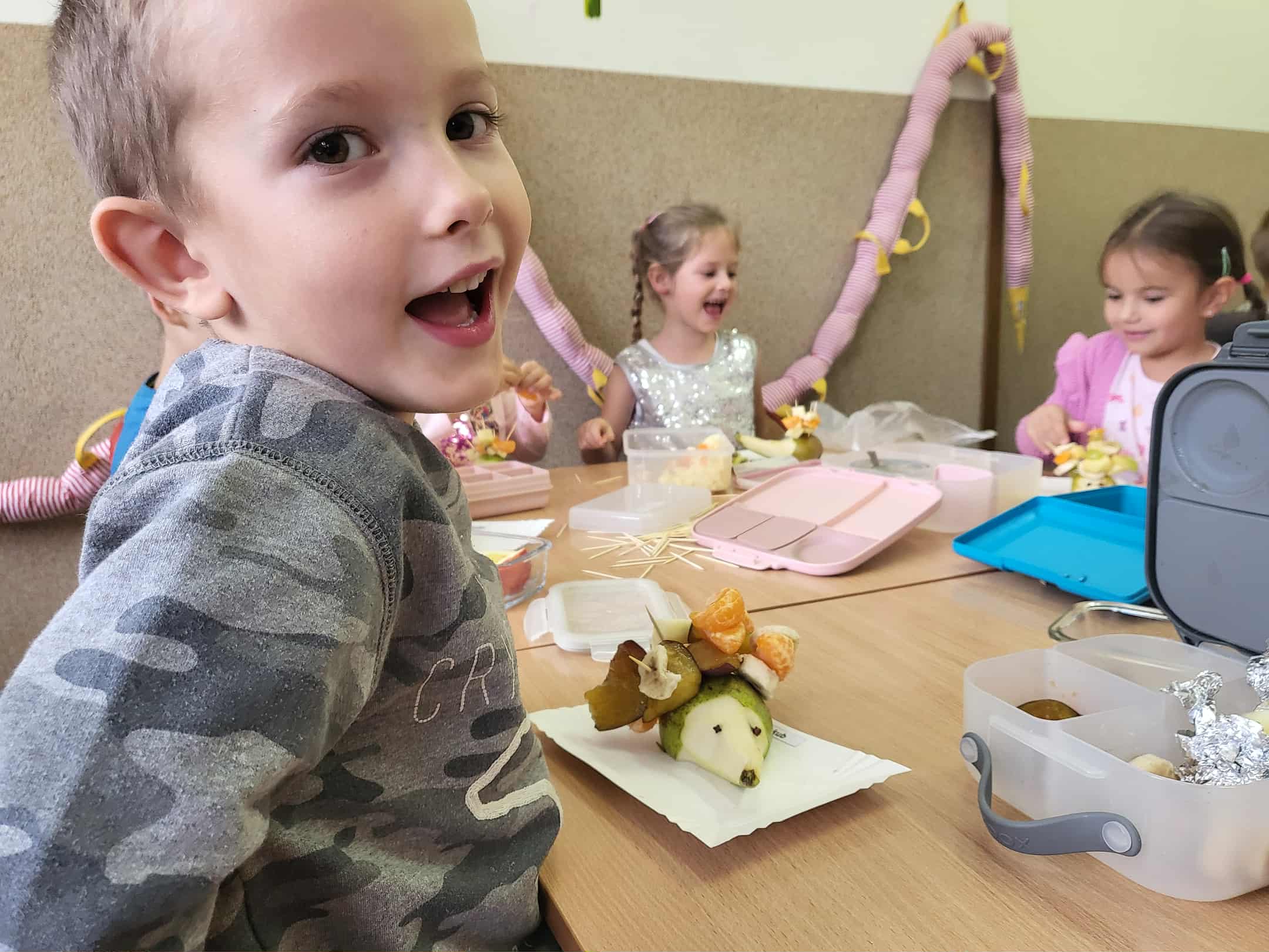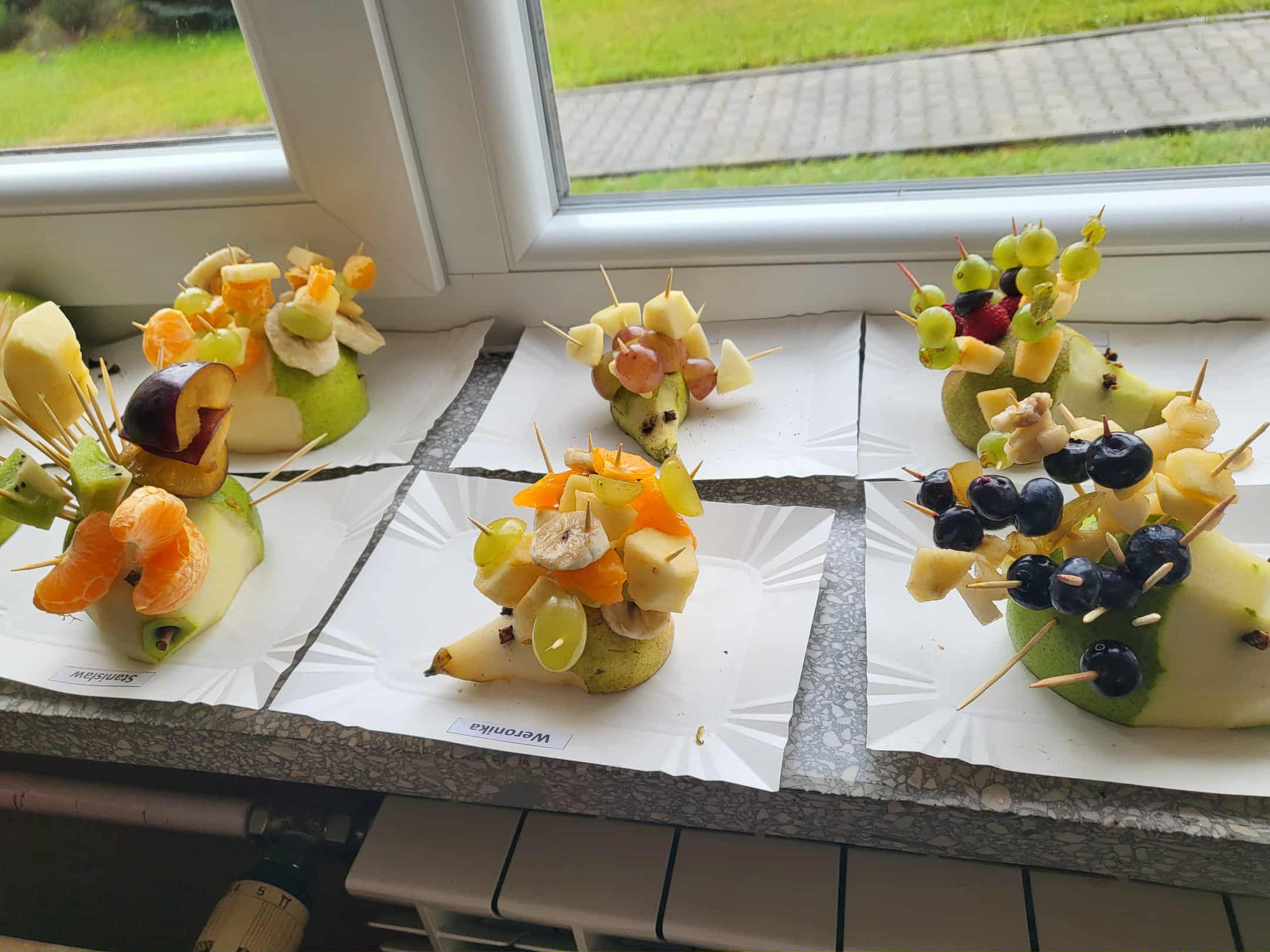 Sezon na pyszne owoce trwa! Nie zapominamy o tym także w przedszkolu. Każdy przedszkolak już wie, jak ważne są dla nas owoce – nie tylko dlatego, że są smaczne, ale przede wszystkim – zawierają mnóstwo witamin, które chronią i wzmacniają nasz organizm. Dlatego też dzieci postanowiły zrobić pyszne i zdrowe szaszłyki owocowe oraz jesienne owocowe jeżyki. Nie zabrakło również pysznego, świeżo wyciskanego soku jabłkowego. Przed przygotowaniem szaszłyków i jeżyków dzieci umyły owoce, przybory kuchenne, a także rączki. Ach, co to była za uczta! Głównym celem zajęć było zachęcenie dzieci do spożywania owoców i warzyw. Podczas zajęć przedszkolaki utrwaliły wiadomości na temat zdrowego stylu, poznały piramidę zdrowia oraz wpływ owoców i warzyw na zdrowie. Były również zabawy dydaktyczne oraz zabawy muzyczno – ruchowe przy piosenkach o tematyce owoców i warzyw.
