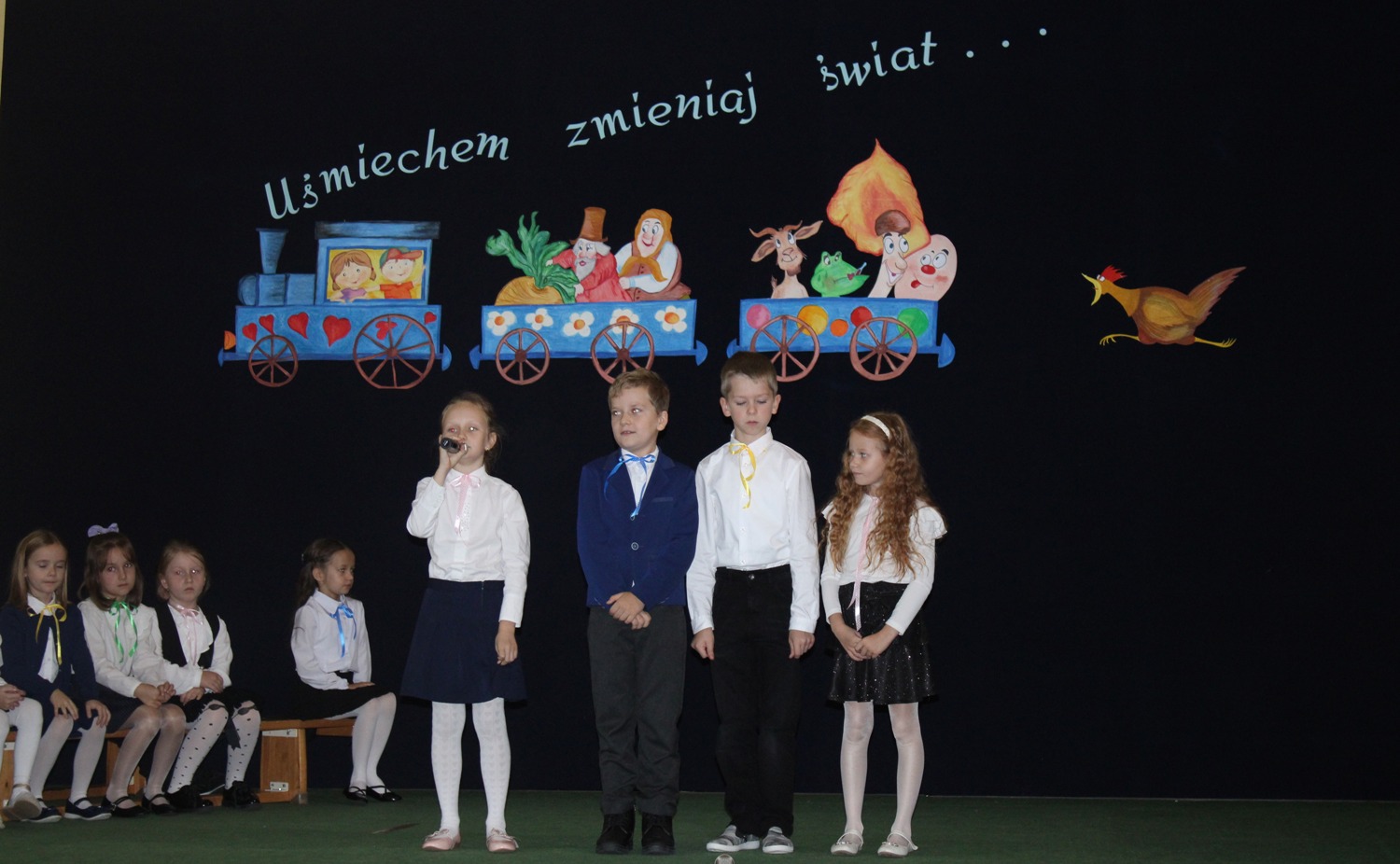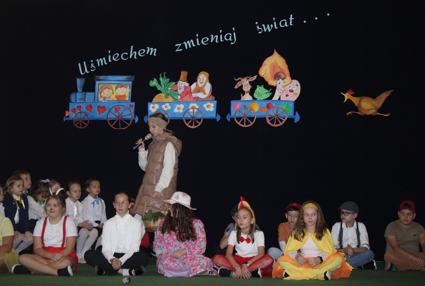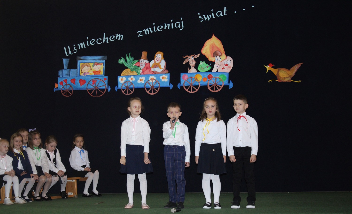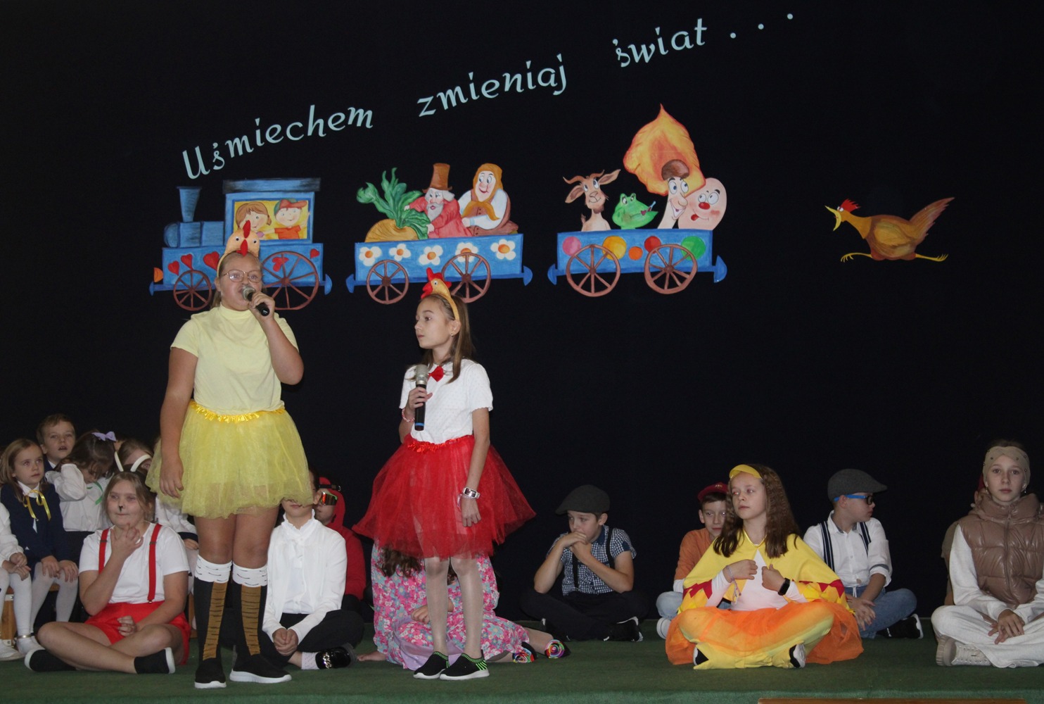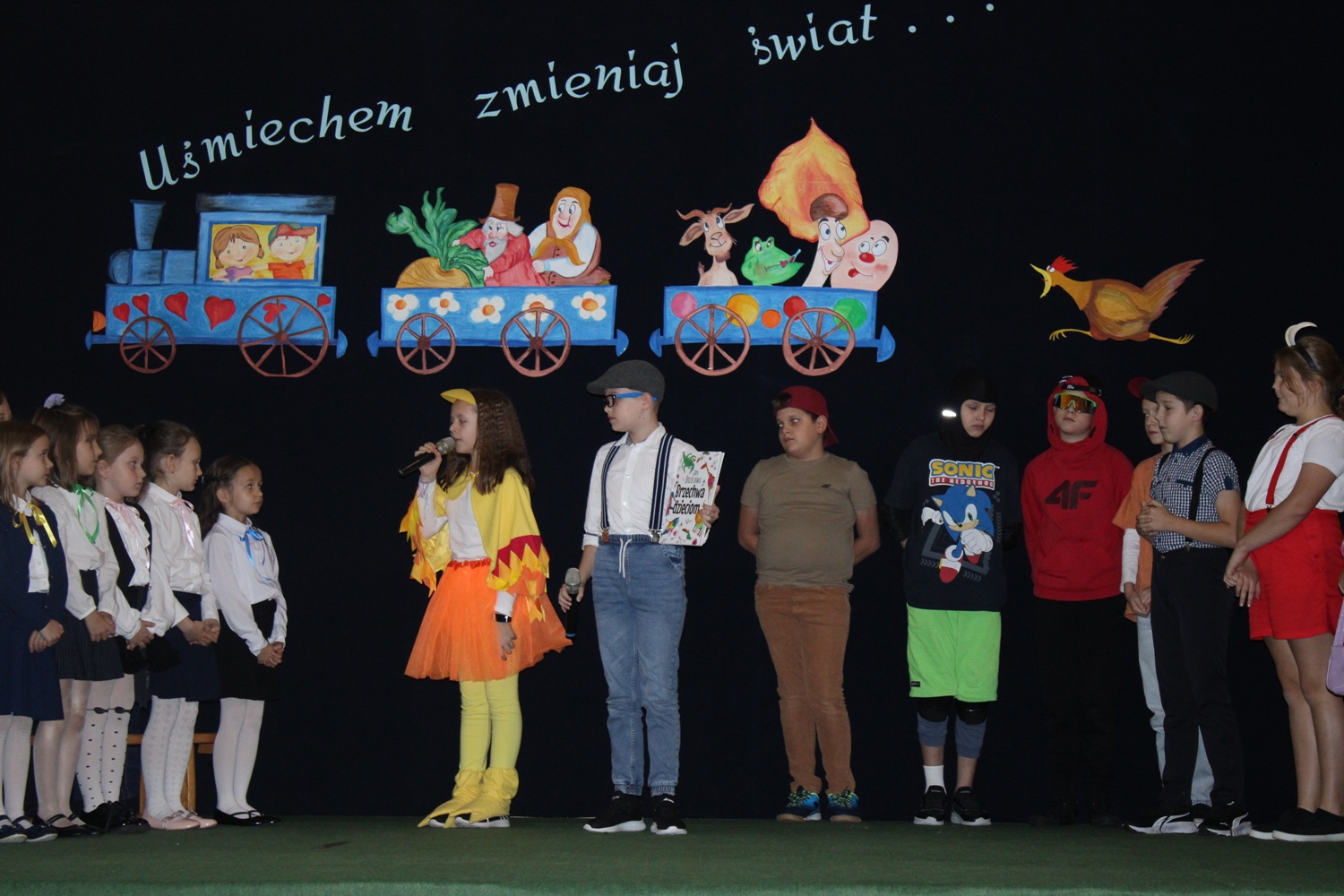 Na scenie wystąpili uczniowie klasy piątej i ósmej. Wprowadzili zebranych w cudowny, fantastyczny świat baśni i bajek. Udowodnili, że warto marzyć, mieć plany na przyszłość, rozwijać swoje talenty, a czytanie książek, to sposób na pobudzanie wyobraźni. Przypomnieli twórczość Jana Brzechwy.