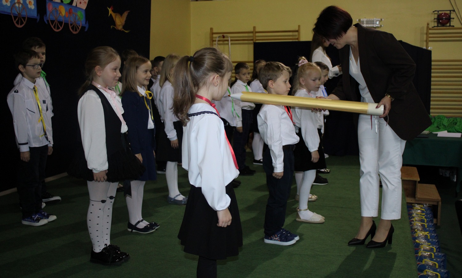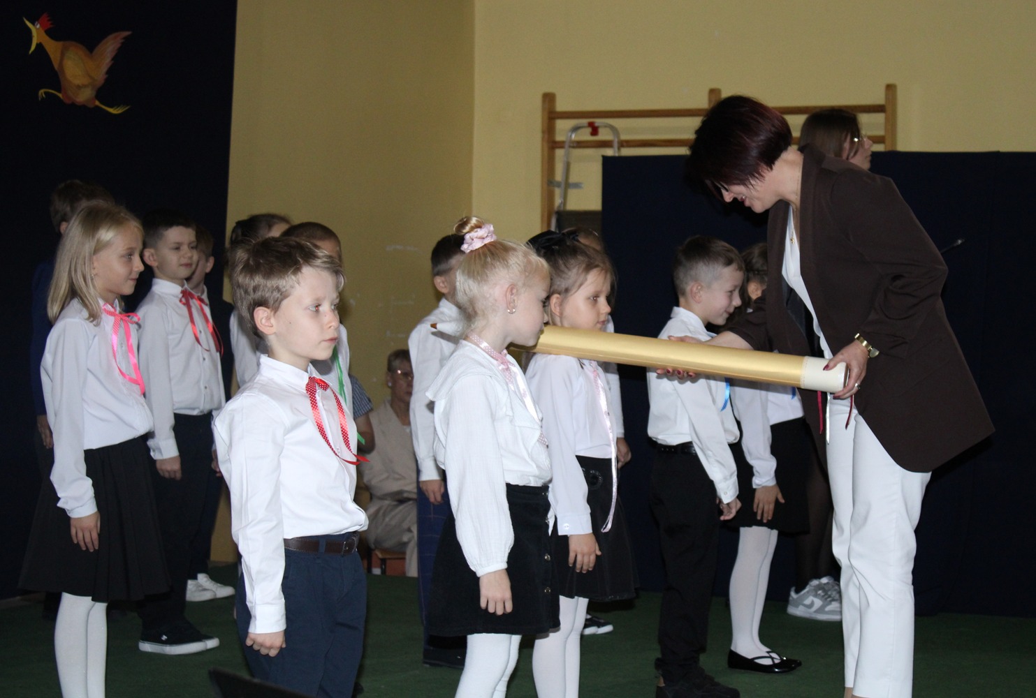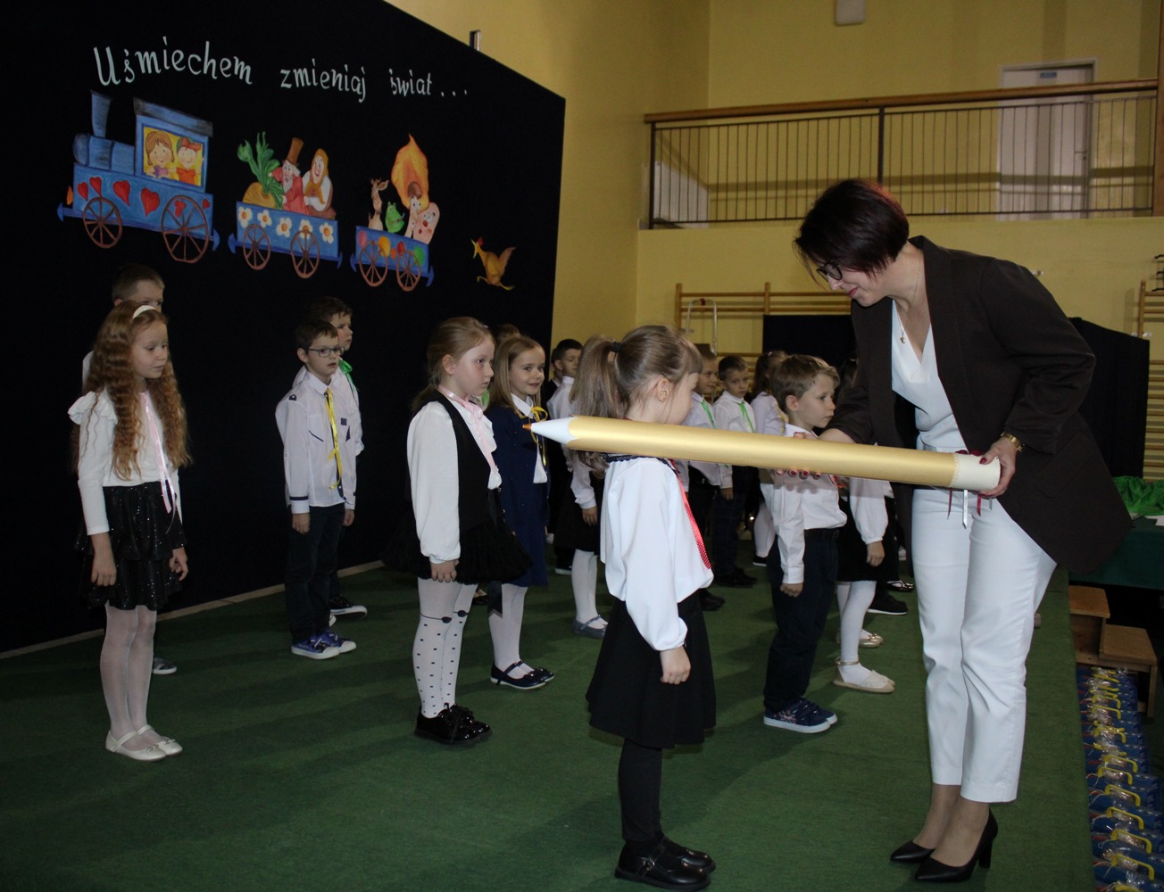 Następnie pierwszoklasiści ślubowali na sztandar szkoły i zostali pasowani przez Panią Dyrektor Magdalenę Gierę na uczniów. Złożyli „symboliczny” podpis w Księdze Pamiątkowej, odbijają paluszek. Dzieci wykazały się dużą wiedzą i licznymi umiejętnościami: recytowały , śpiewały, odpowiadały na pytania…