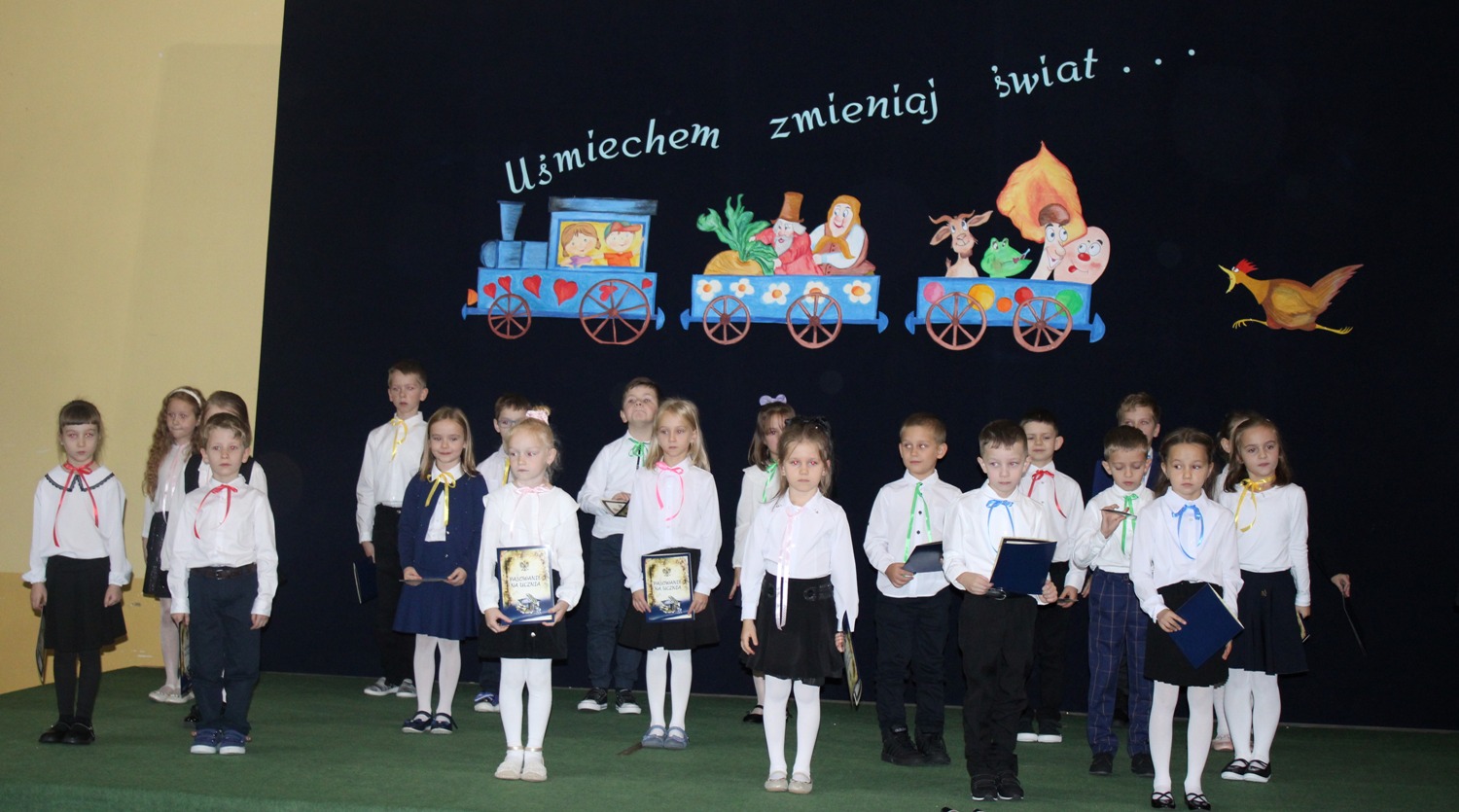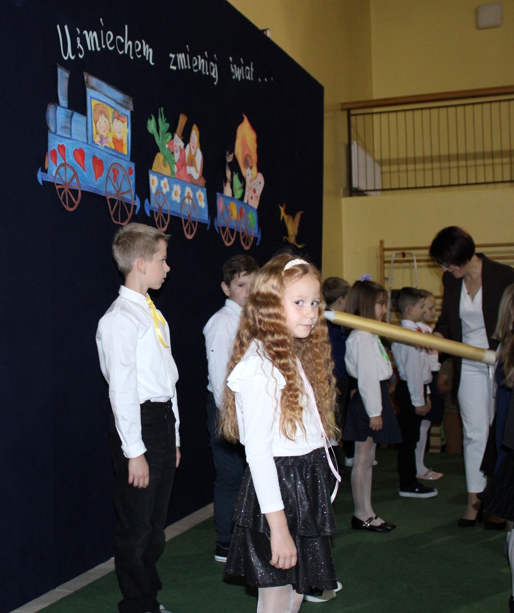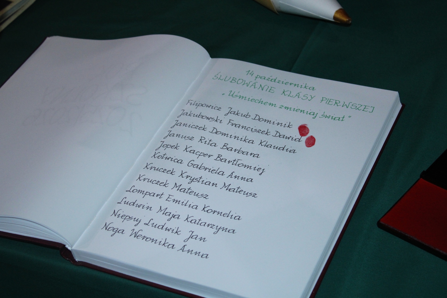 Następnie pierwszoklasiści ślubowali na sztandar szkoły i zostali pasowani przez Panią Dyrektor Magdalenę Gierę na uczniów. Złożyli „symboliczny” podpis w Księdze Pamiątkowej, odbijają paluszek. Dzieci wykazały się dużą wiedzą i licznymi umiejętnościami: recytowały , śpiewały, odpowiadały na pytania…