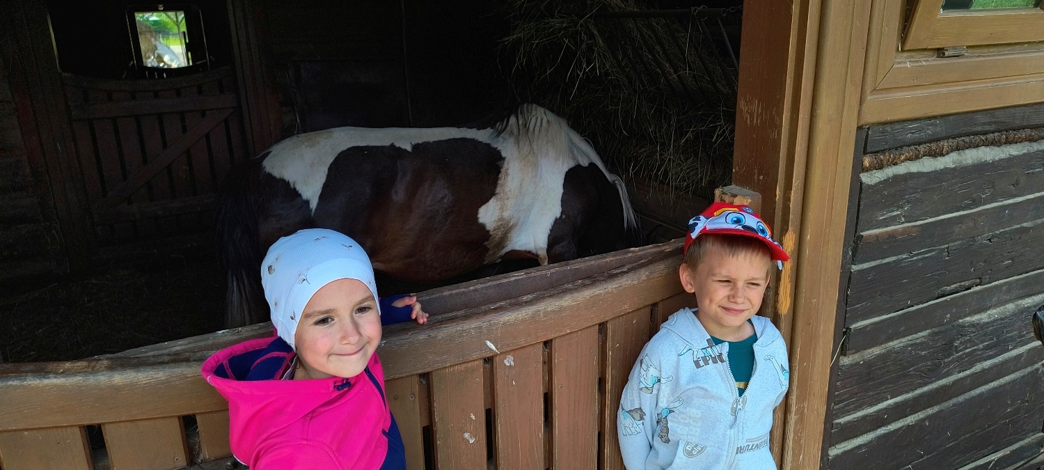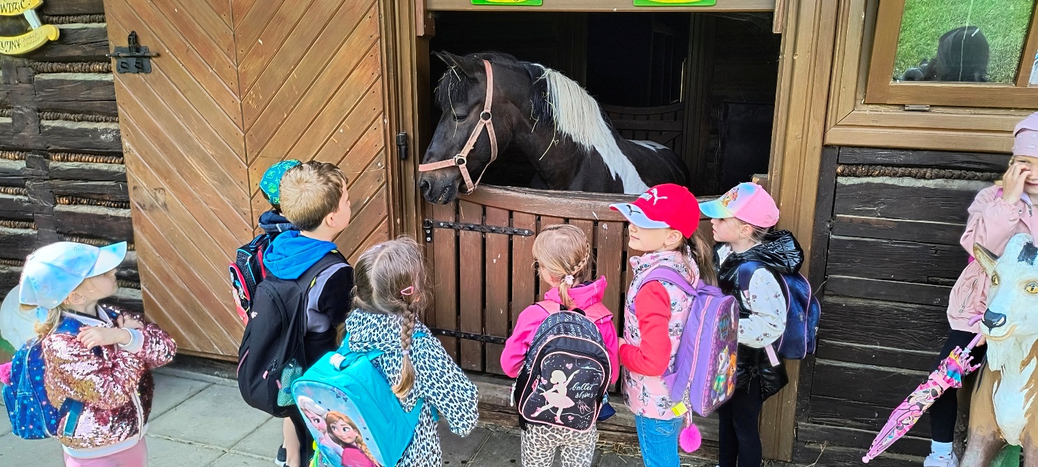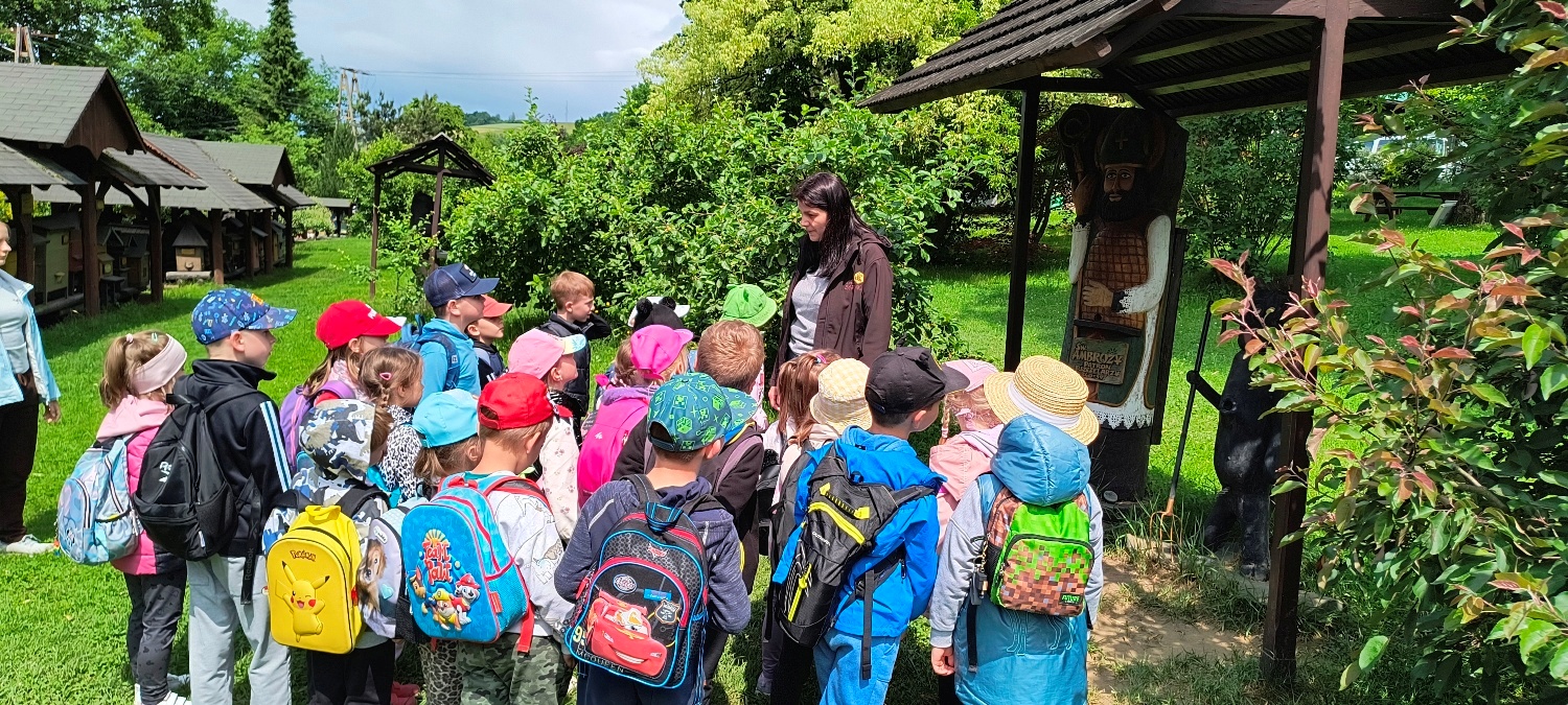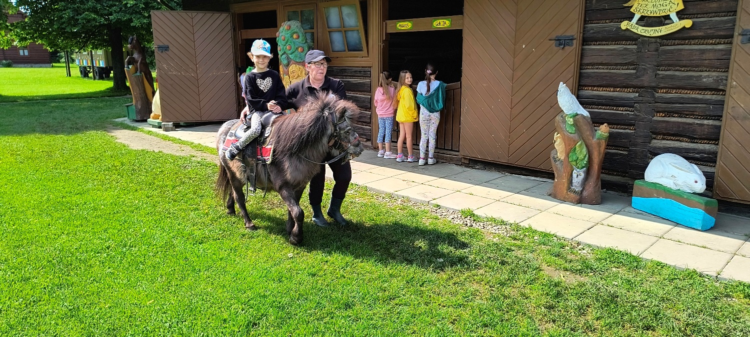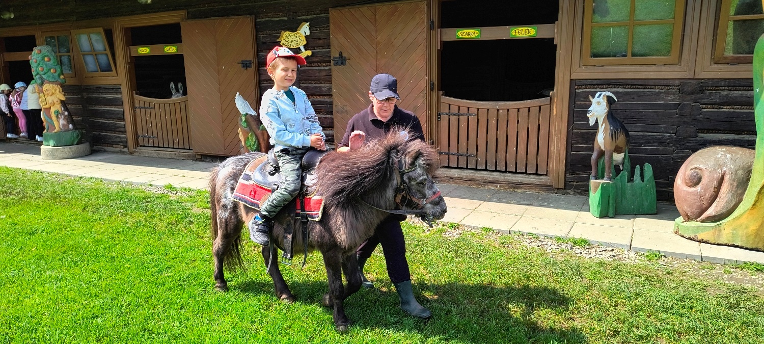 9 maja dzieci z oddziału przedszkolnego „0” udały się na wycieczkę do „Sądeckiego Bartnika” w Stróżach. Tam czekała na nich moc atrakcji! Na początku dzieci odbyły przejażdżkę bryczką konną po najbliższej okolicy, a następnie każdy mógł indywidualnie jeździć na bardzo przyjaznym kucyku. Dla wielu dzieci było to pierwsze spotkanie z konikami. Następnie przedszkolaki karmiły zwierzęta, które znajdują się na terenie Gospodarstwa Pasiecznego oraz oglądały ciekawe okazy domowego ptactwa. Dużą atrakcją było karmienie olbrzymiego stada kóz. Dzieci miały także możliwość skosztowania pysznego sera koziego. Kolejno przedszkolaki obejrzały ciekawy teatrzyk, w którym przybliżono życie pszczół, a następie udały się na spacer z przewodnikiem. Podczas niego przedszkolaki poznały legendę o św. Ambrożym, zobaczyły jak pracują pszczółki oraz kto ma jakie miejsce w ulu, a także miały możliwość zobaczenia uli z dawnych lat. W muzeum została omówiona praca pszczelarza, każdy mógł zobaczyć sprzęty jakimi się on posługuje oraz dowiedzieć się wielu ciekawostek na temat miodu i pszczół. Kolejnym punktem były zakupy pamiątek i miodowych słodkości w sklepiku, a na koniec przyszedł czas na zasłużoną zabawę na placu zabaw. Dzieci pełne nowych wrażeń i doznań wróciły do przedszkola. Polecamy każdemu odwiedzenie „Sądeckiego Bartnika”, bowiem można tam miło, przyjemnie i aktywnie spędzić czas.