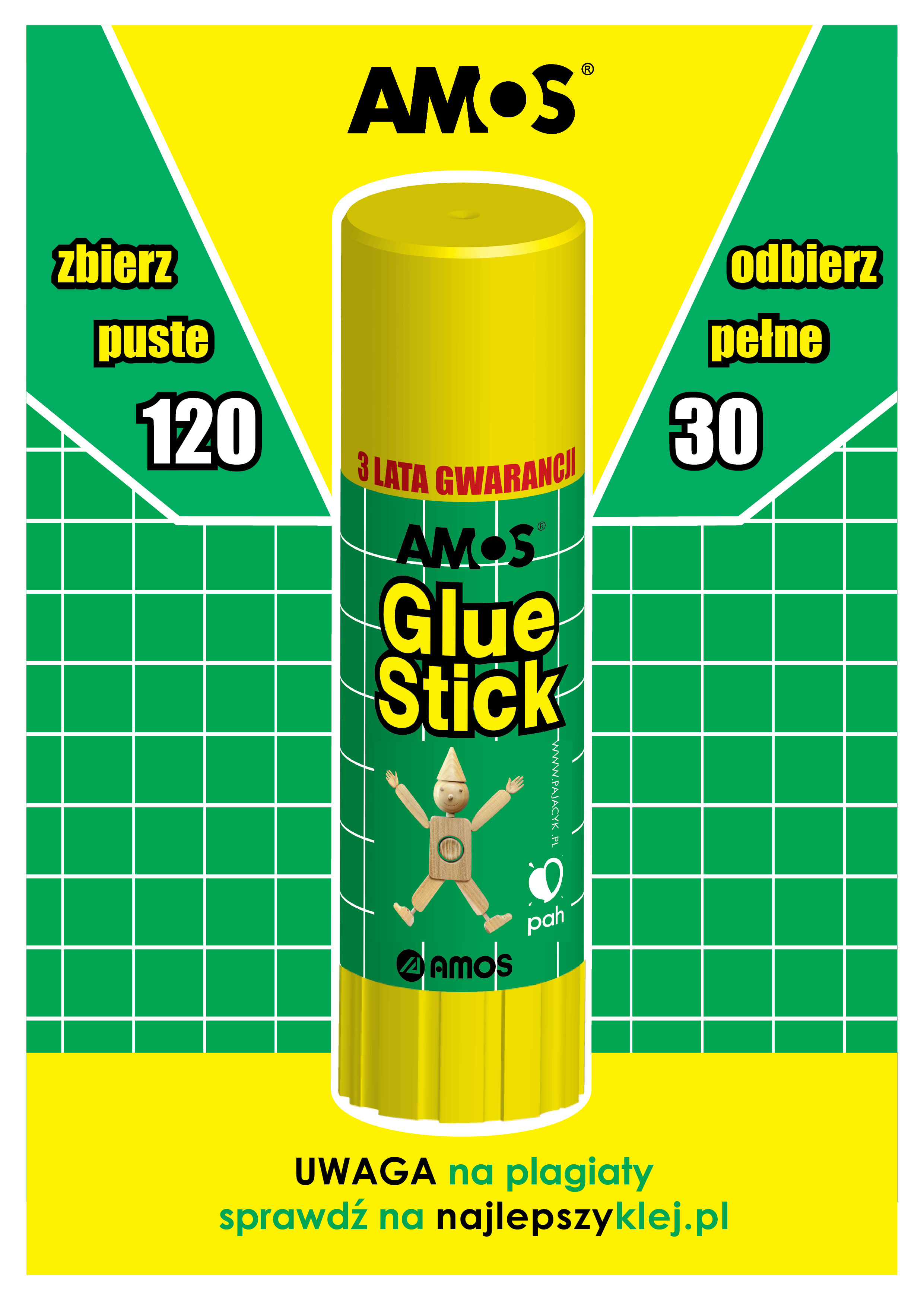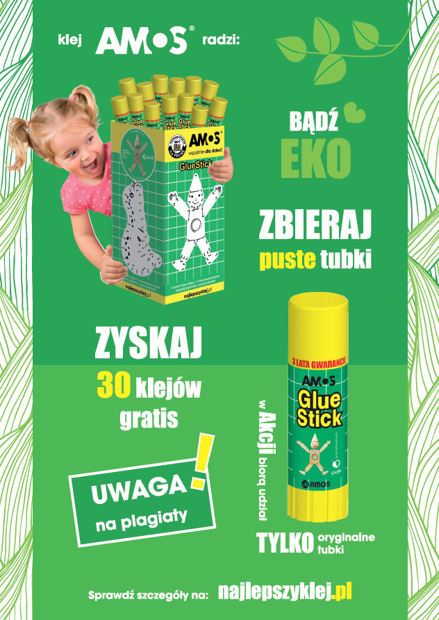 Przez cały rok szkolny zbieramy puste opakowania po kleju Amos GlueStick (zielono-żółte). Zapraszamy wszystkich chętnych do dołączenia do akcji ekologicznej. Jeśli skończyłeś klej Amos – nie wyrzucaj pustego opakowania do kosza, a wrzuć do specjalnego pojemnika, który znajduje się na holu szkolnym przy jadalni. Wspólnie zadbajmy o naszą Ziemię!